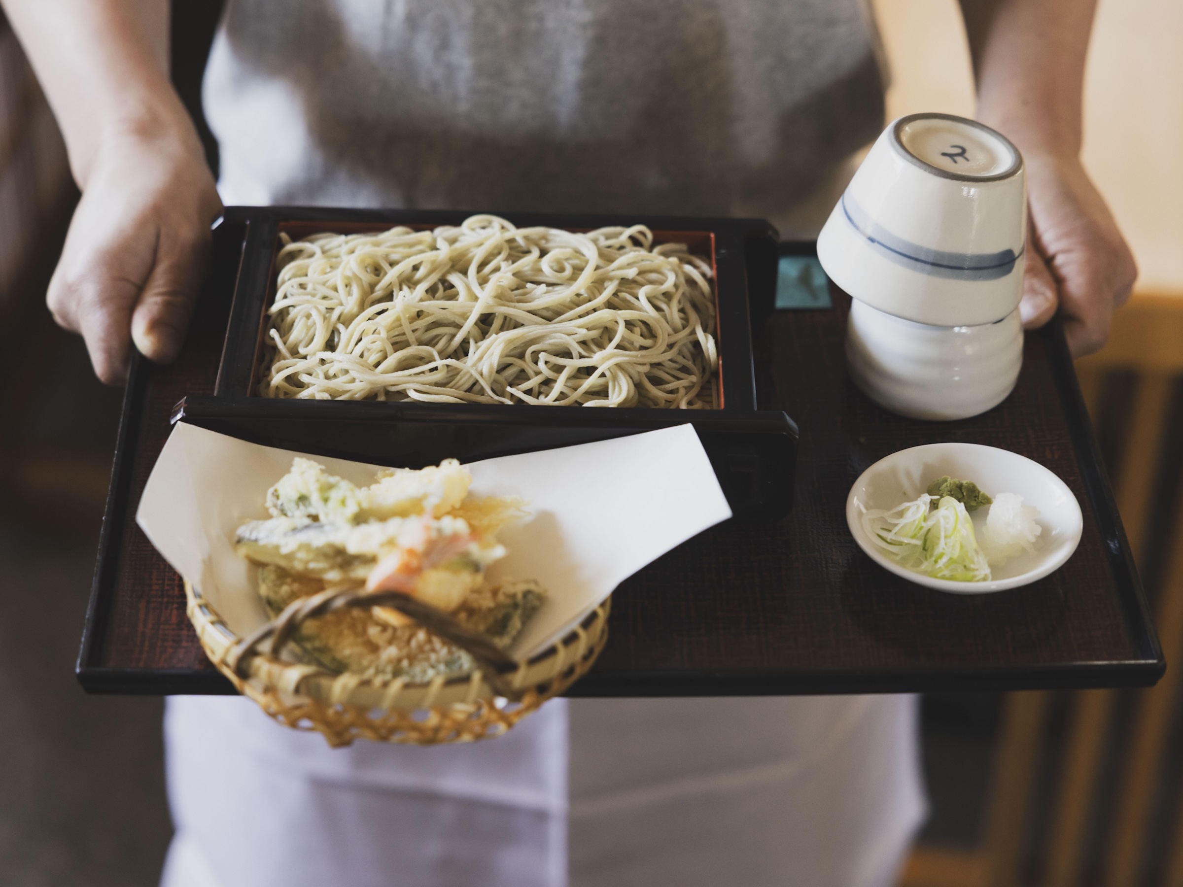 京急の逗子・葉山駅から歩くこと数分、ひっそりとある古民家が、地域の方に愛される蕎麦店「蕎麦 とみず」です。人気のメニューは、海鮮と野菜の揚げたて天ぷらが堪能できる「天ざる」(2,600円)。甘みと香りが高い蕎麦は粗挽きの自家製粉。歯触りも良く蕎麦好きが唸る一品です。