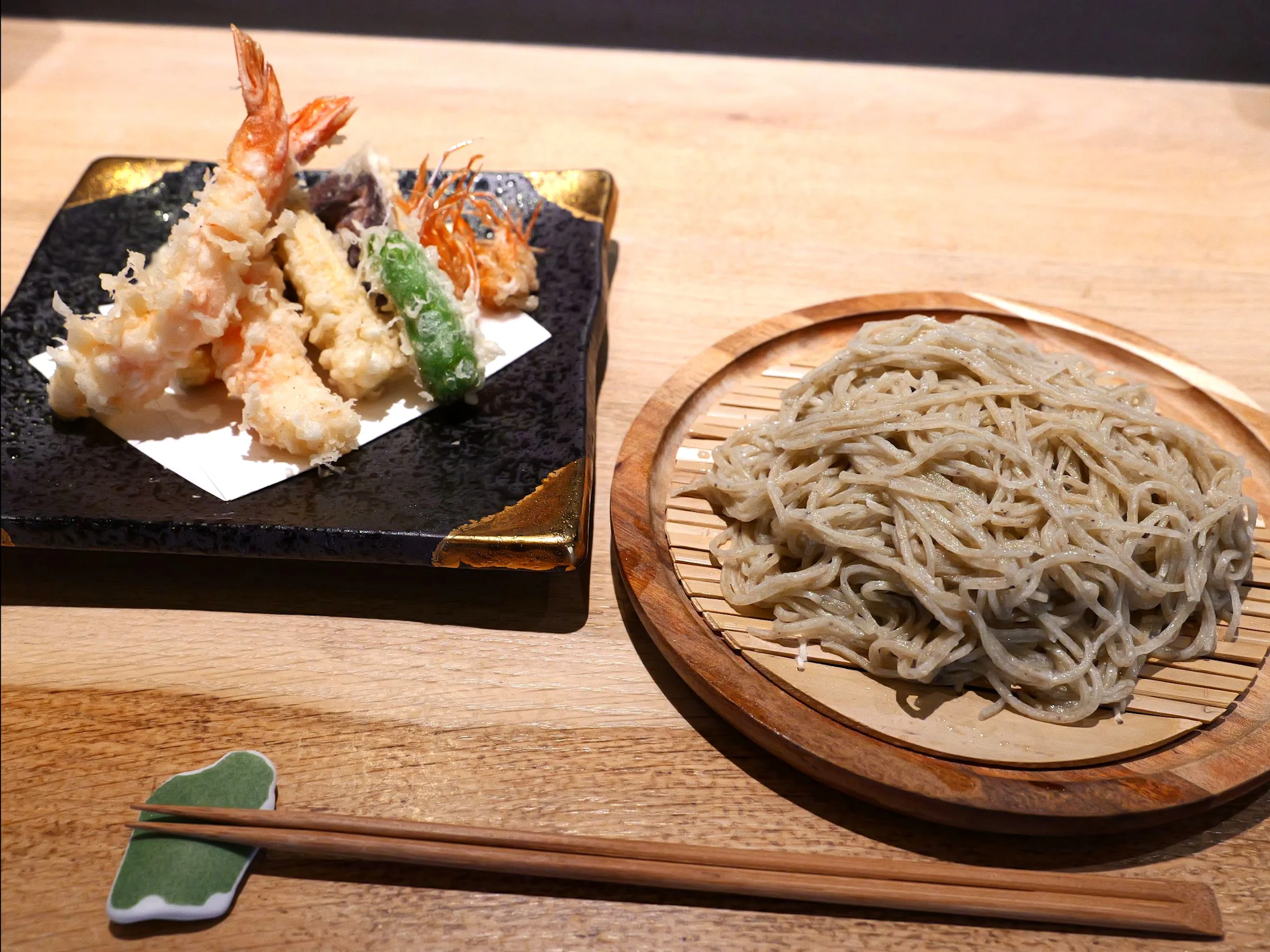 「蕎麦処いしい」で一番人気のメニューは、旬の野菜や地魚の天ぷらを添えた「天せいろ」(1,450円・税込)。天ぷらの衣は薄く、歯を入れるとサクッと小気味の良い音が立ちます。粒度にこだわりながら、きめが細かい小麦粉を使っているため、このサクサク感が生まれるようです。揚げる際はサラダ油にゴマ油を混ぜているので、香ばしさが出て食欲をそそる香りに。