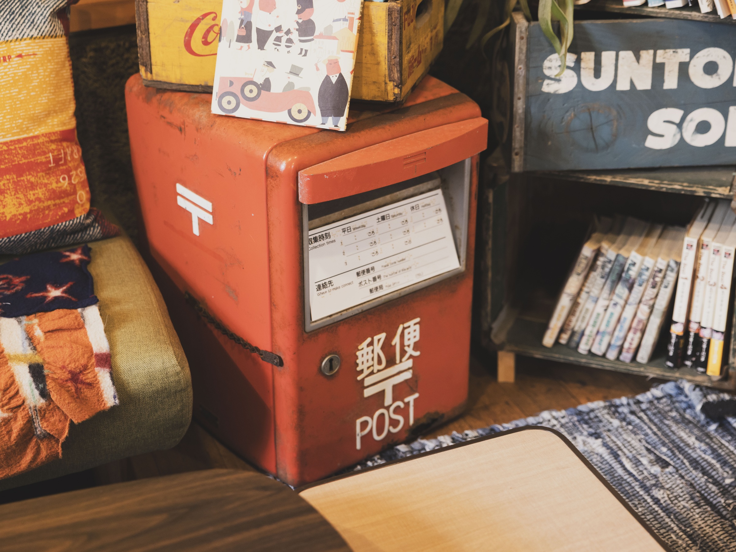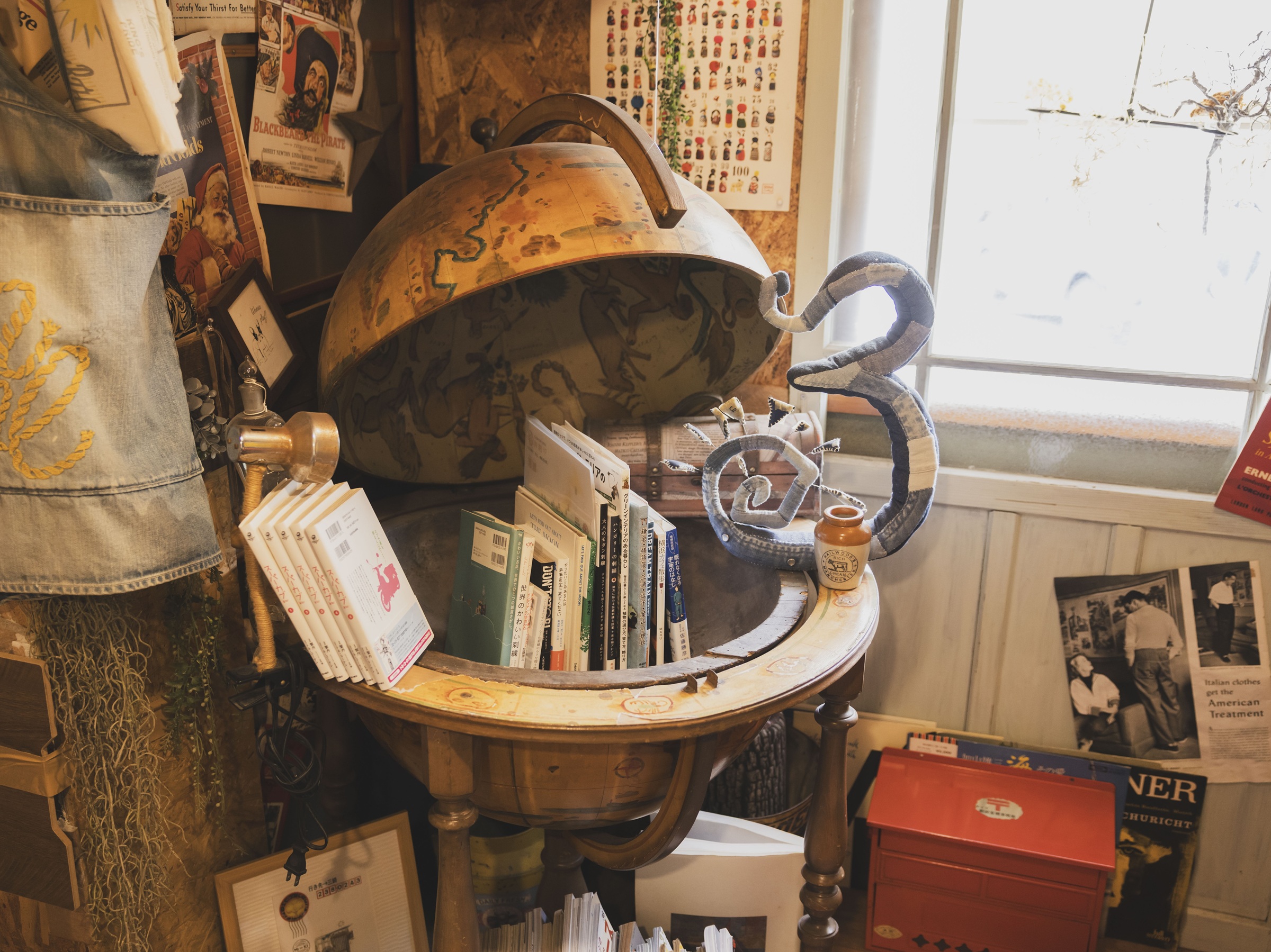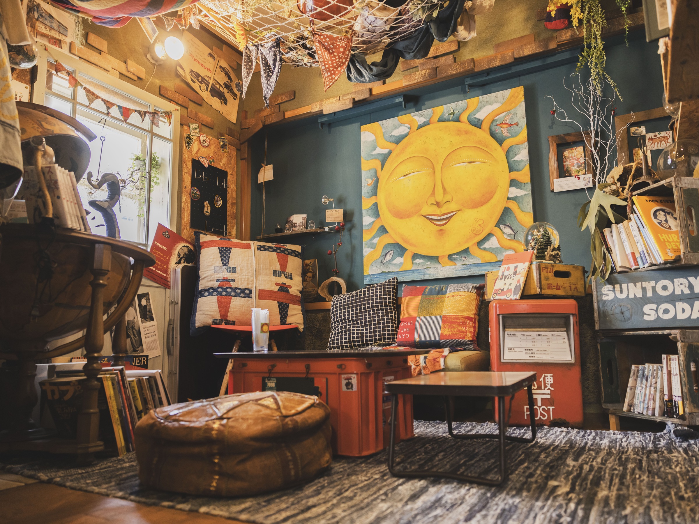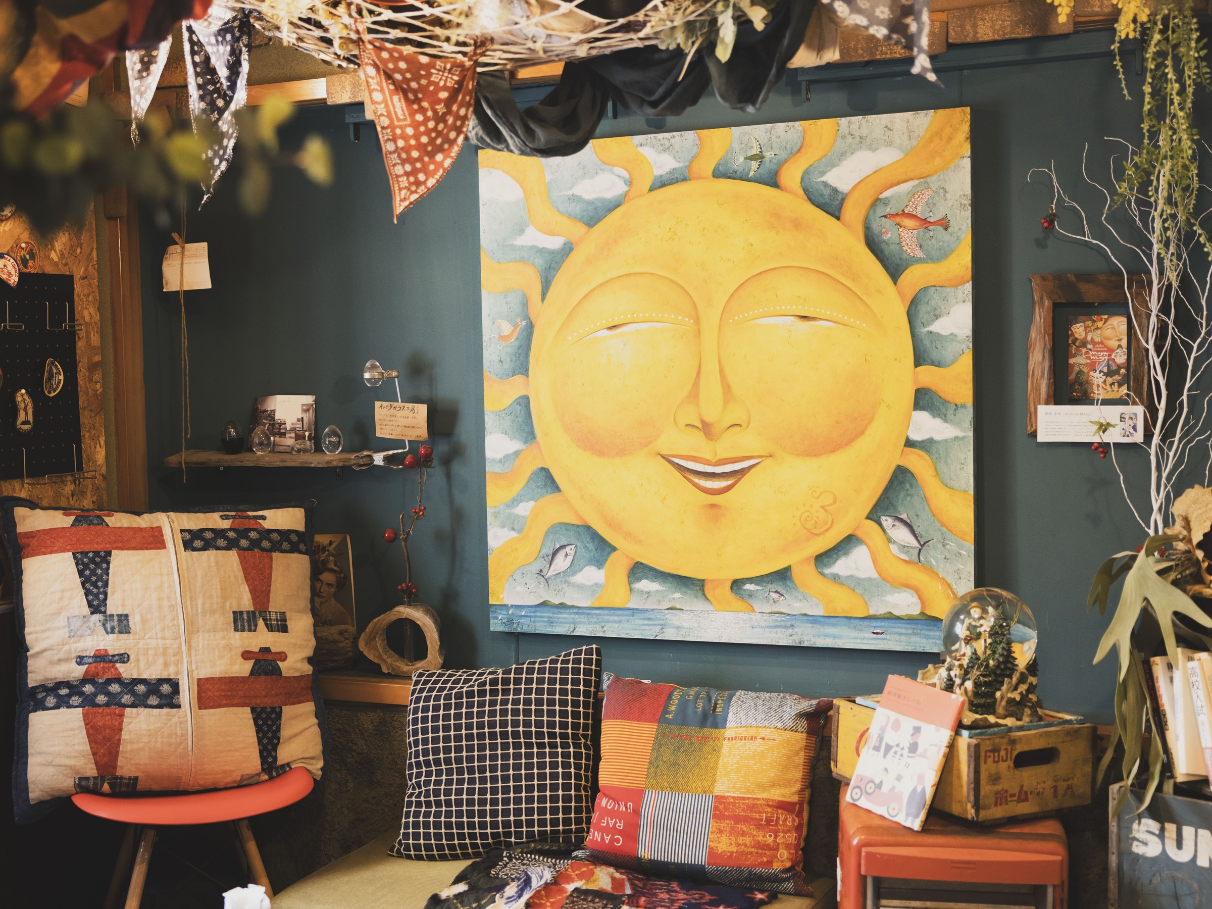 お店の奥を覗くと、ソファーが置かれた小上がりには、目を惹く太陽のアート作品、古道具、本などなど菊地さんのお気に入りの品々が並んでいます。菊地さんによると、元々お店はギャラリーとしてオープンし、軽食の販売は一切考えていなかったようです。