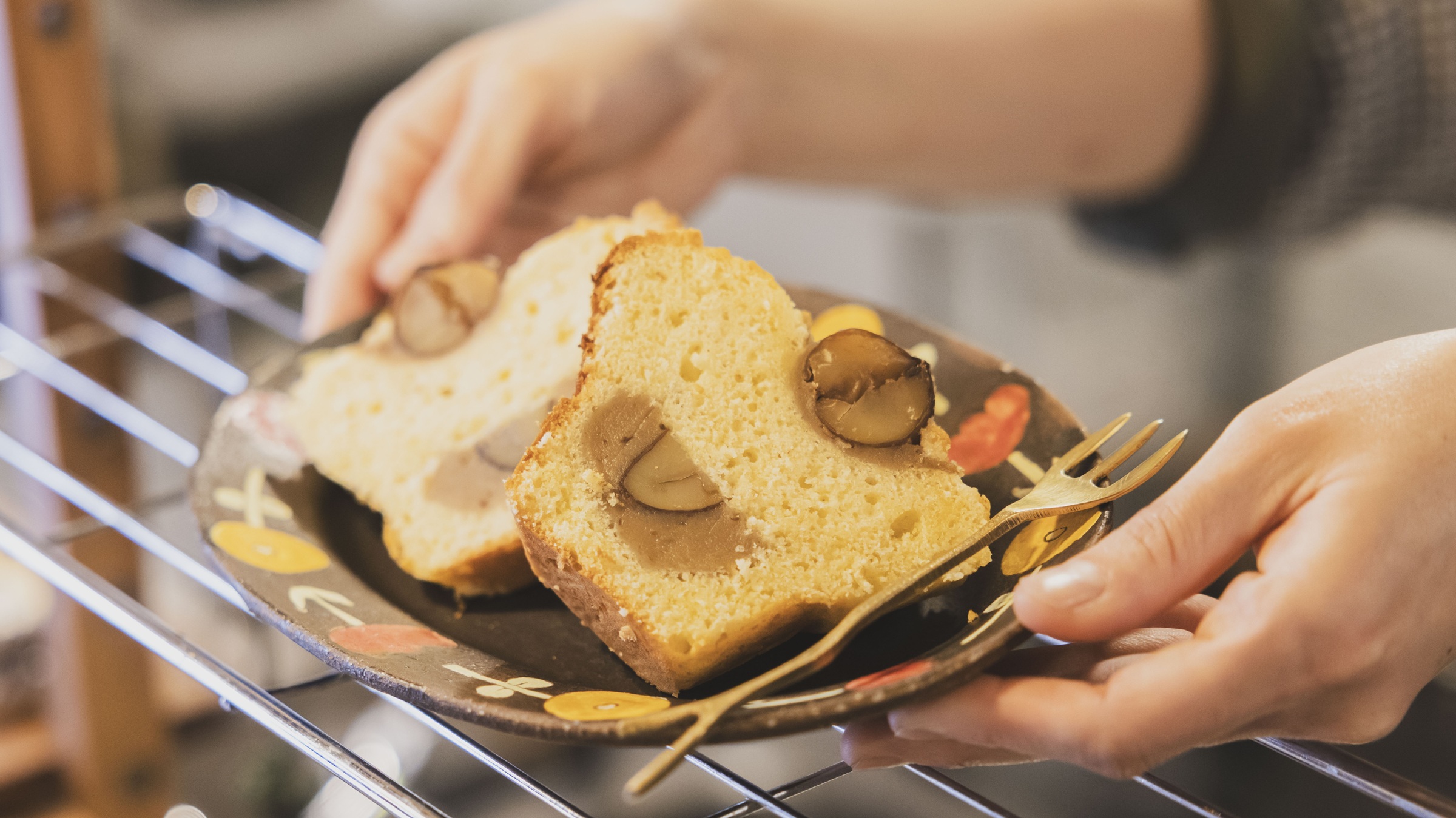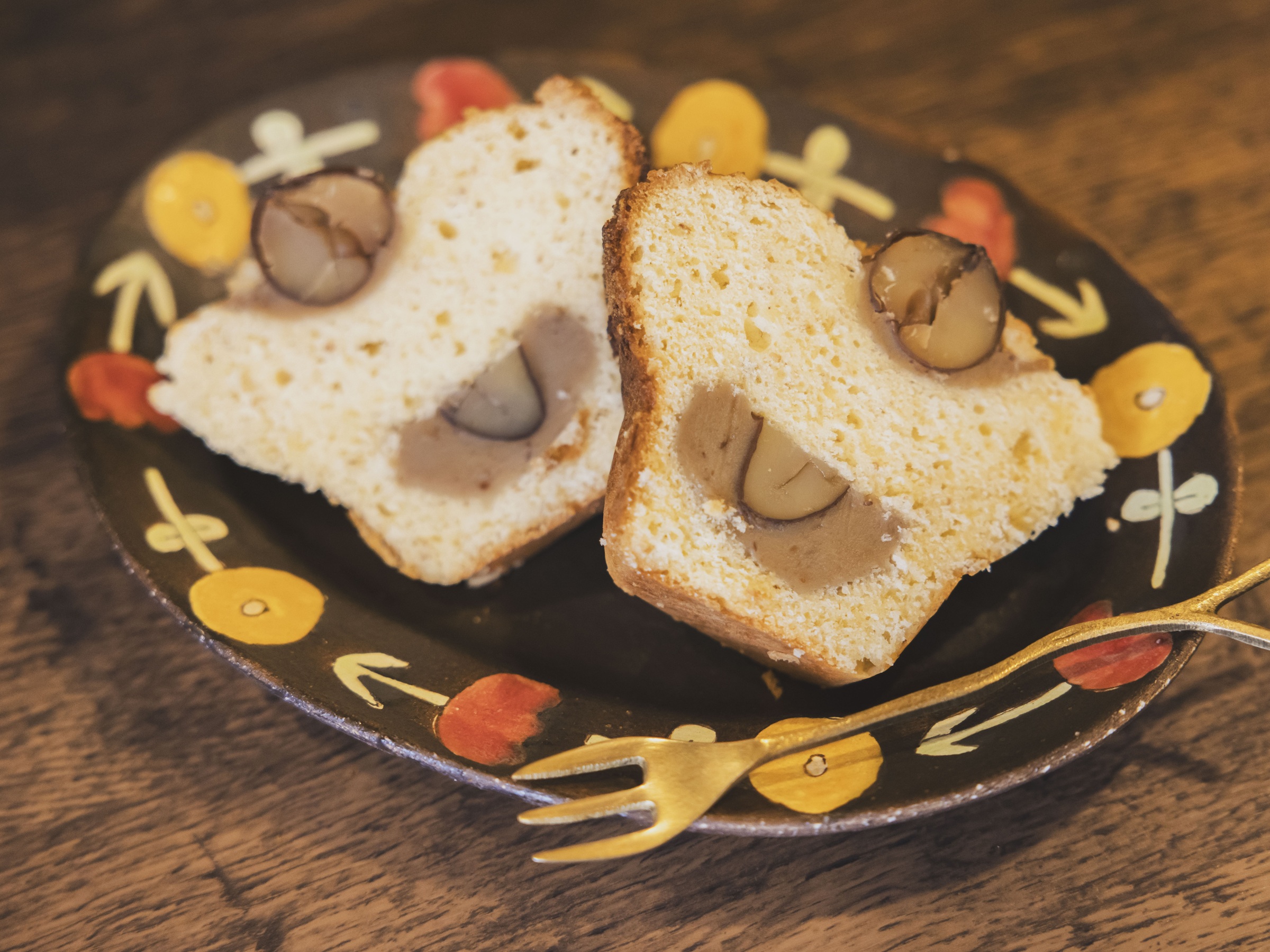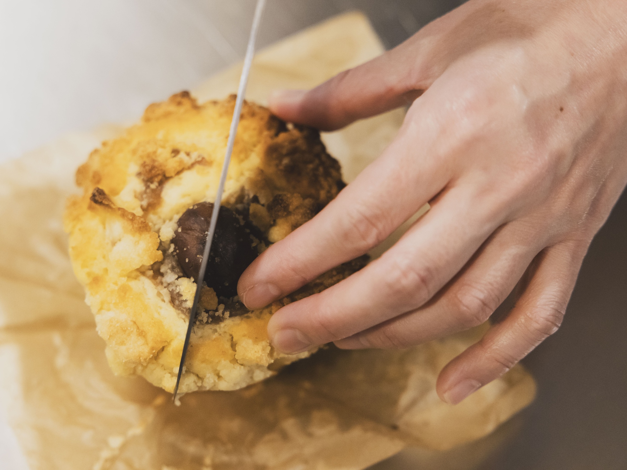 お店で食べるときは少し温めて、半分にカットした状態で提供されます。断面に現れたのは、“企業秘密”という渋皮のモンブラン・クリームとシロップ漬けの栗。甘さ控えめで、しっとりとしたマフィン生地とまろやかなクリームが溶け合い、幸せが口いっぱいに広がります。