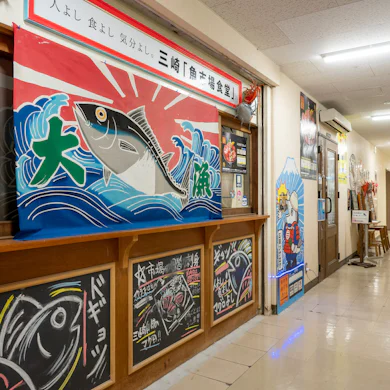 三崎水産物地方卸売市場の2階にある「魚市場食堂」。魚市場のすぐ上に位置する“市場直結”のお店だけに、「三崎市場の特選海鮮丼」(2,000円)や「市場の日替わり刺身と焼き魚定食」(1,800円)など、海の幸を新鮮な状態のまま提供するメニューが評判です。