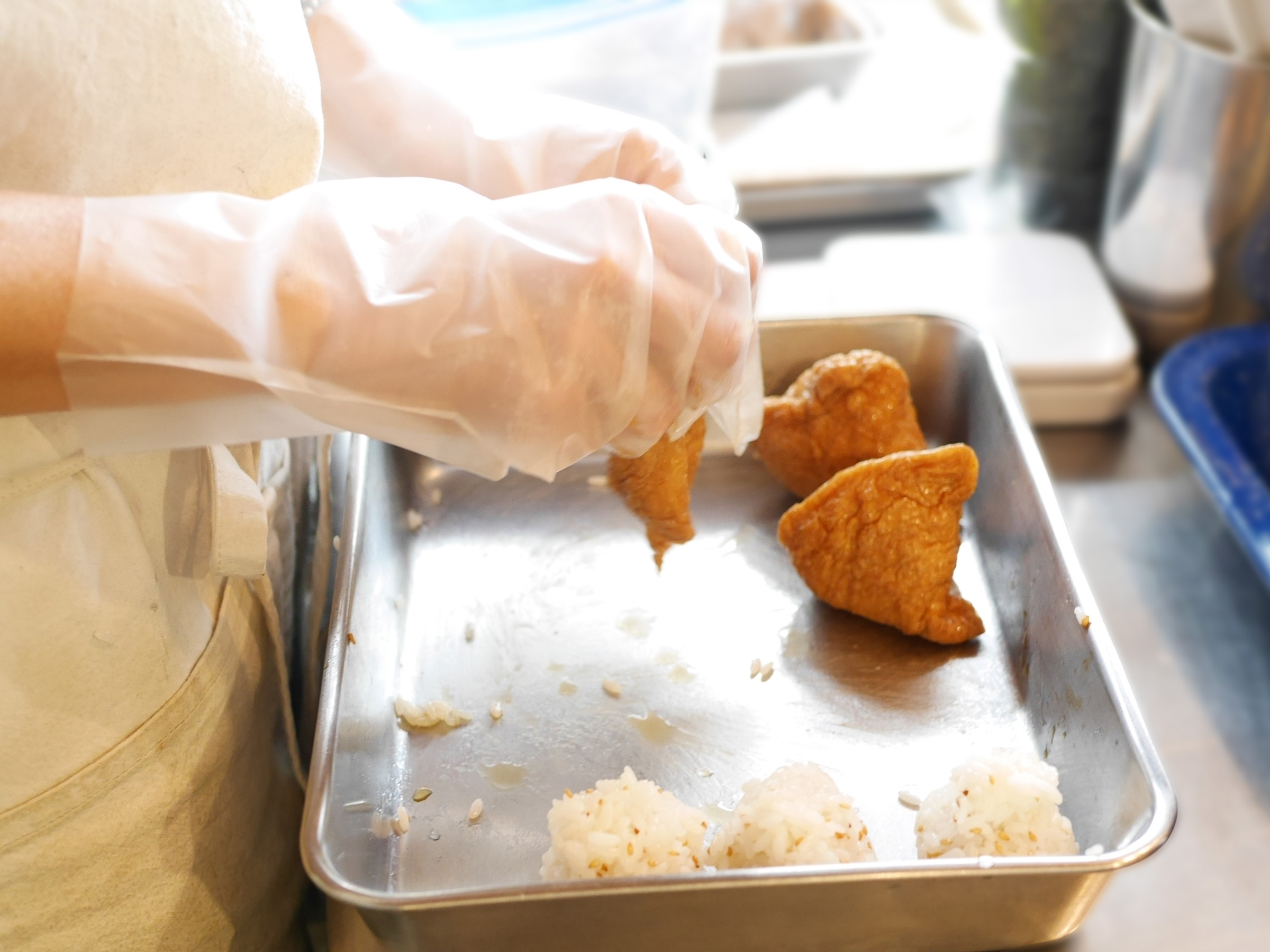 厚みや柔らかさに個体差がある手揚げを、一つずつ丁寧に包むのも、井上さんと気心知れたスタッフの方の手仕事ならでは。口に含めば、ご飯と揚げがふんわりと一体になり、心も満たされる味わいです。