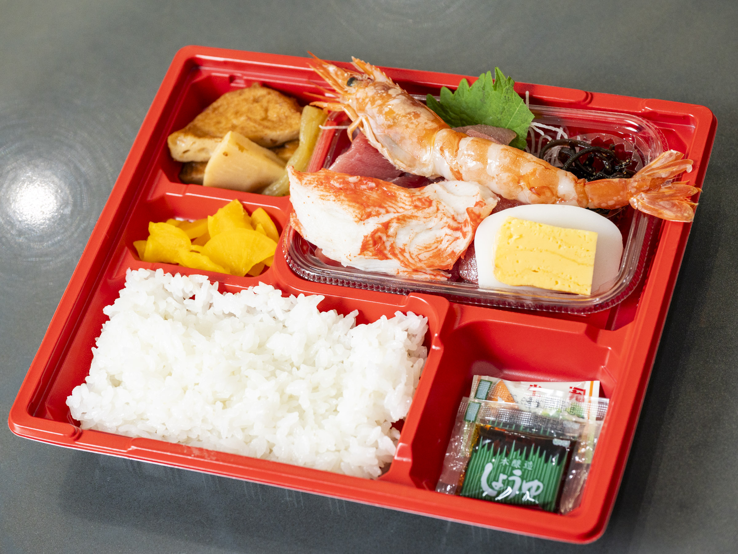 ここで密かに人気を集めているのが、脂がのった本マグロとプリプリの赤海老がたっぷり詰まった「刺身弁当」(1,000円)。