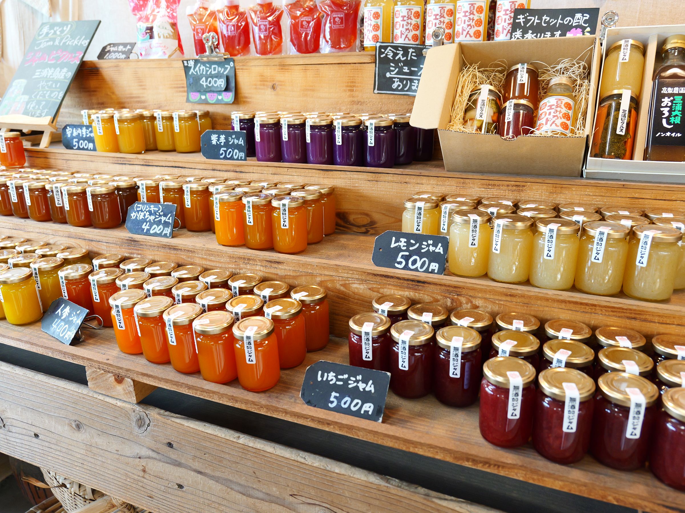 色鮮やかなこの棚に陳列されているのは、とうもろこし、人参、いちご、かぼちゃなどでつくった無添加のジャム(400~500円)です。