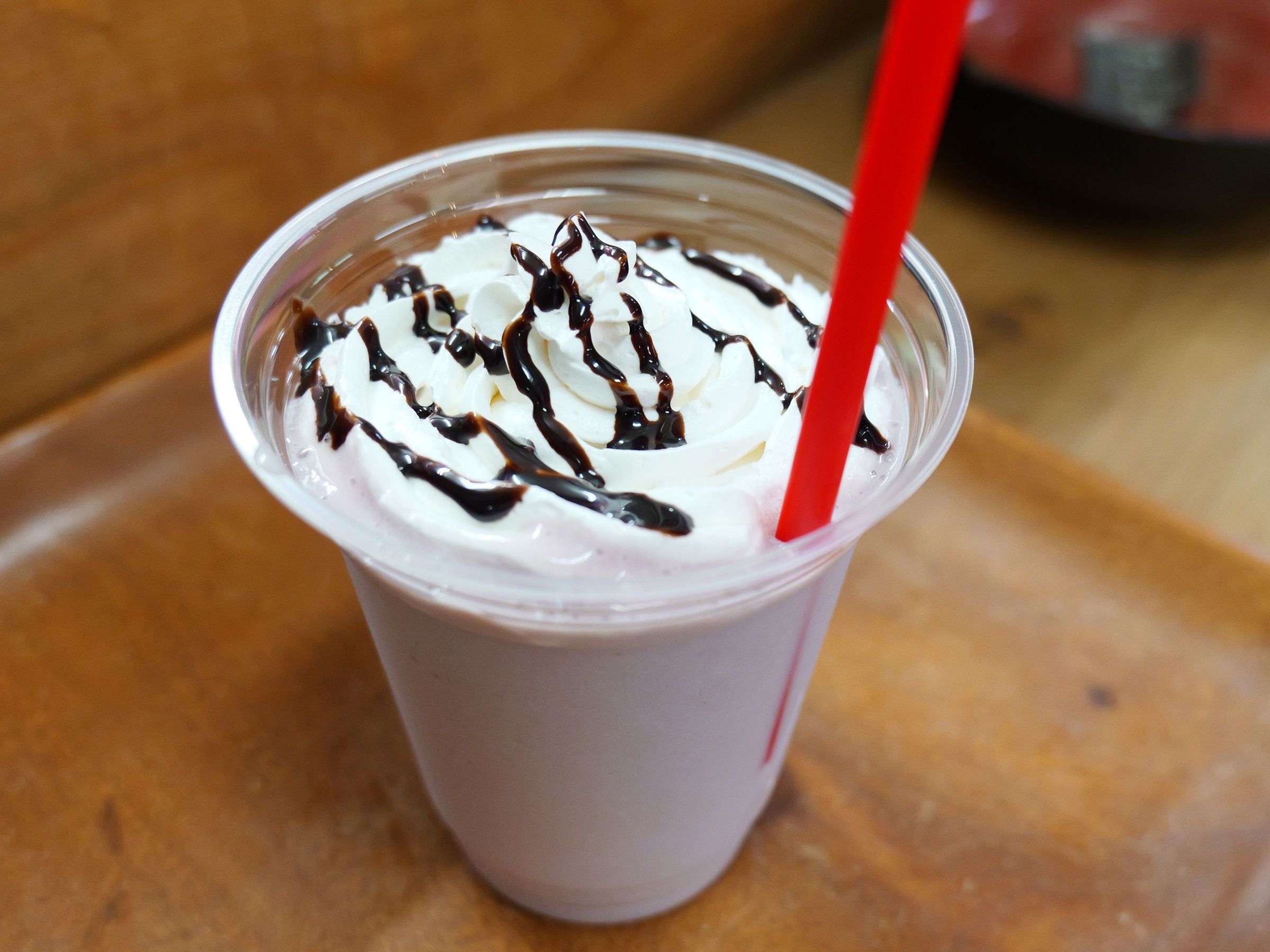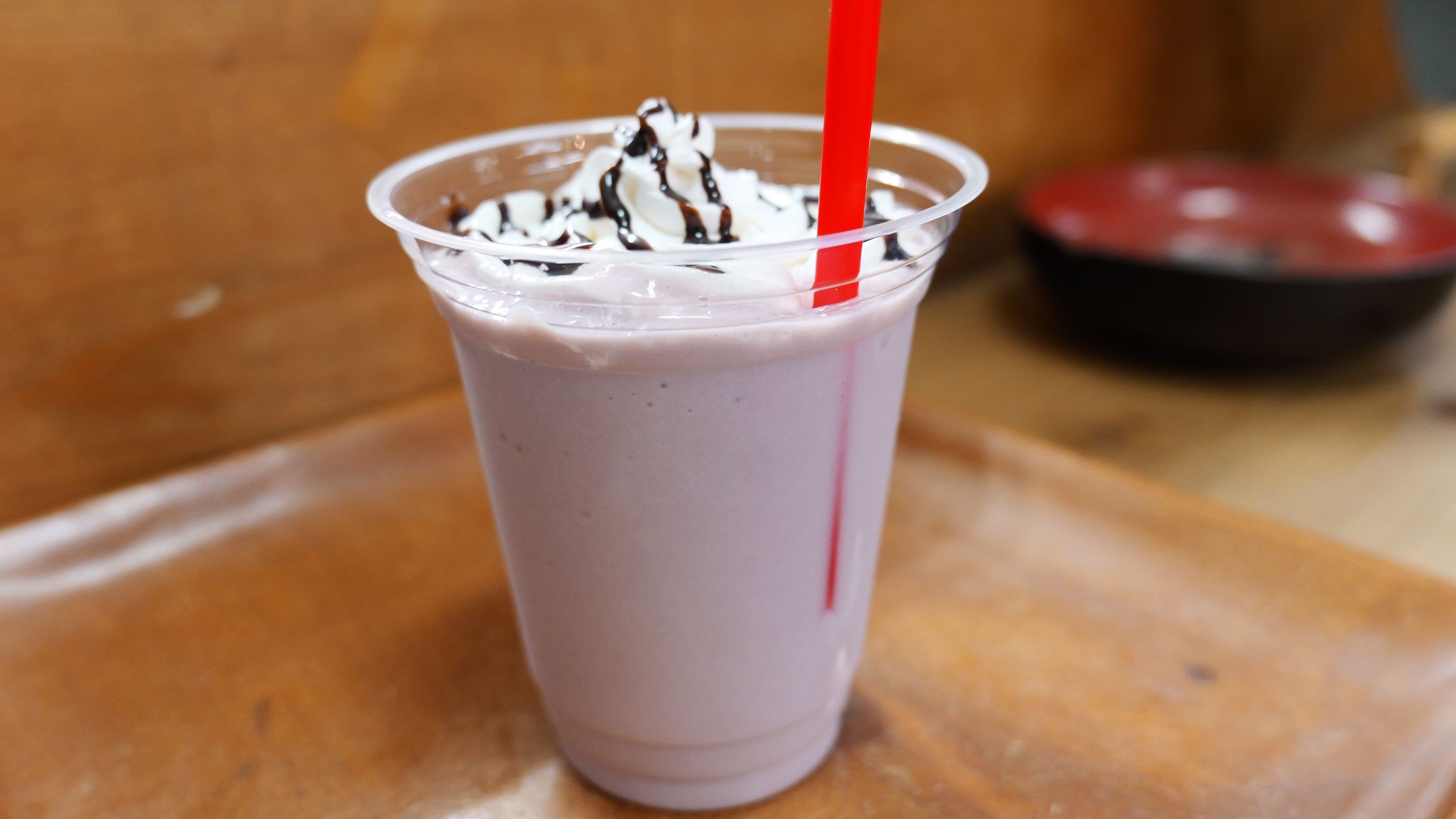 そんな三浦野菜の甘みを存分に満喫できるのは、秋~冬に提供される季節限定メニュー「紫芋シェイク」(600円)。紫芋を裏ごししてシェイクし、生クリームを載せてチョコをまぶしたらでき上がり!
