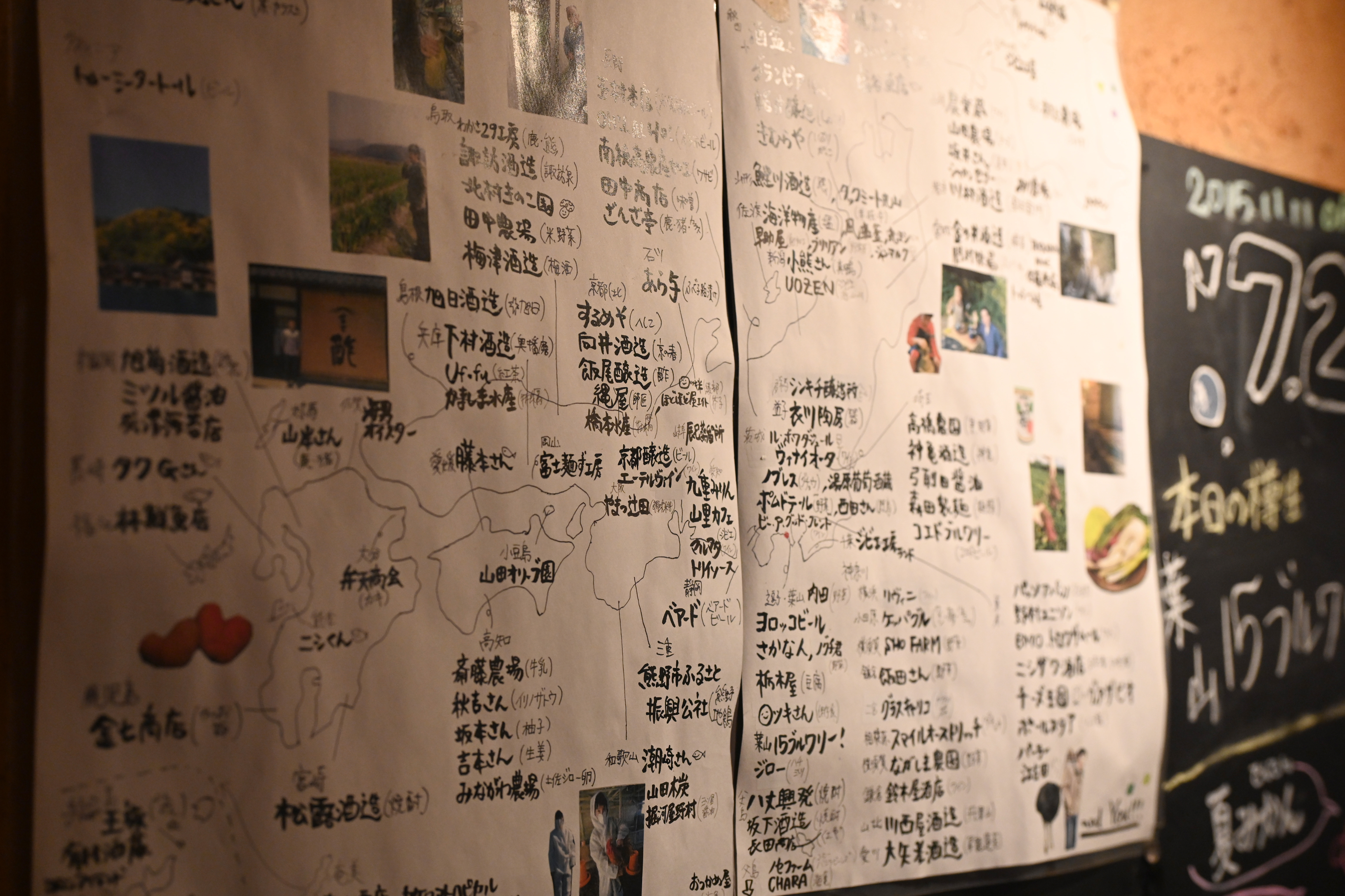 自他ともに認める“食材おたく”の天野さん。調味料からお酒まで興味の沸いた人やモノがあると、持ち前のフットワークとコミュニケーション力で間口の狭い生産者とも繋がり、その輪をどんどん広げています。店内に貼られた、取引のある生産者さんをマッピングした日本地図も興味深く見入ってしまいます。