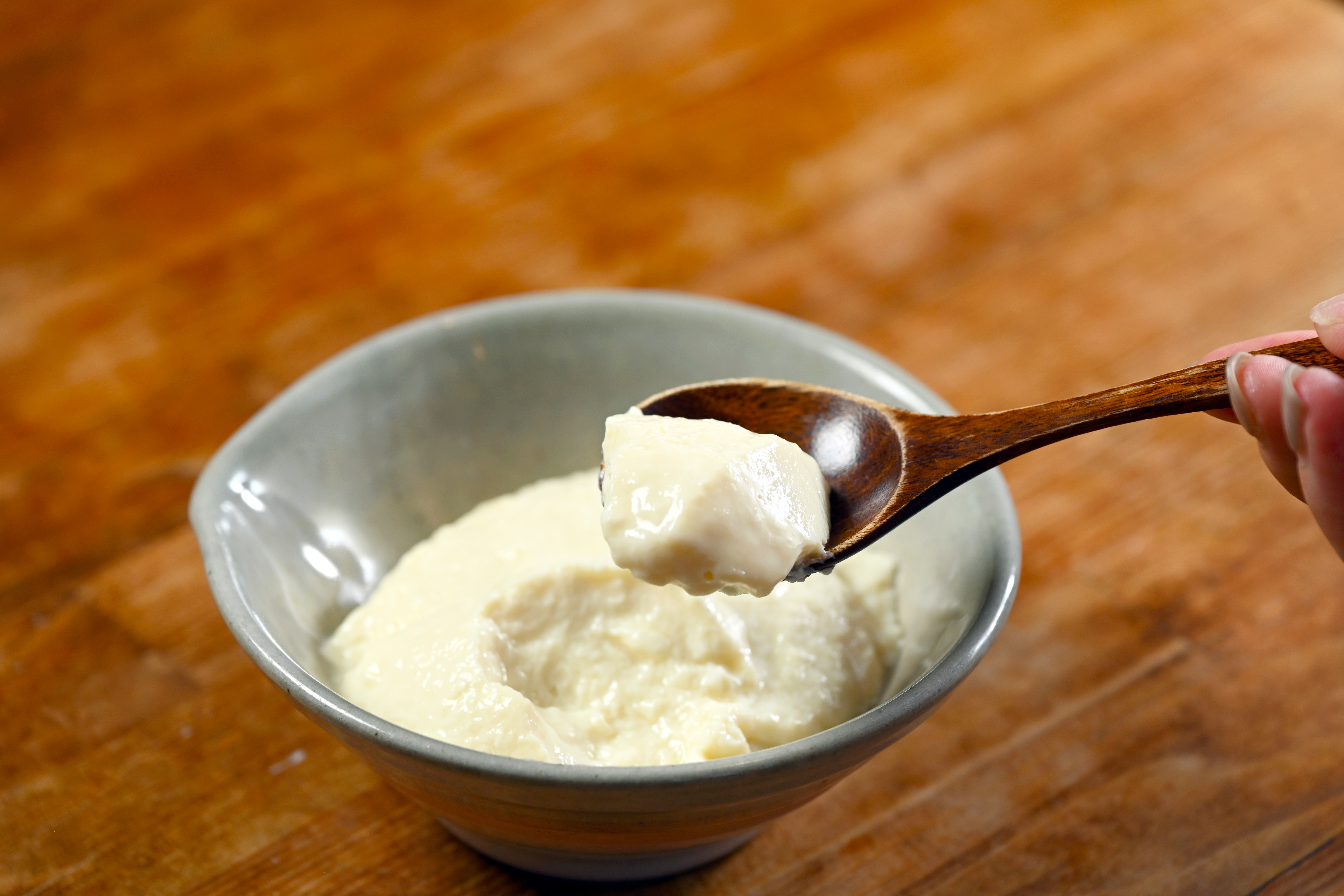 「加計呂麻島の塩作りを見学した際に思いついたレシピなんです。海水を煮詰めた過程(海水とにがりの中間)の液体を使ったら、沖縄のゆし豆腐よりしっかりめの豆腐ができるのでは?と。そこの製塩所にお願いして作ってもらっている濃縮海水と、逗子の老舗豆腐店『とちぎや』の豆乳を海水で固めて作っています」