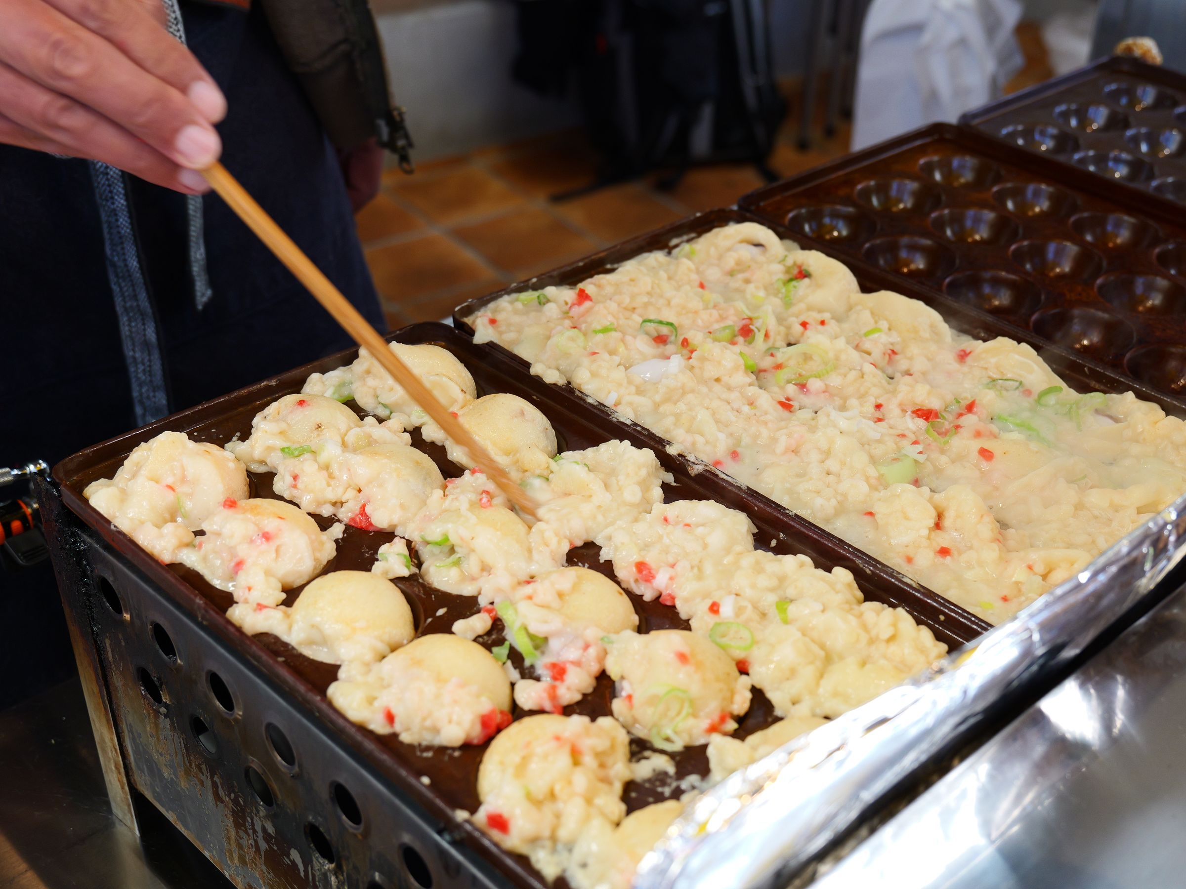 たこ焼きの具材は、タコ、天かす、ネギ、紅ショウガ。やわらかな生地を菜箸で器用にひっくり返しながら焼き上げます。