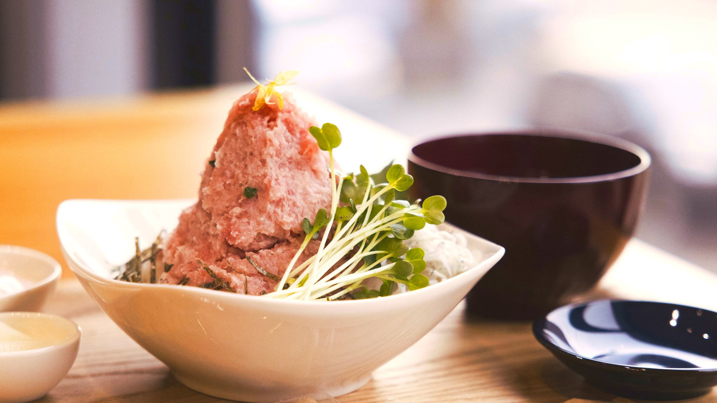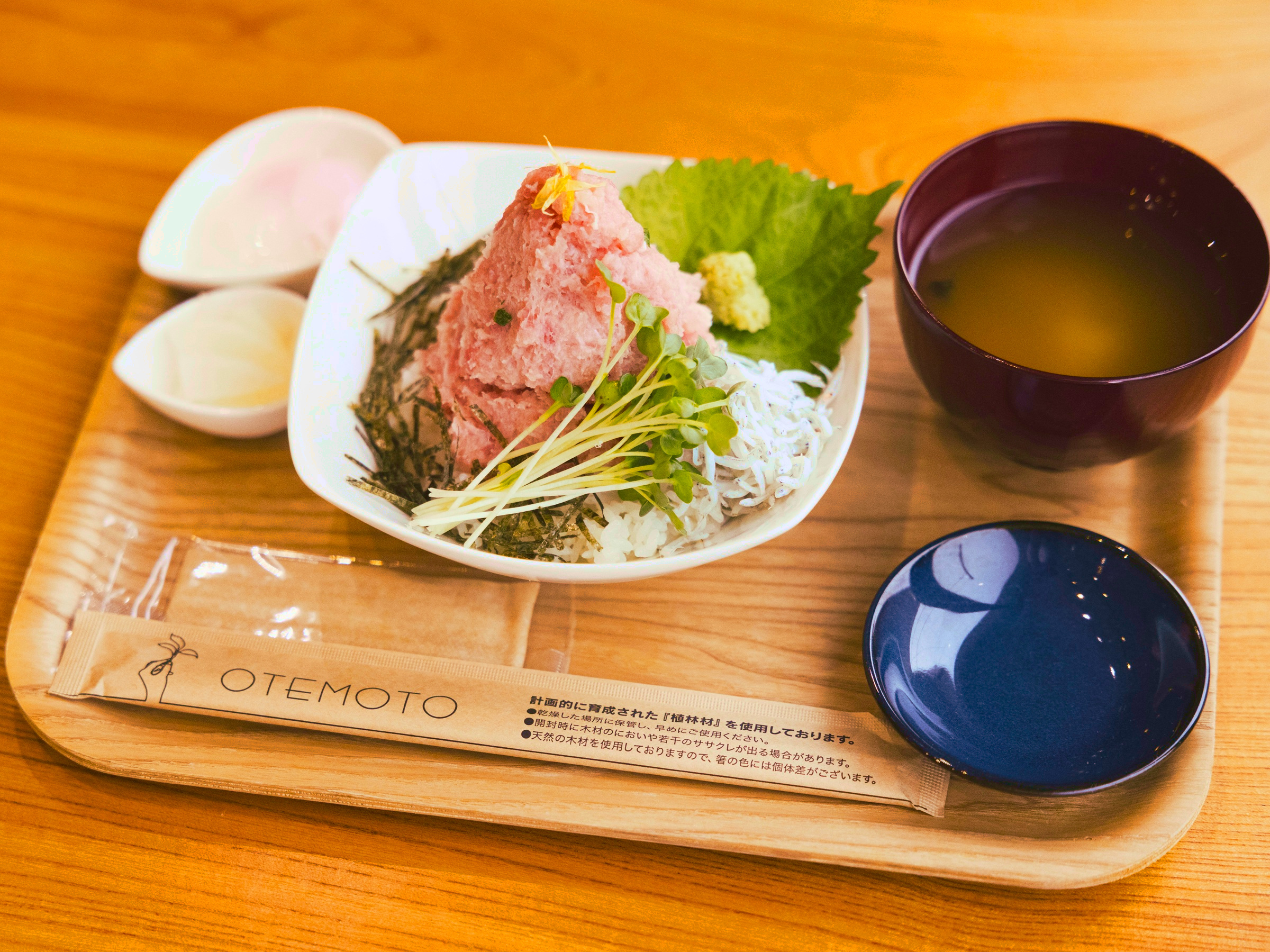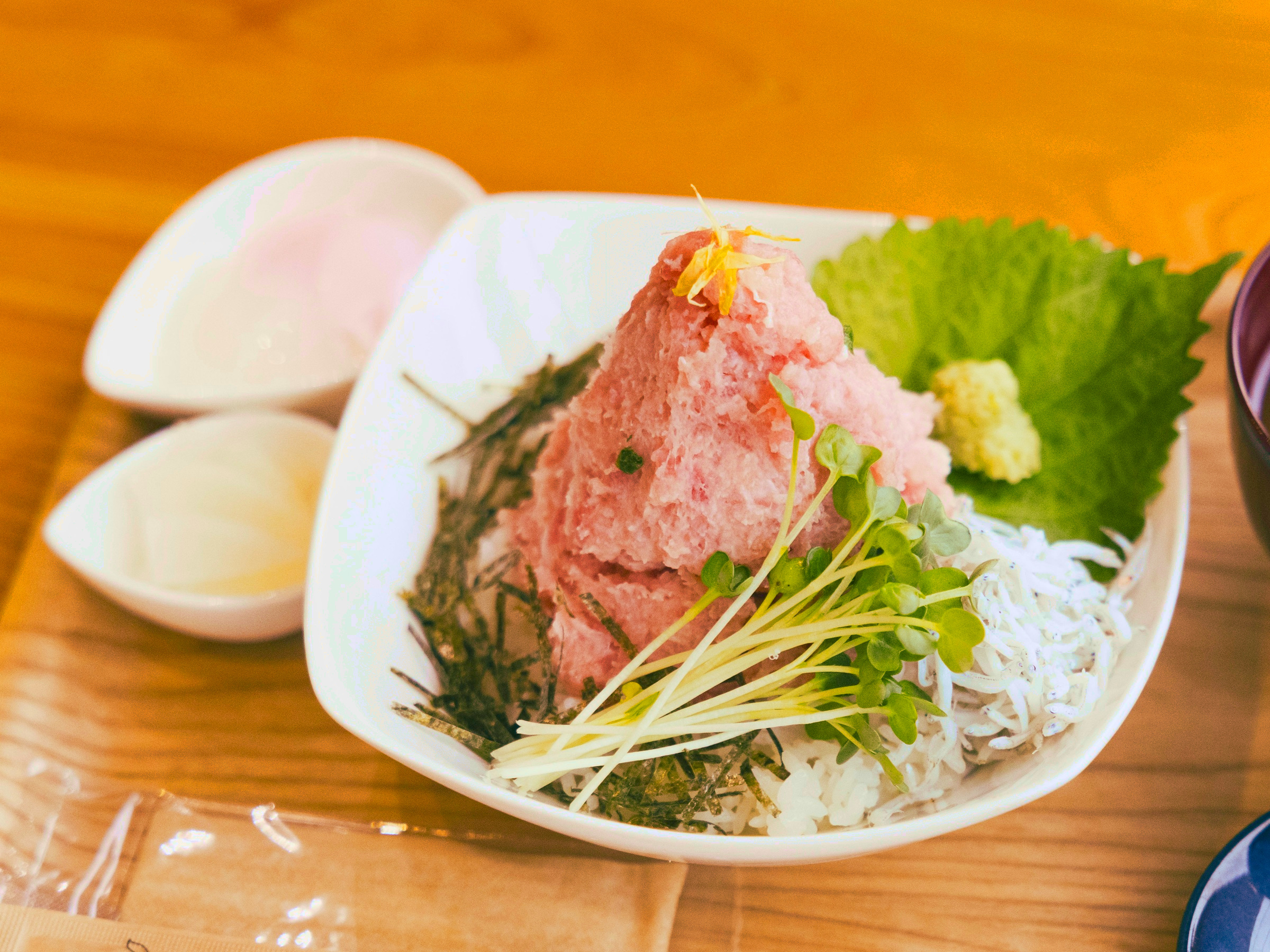 丼の上に山のように乗せられたネギトロは、ねっとりとした濃厚な味わい。付属の温泉卵を乗せて絡ませれば、ごはんが足りなくなるほど。男性でも満腹になること間違いなしのボリュームです。