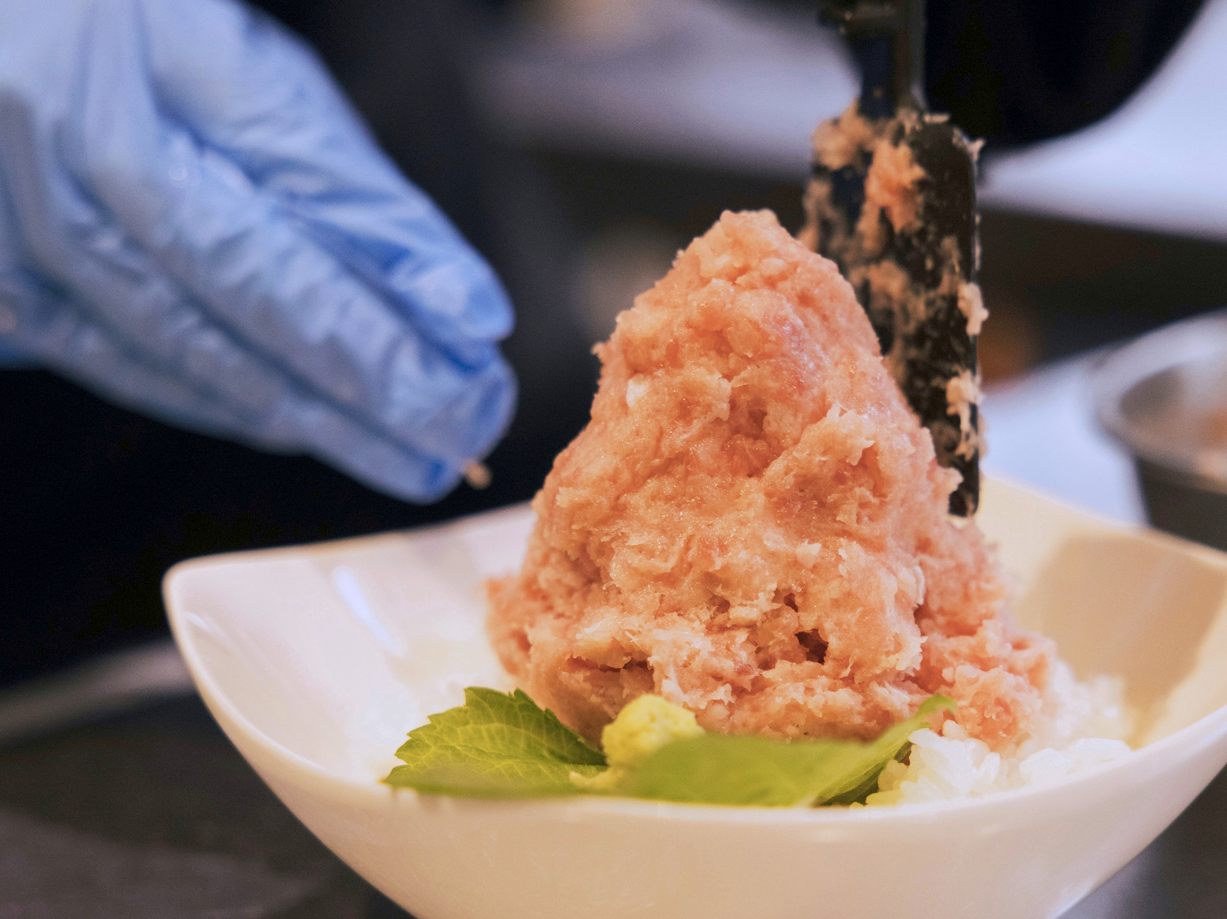 この「ネギトロタワー丼」には、三崎のマグロ問屋から仕入れたアフリカ・ケープタウンなどのいわゆる特殊漁場で獲れる希少なマグロが使われています。極寒で波が荒いケープタウン沖は、本マグロで有名な青森・大間と似たような環境で、そこを泳ぐマグロの脂ののりは抜群だと、オーナーの吉井豊さんが話してくれました。