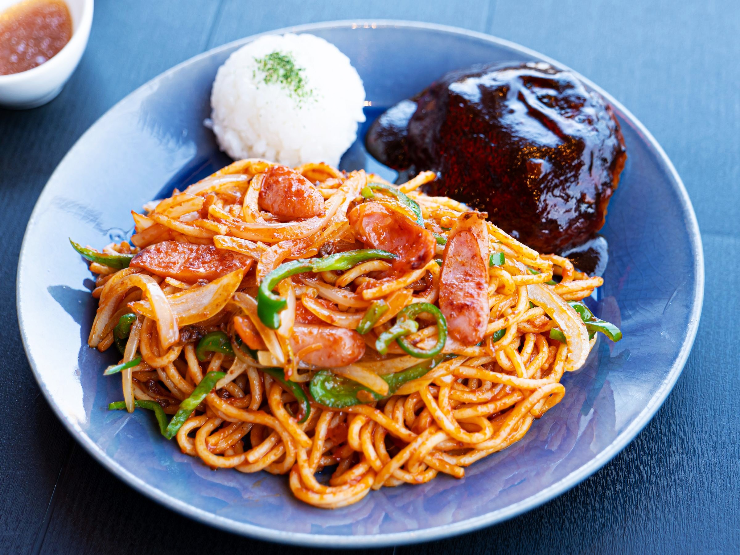 適度な酸味と甘みがバランスよく中太麺に絡み、どこか懐かしさも感じるナポリタンでした。一緒に盛り付けられているのは、2番人気のハンバーグ。ツヤツヤの濃厚なソースがかかっており、ふわふわの食感。口の中でほろりと肉の塊が崩れていきます。なんとも贅沢な組合せです。