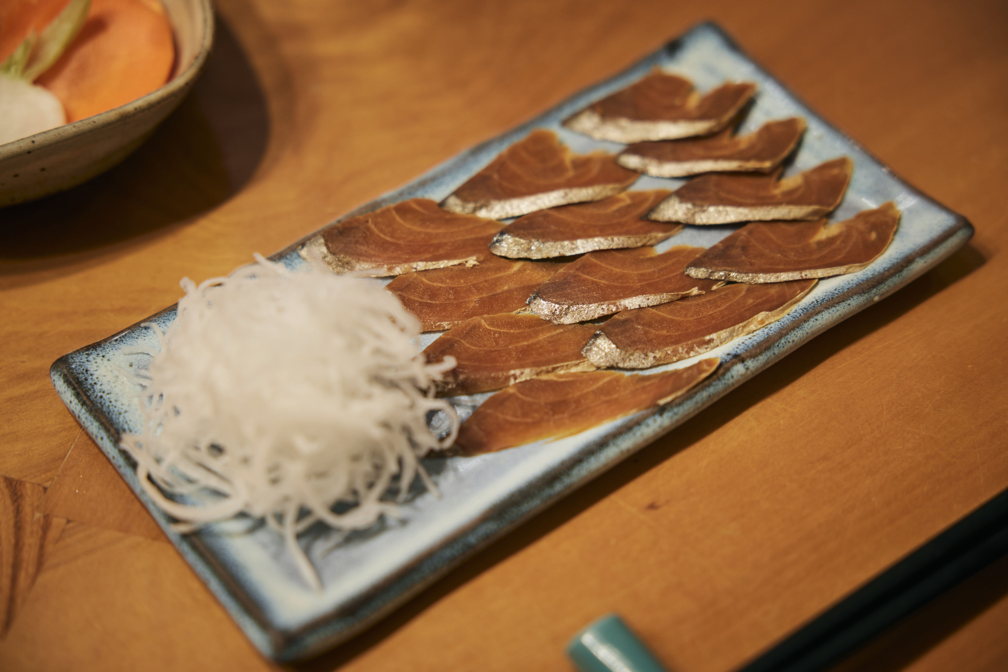 そして、福井の珍味「鯖のへしこ」(830円)もお酒と一緒にぜひ味わいたい酒肴のひとつ。鯖を塩と米ぬかに漬け込んで旨みを凝縮させた福井県の代表的な発酵食品です。しょっぱさと旨みがあとを引いてついついお酒が進んでしまいます。