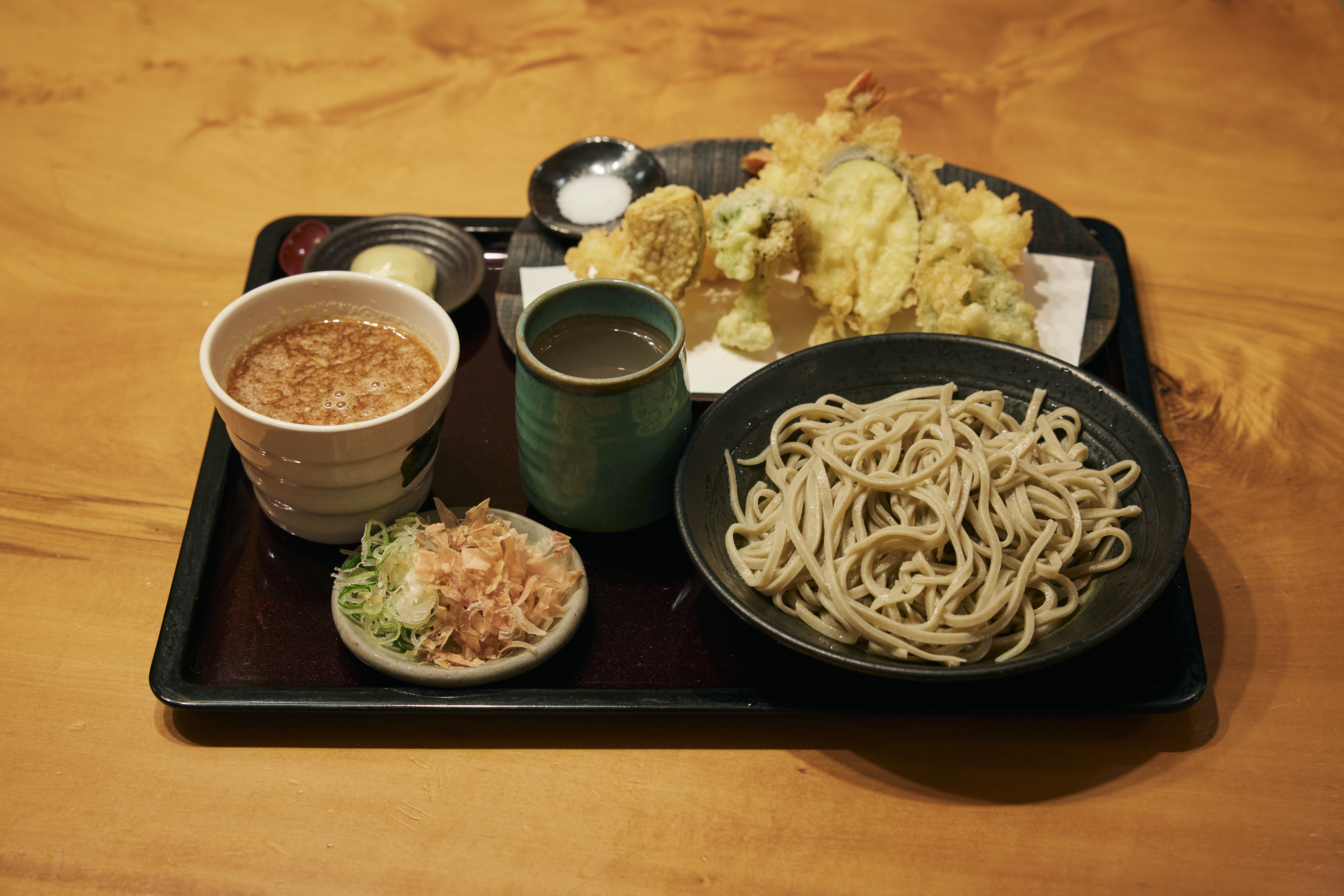 お蕎麦屋さんに来たら天ぷらも味わいたいもの。一番人気の「天ぷらおろしそば」1,690円に付く、海老や旬野菜の天ぷらをつまみにもう一杯。サクッと軽い揚げ加減も熟練の職人技が光ります。大根おろしがたっぷり入ったそばつゆと天ぷらも絶品!