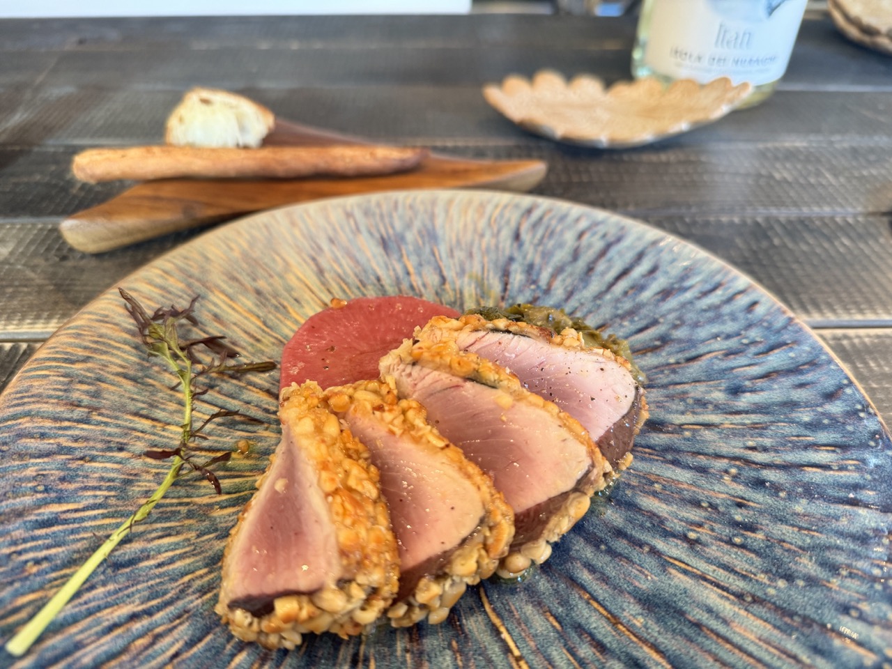 この日のメインのお魚料理は佐島のメジマグロ。松の実を衣にしたソテーでいただきます。
