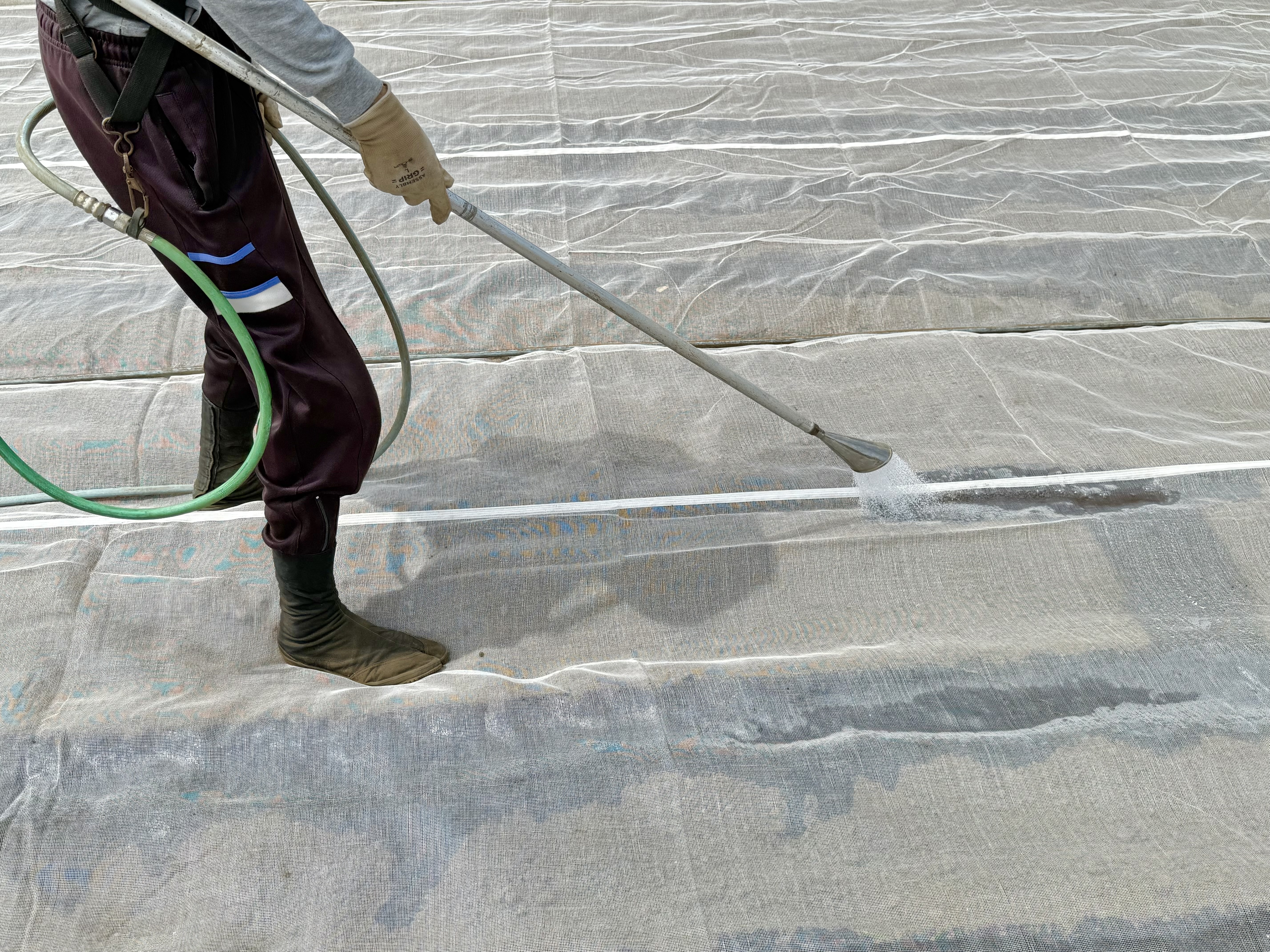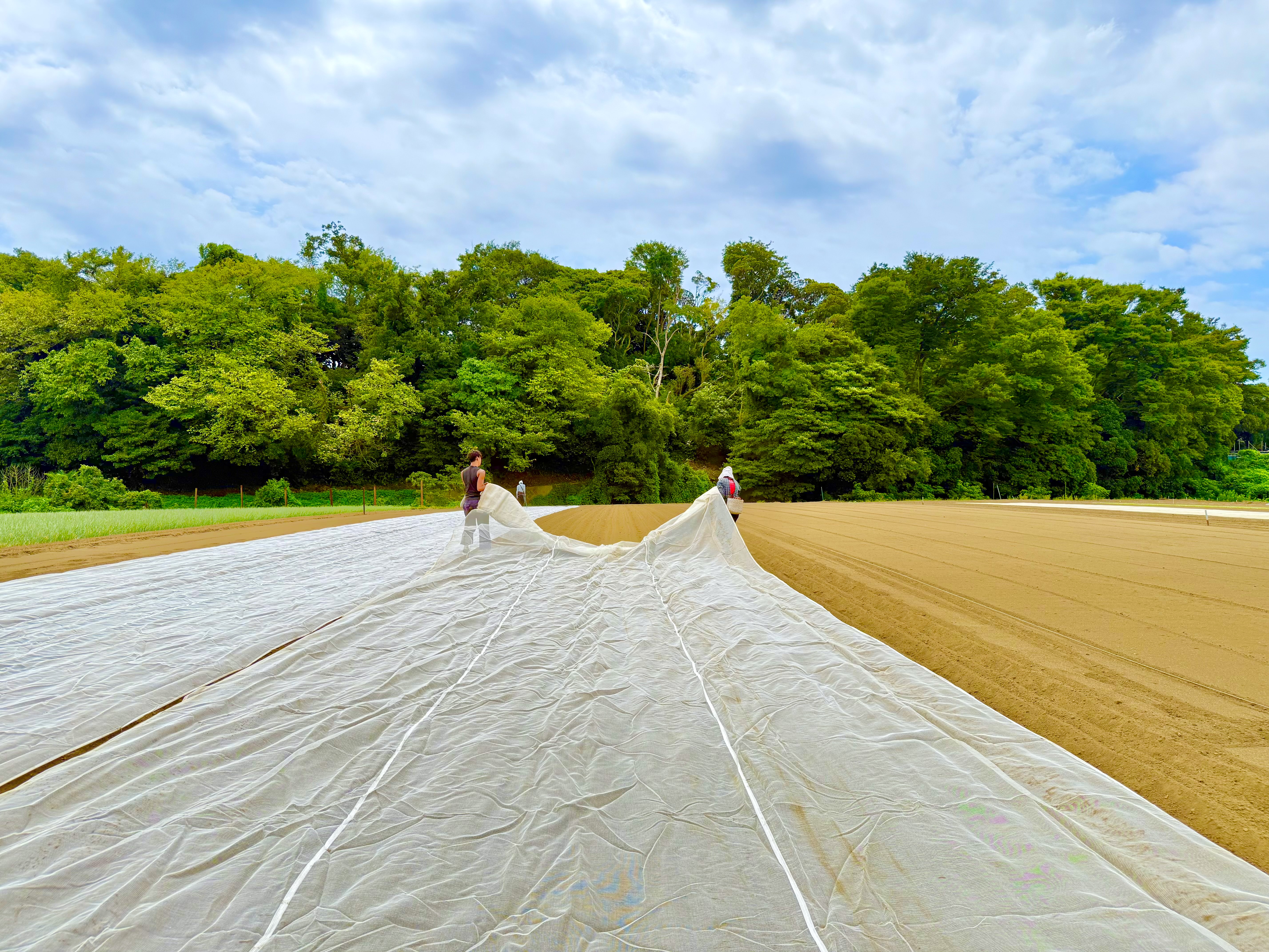 種まきが終わると、寒冷紗(かんれいしゃ)という植物を保護するための布を張り、その上から、水やりを行います。畑を2枚分まくのに約3000リットルの水を使います。1列ずつ丁寧に確実に、土に浸透するようにゆっくり流し込んでいきます。