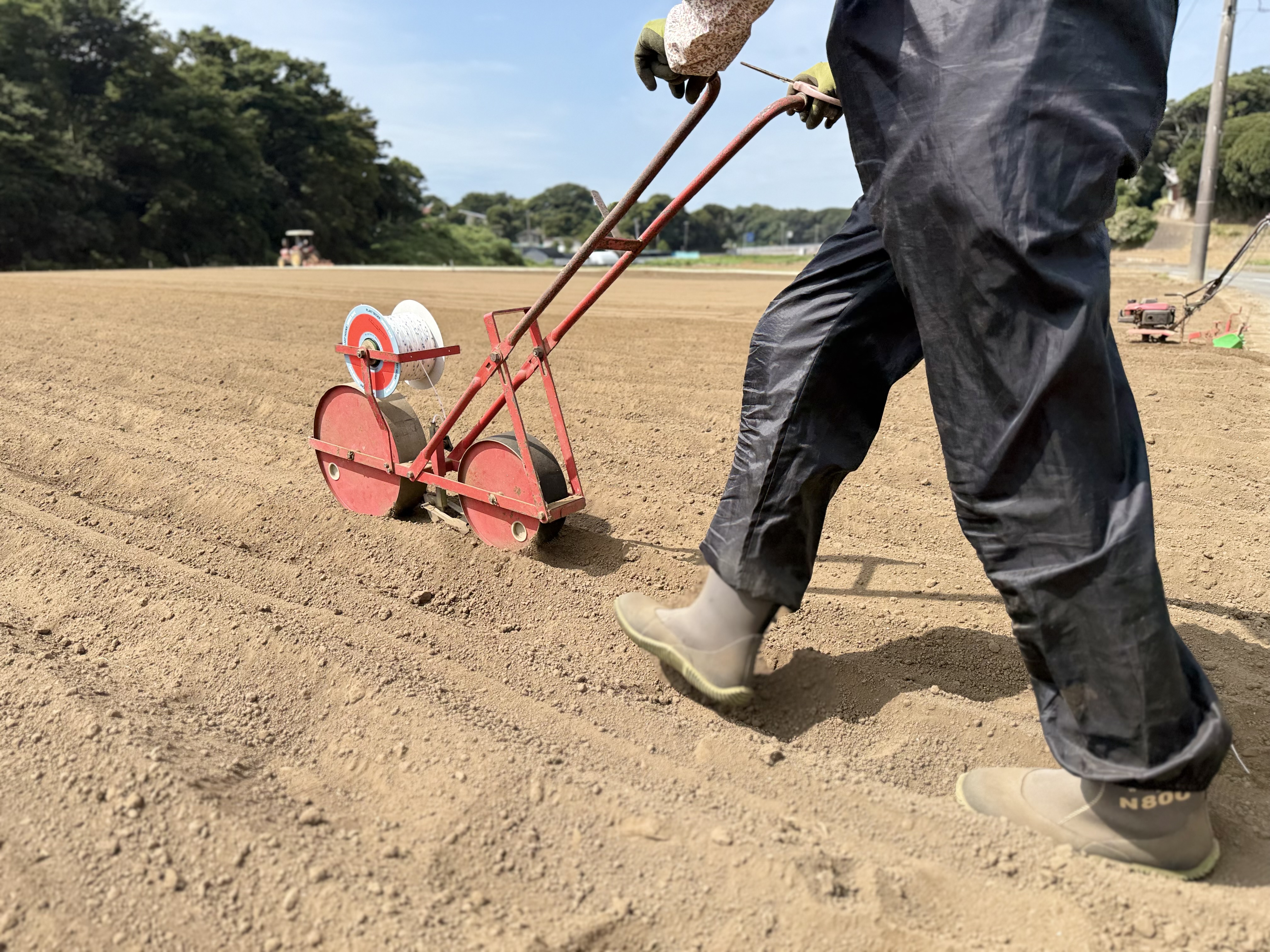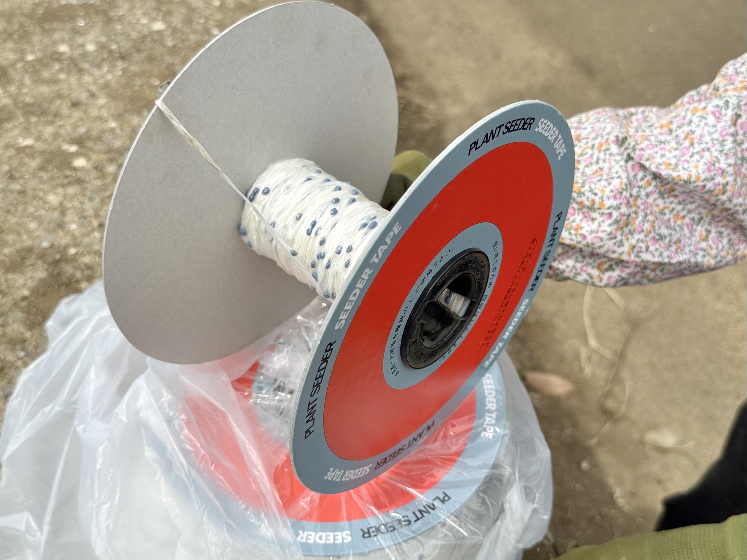 いよいよ種まきです。使うのは「種まきマシン」と呼ばれる手押しの機械です。この機械には「シーダーテープ」というロールがセットされています。