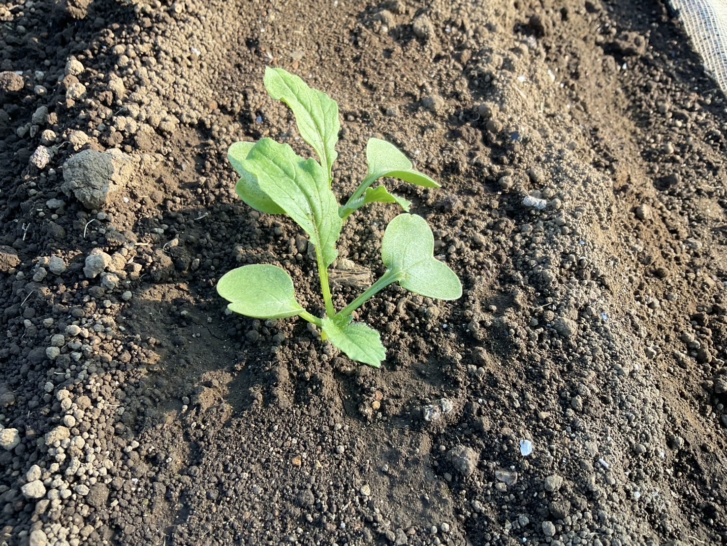 その後、子葉の間に、ギザギザとした大根特有の形をした本葉(ほんば)が顔を出します。この本葉が成長していくことで、大根の形に育っていきます。