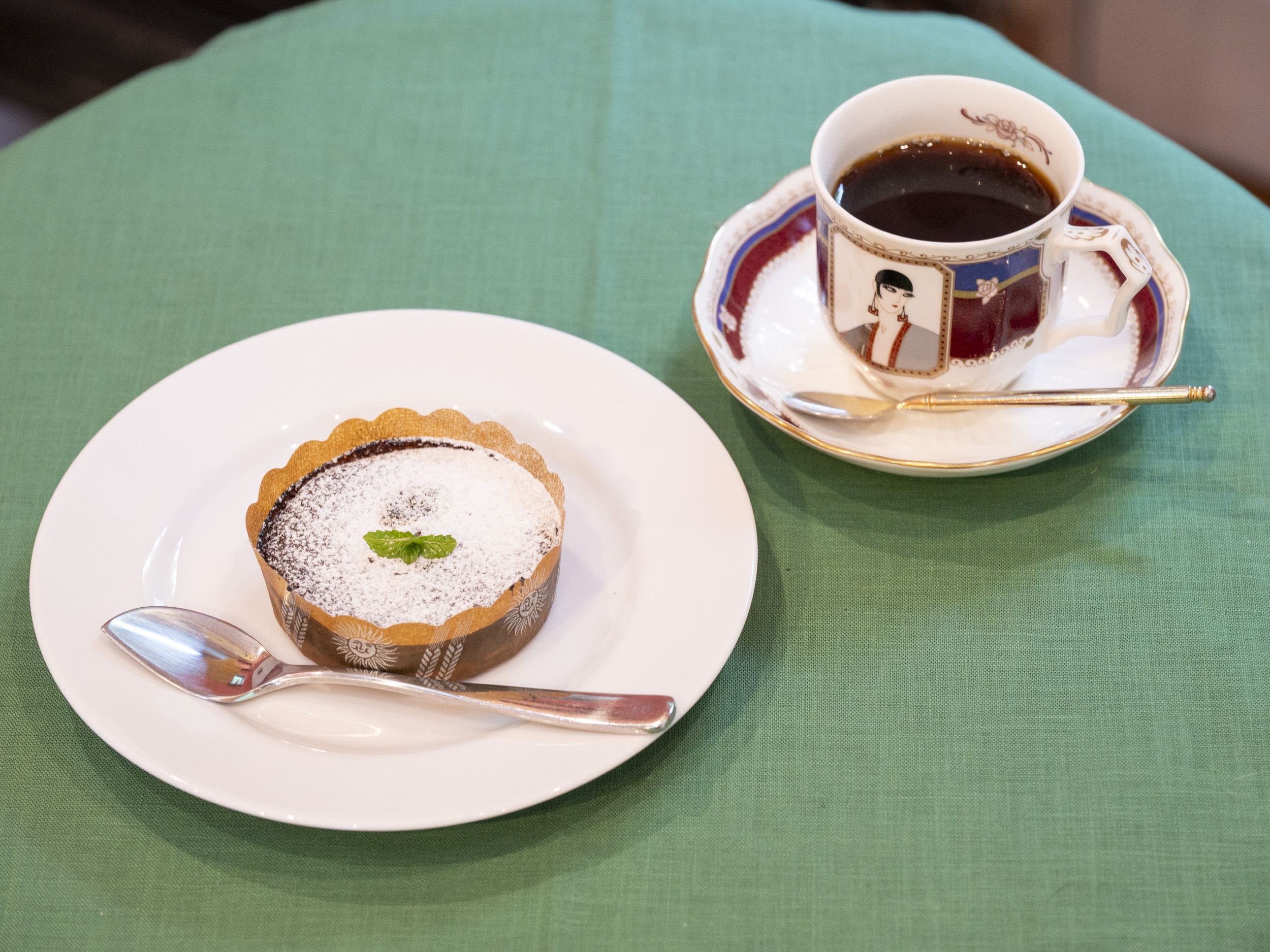 お庭を見ながらのティータイムも人気です。ラウンジは吹き抜けになっており、気持ちの良い陽光に包まれます。カフェセット「ケーキ+お飲み物」(1,000円)は、フォンダンショコラとフォンダンフロマージュの2種類のどちらかを。また飲み物は、珈琲もしくは紅茶が選べます。