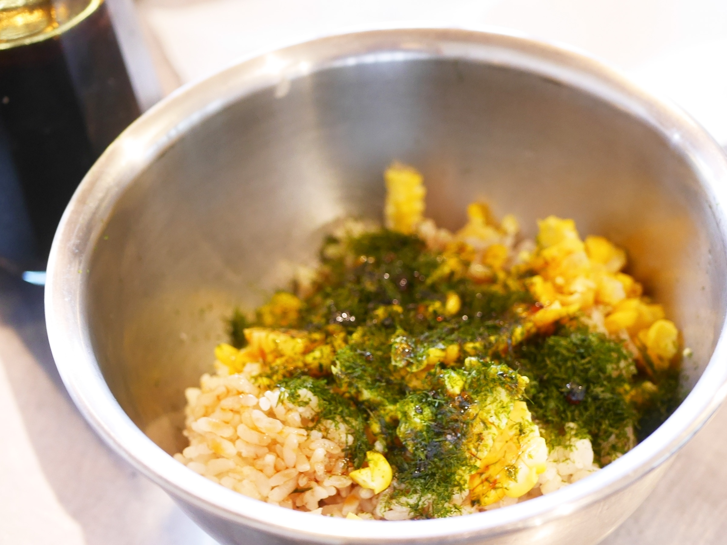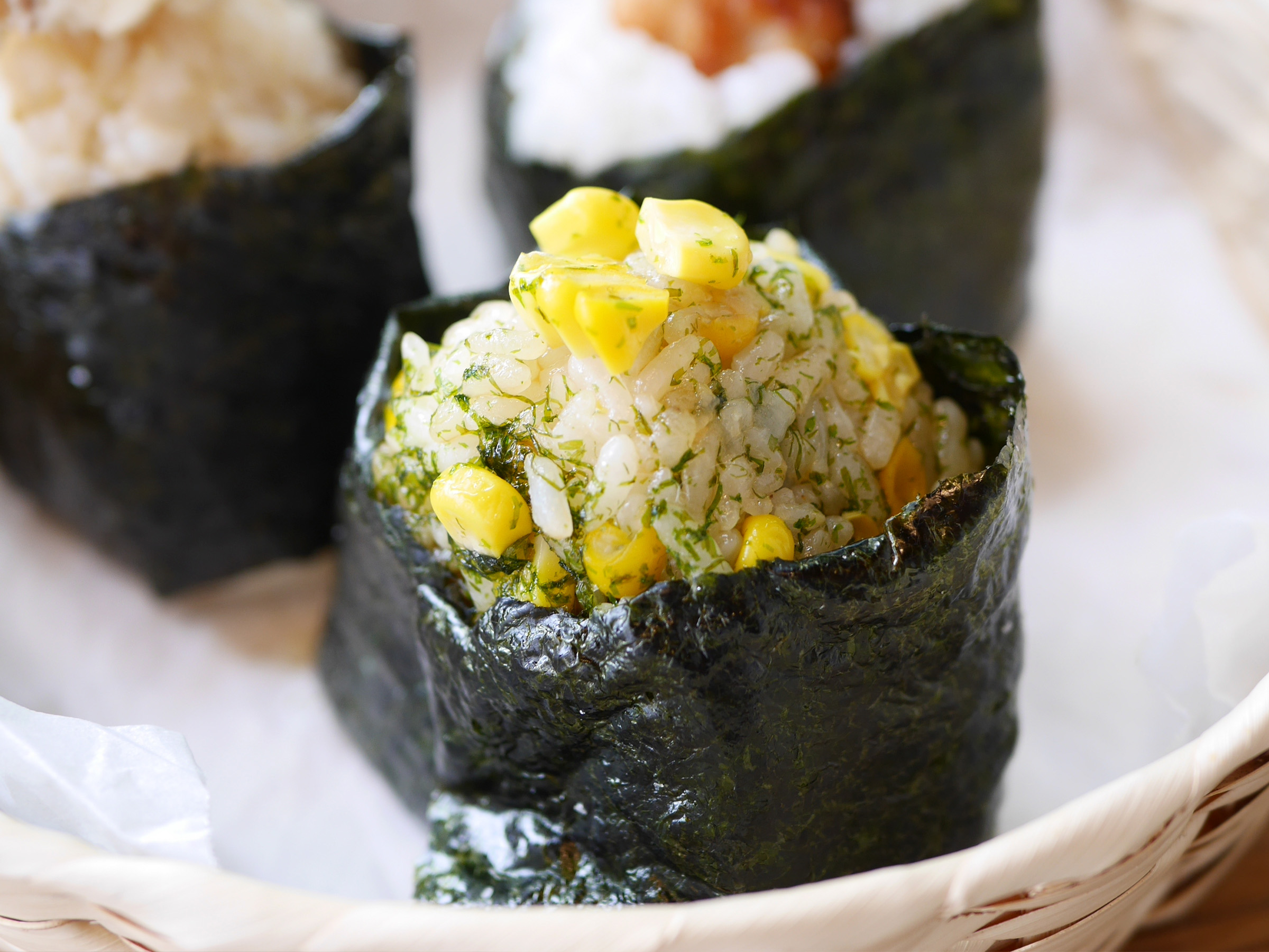 季節のおむすび(320円税込)の「焼きとうもろこしと青すじのり」も人気。焼きとうもろこしの香ばしさと青のりの風味が口いっぱいに広がり、夏の記憶を呼び覚ますような味です。