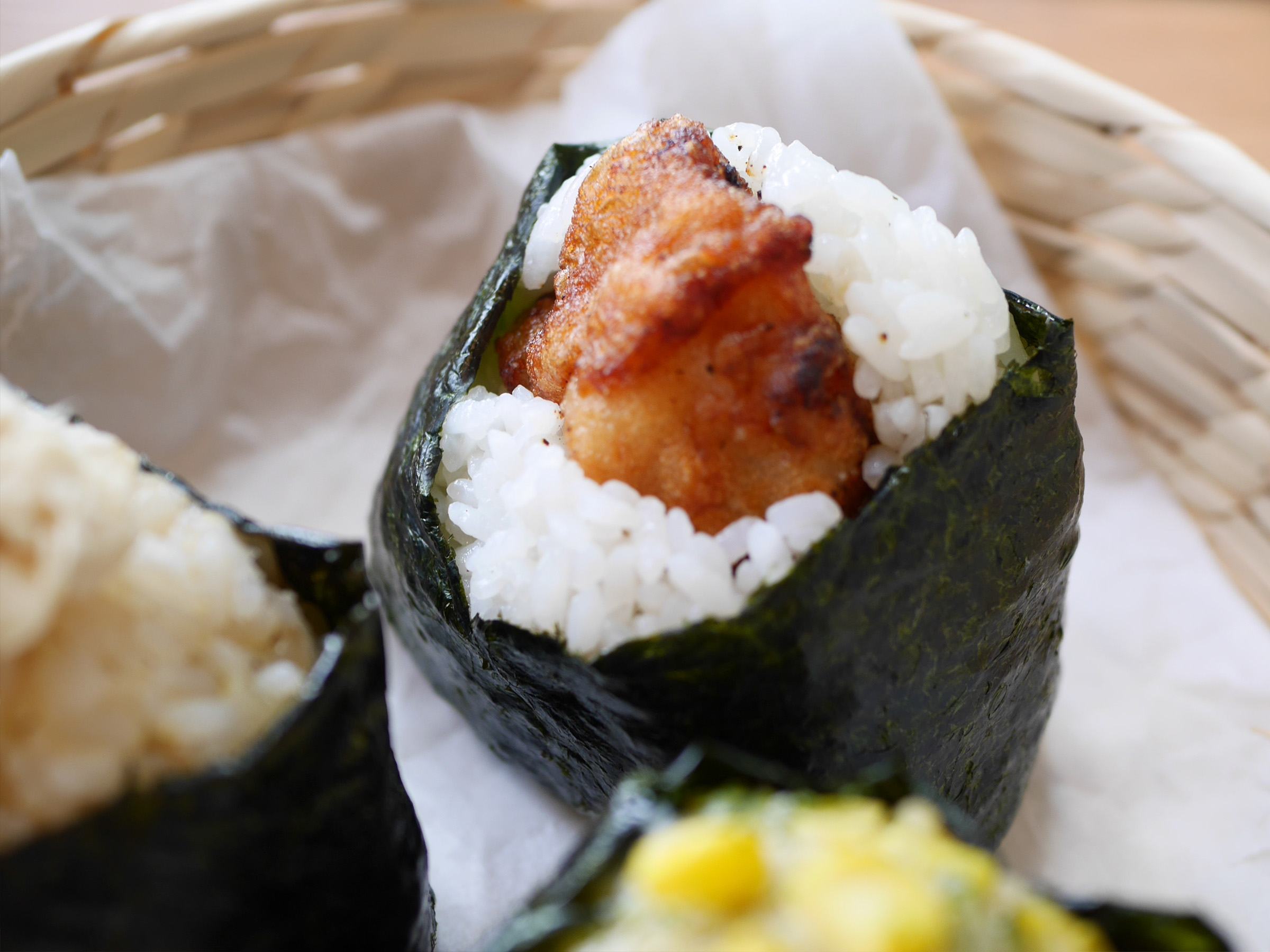 もうひとつの人気は「からあげむすび(350円税込)」。ころんと大ぶりな唐揚げがごろっと包まれた一品で、頬張ると米の甘さと鶏肉の旨みが一体になります。