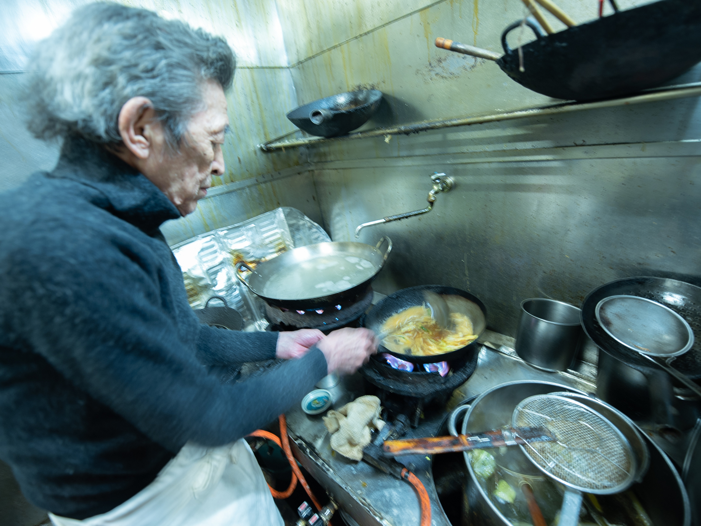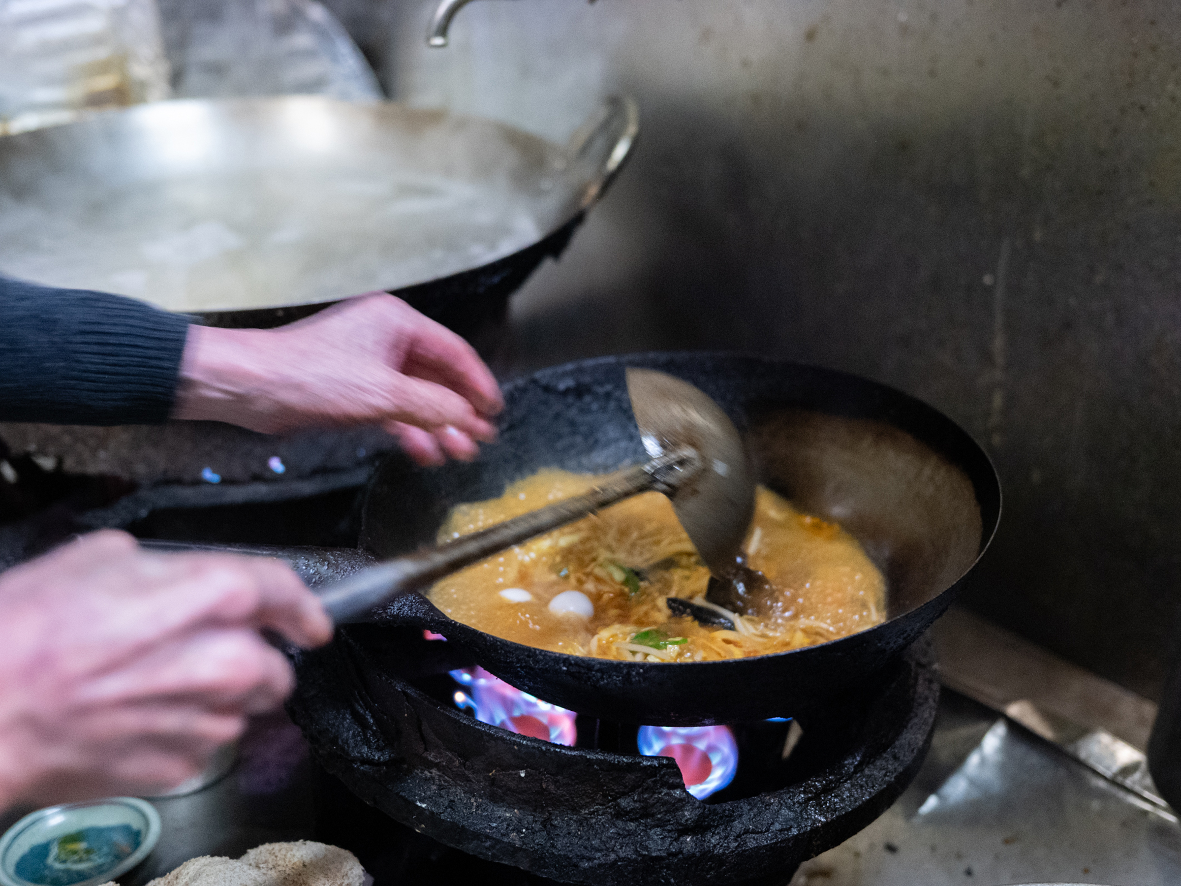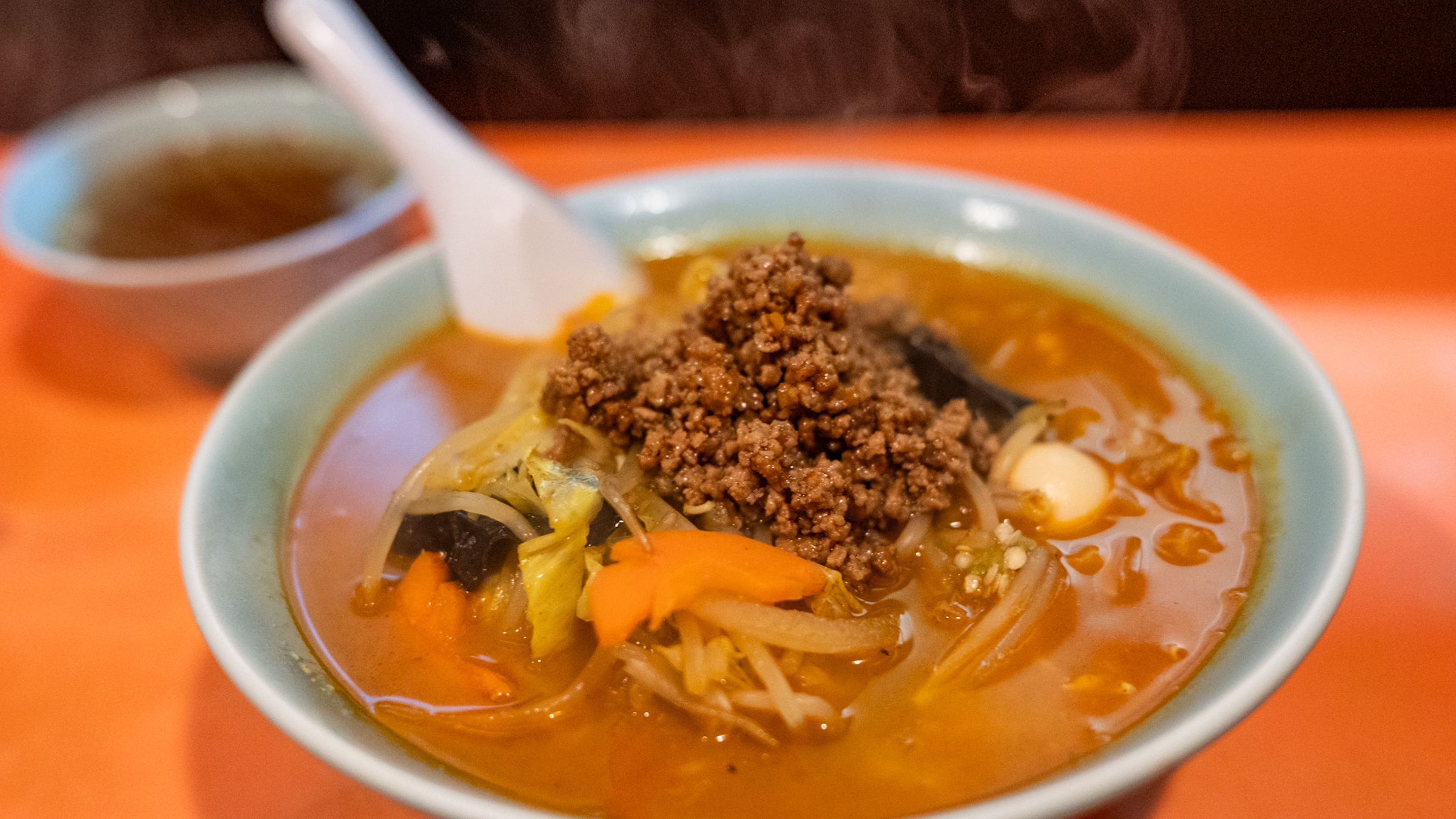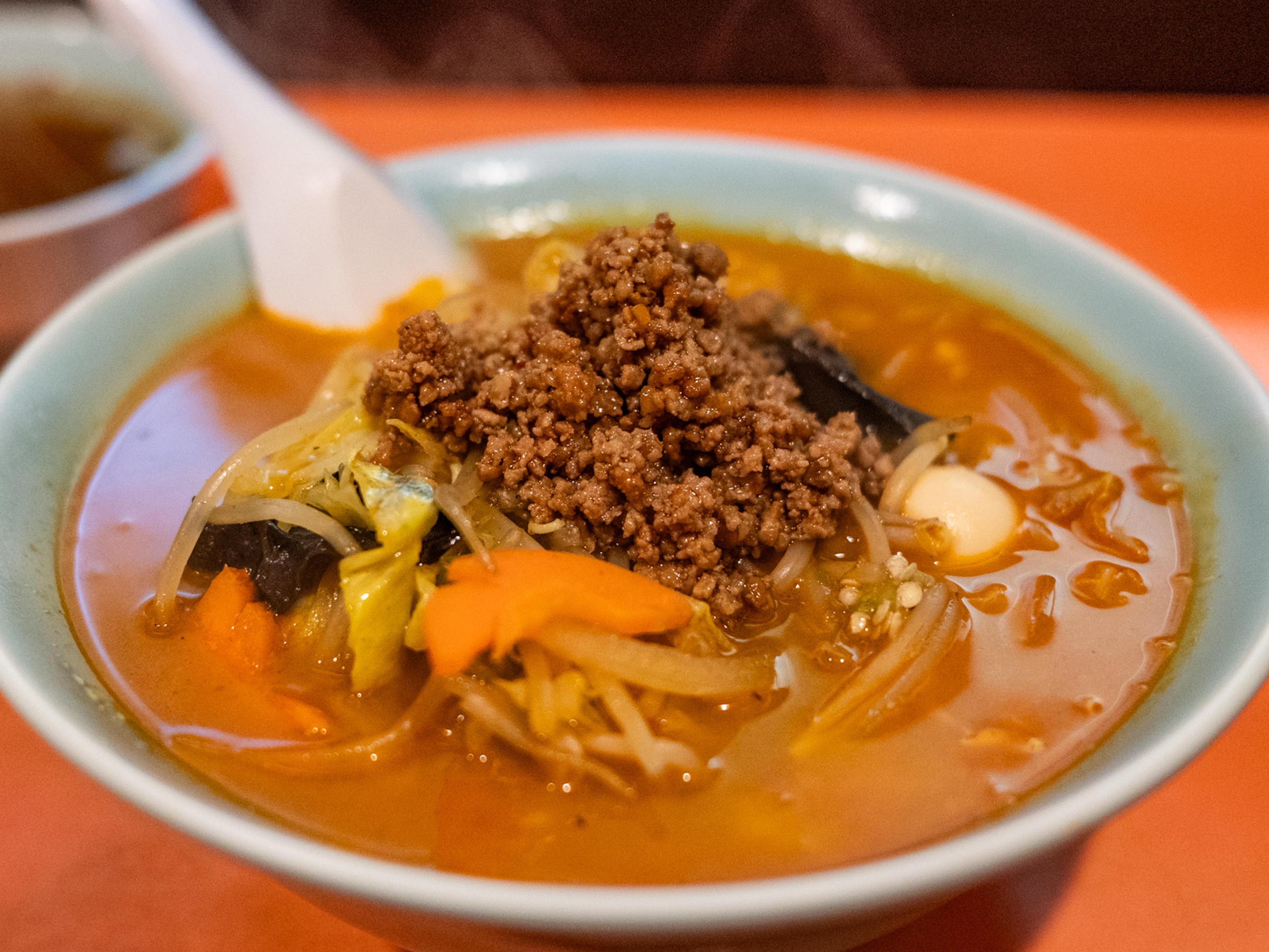 山盛りのひき肉炒めが香ばしく、思わず箸を差し込み崩したくなります。スープは町中華らし赤茶色。一口レンゲでいただいてみると、優しい辛味で心がホッとリラックスできます。たっぷりの野菜炒めと太めの縮れ麺で、すっかりお腹も満足です。
