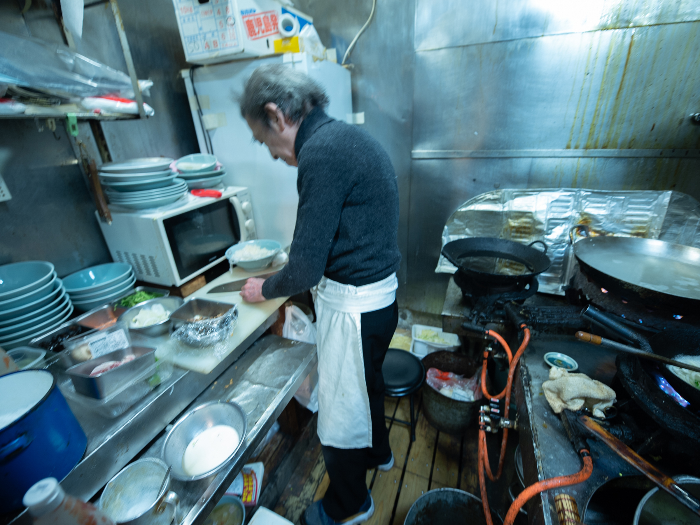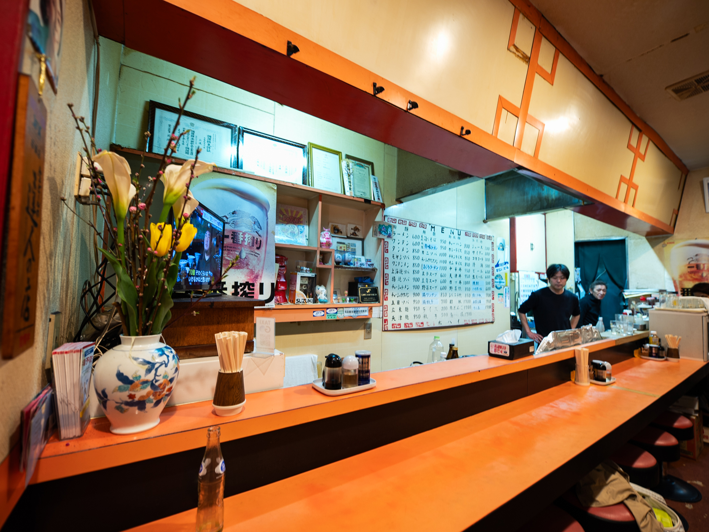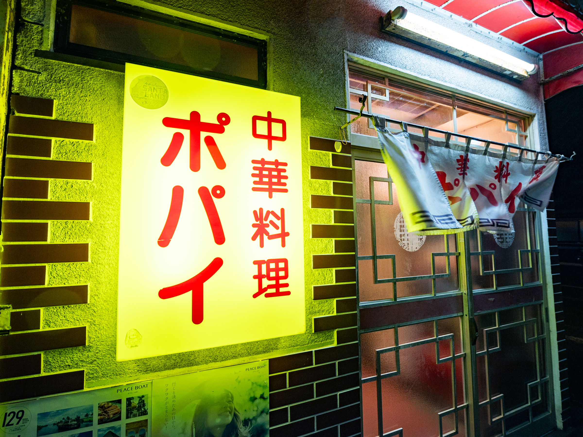日が沈んだ入船すずらん通りを照らす看板。営業時間は夜の23時までで、お客さんは夜の方が多いと言います。ほろ酔いの地元の方が締めの一杯を求めて、こののれんをくぐるのでしょう。