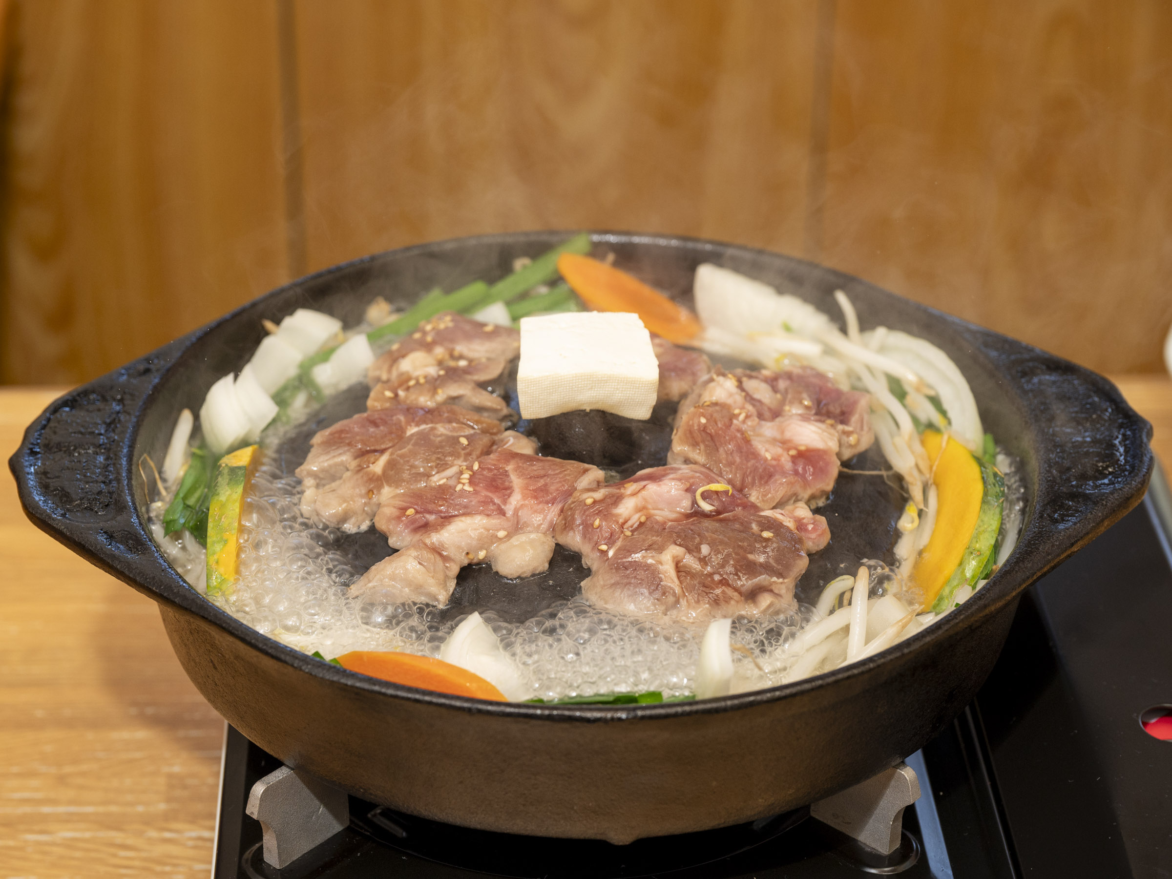 「珍しいみたいですね。僕は北海道豊富町出身でして、ジンギスカン鍋といえば、子どもの頃からこの形なんです。まわりに水を張って野菜を置きます。焼き上がるラム肉の肉汁が流れ落ちて野菜に染み込むんです。鍋の真ん中に蒸気を逃す穴があって、ここを木綿豆腐で塞ぐのが豊富町流です」