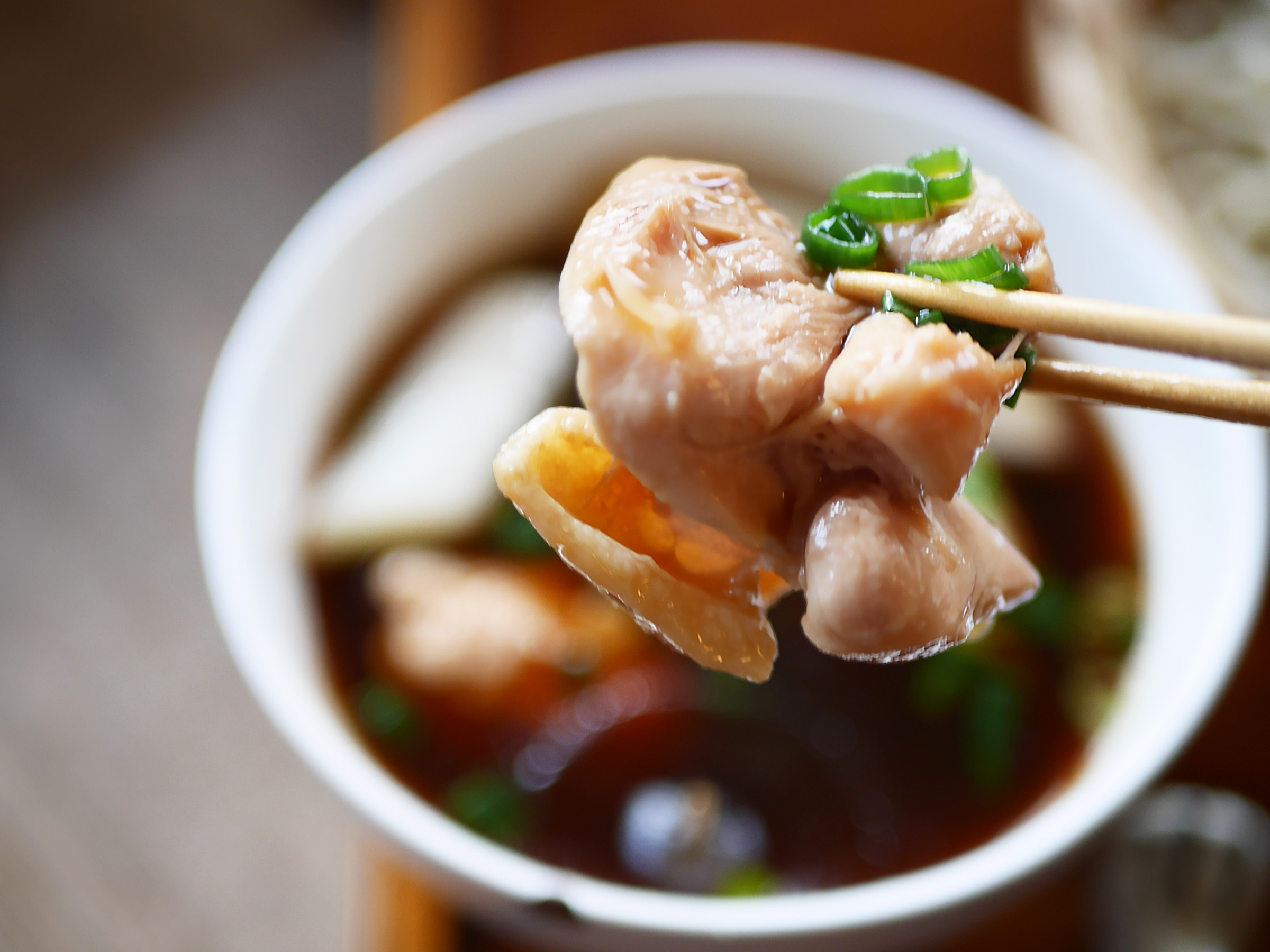 そば店では鴨肉を使うことが多い中、池田さんは「好きなものは追求するでしょ」「私、鶏が好きなんです」と笑顔で話します。地元の肉店から仕入れる新鮮な鶏肉を、ほどよい弾力としっとりした舌ざわりに仕上げています。