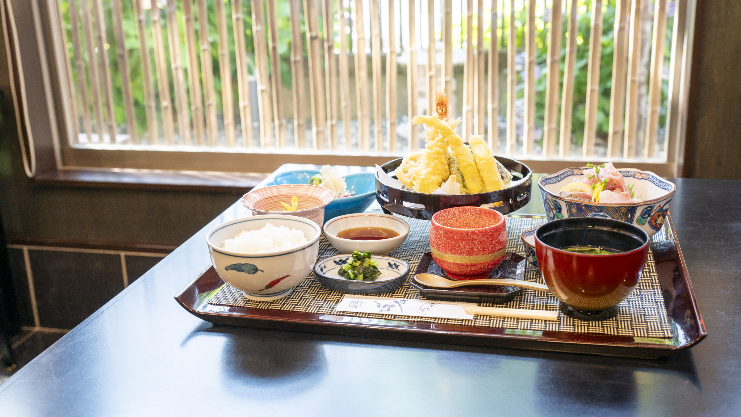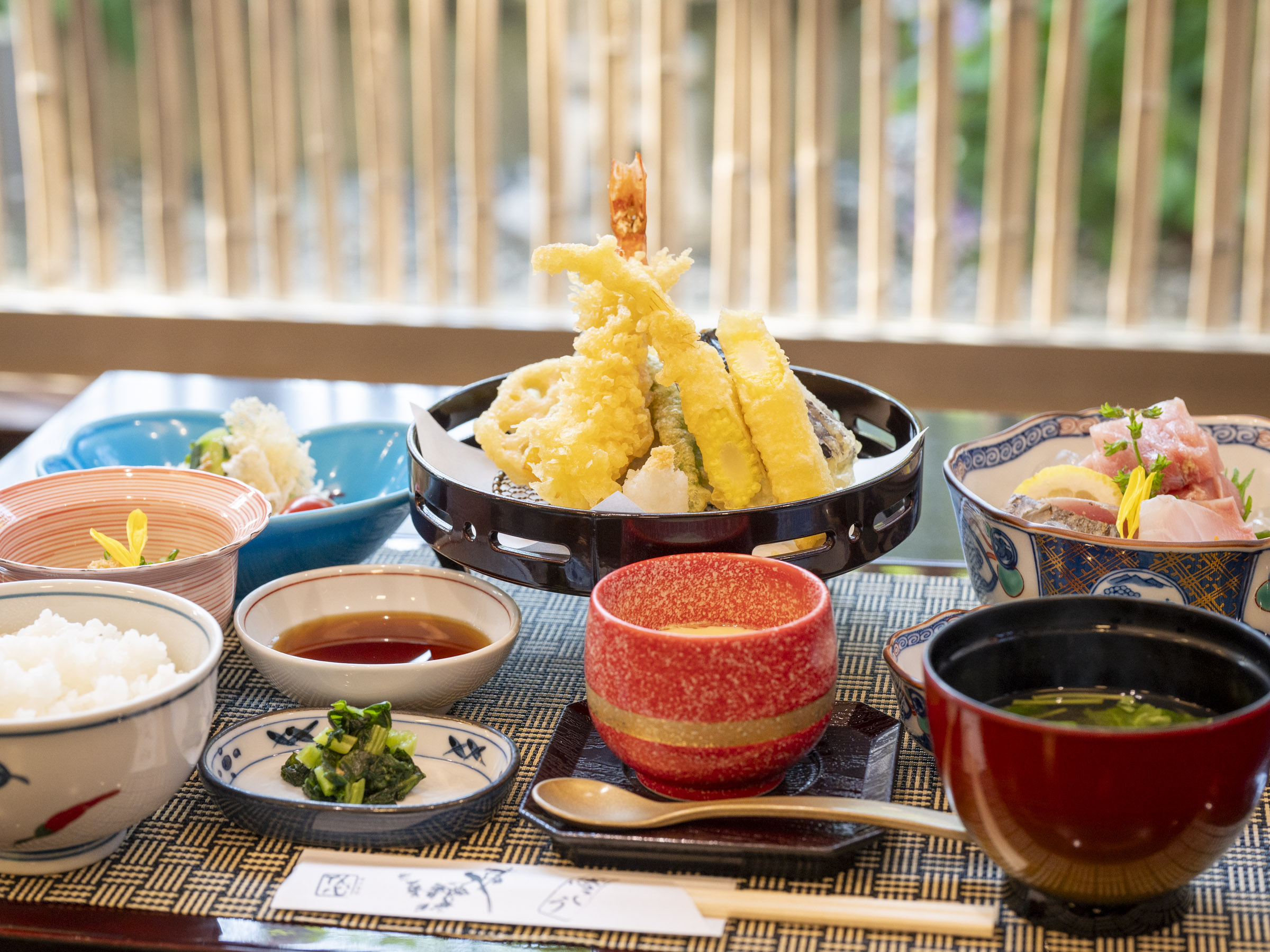 刺身・天ぷら・煮付け・茶碗蒸し・サラダ・漬物が付いた贅沢さ。