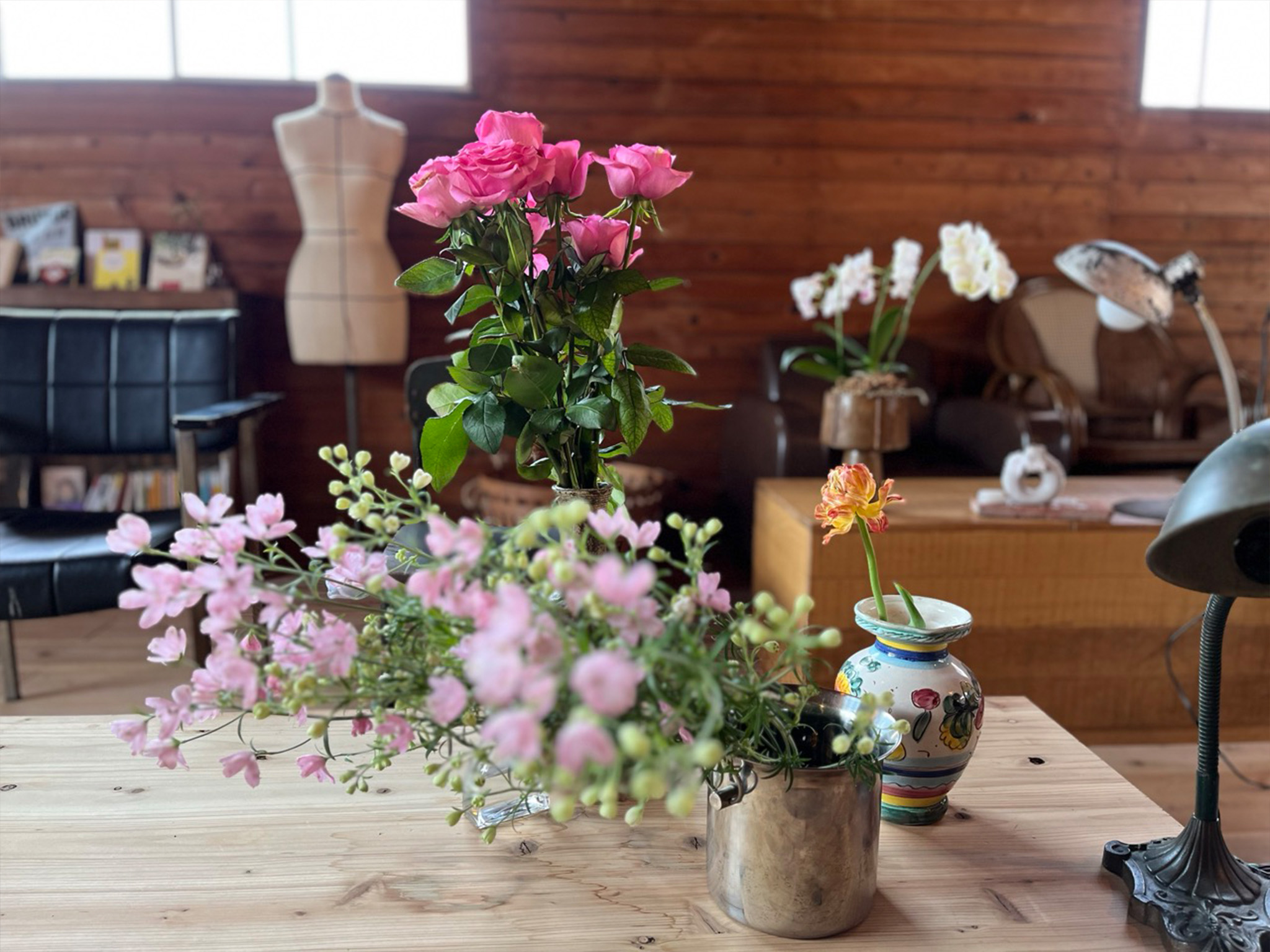 落ち着いた空間のYOSHIDA cafe。アンティーク家具や花々に囲まれた店内は、どこか懐かしく、くつろげる雰囲気です。