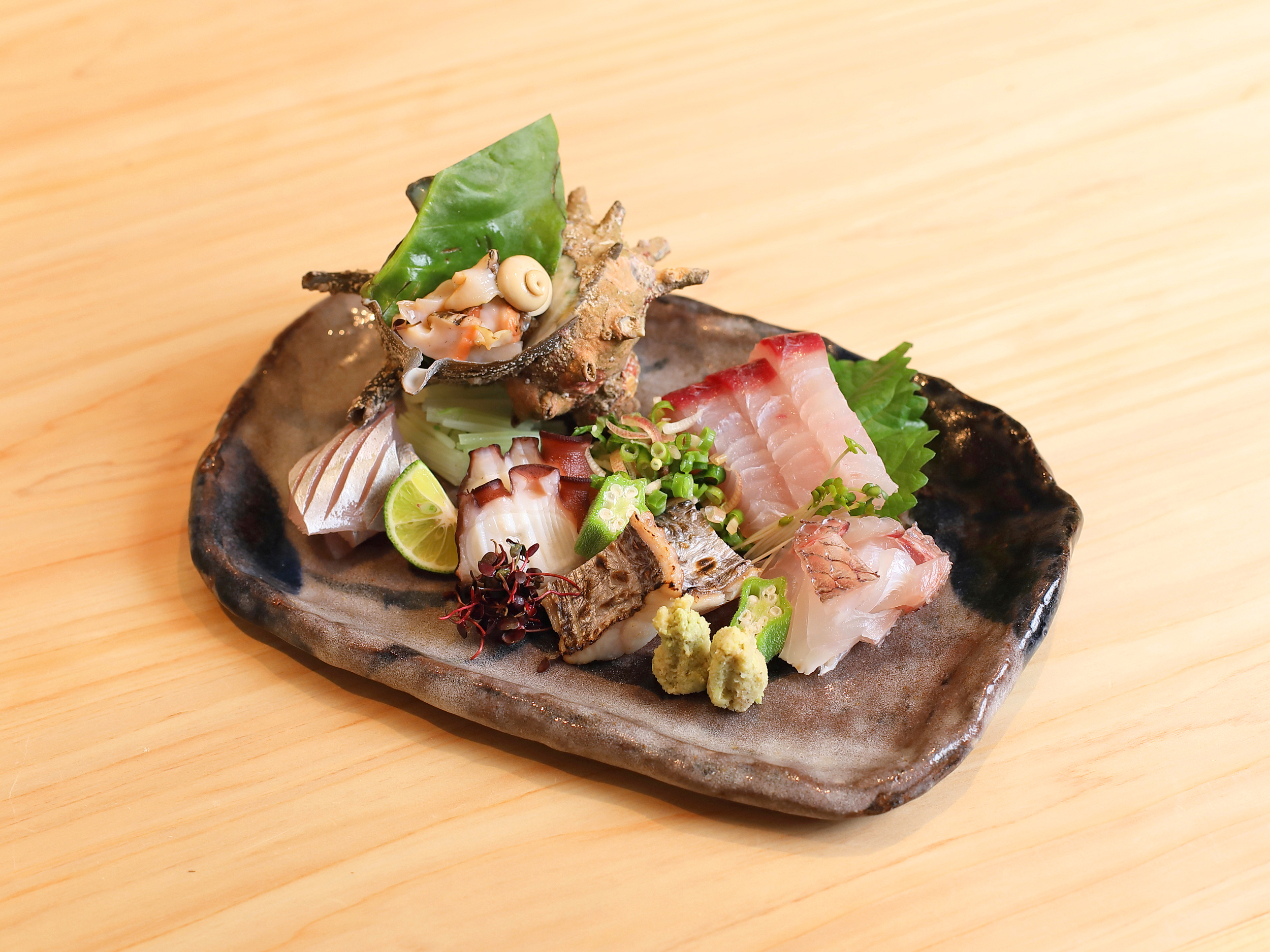 この日は、立派なサザエに加え、サワラ、鯛、太刀魚、タコ、ブリの若魚であるワカシの六種が皿に美しく盛り付けられました。日々の水揚げによって魚は変化します。
