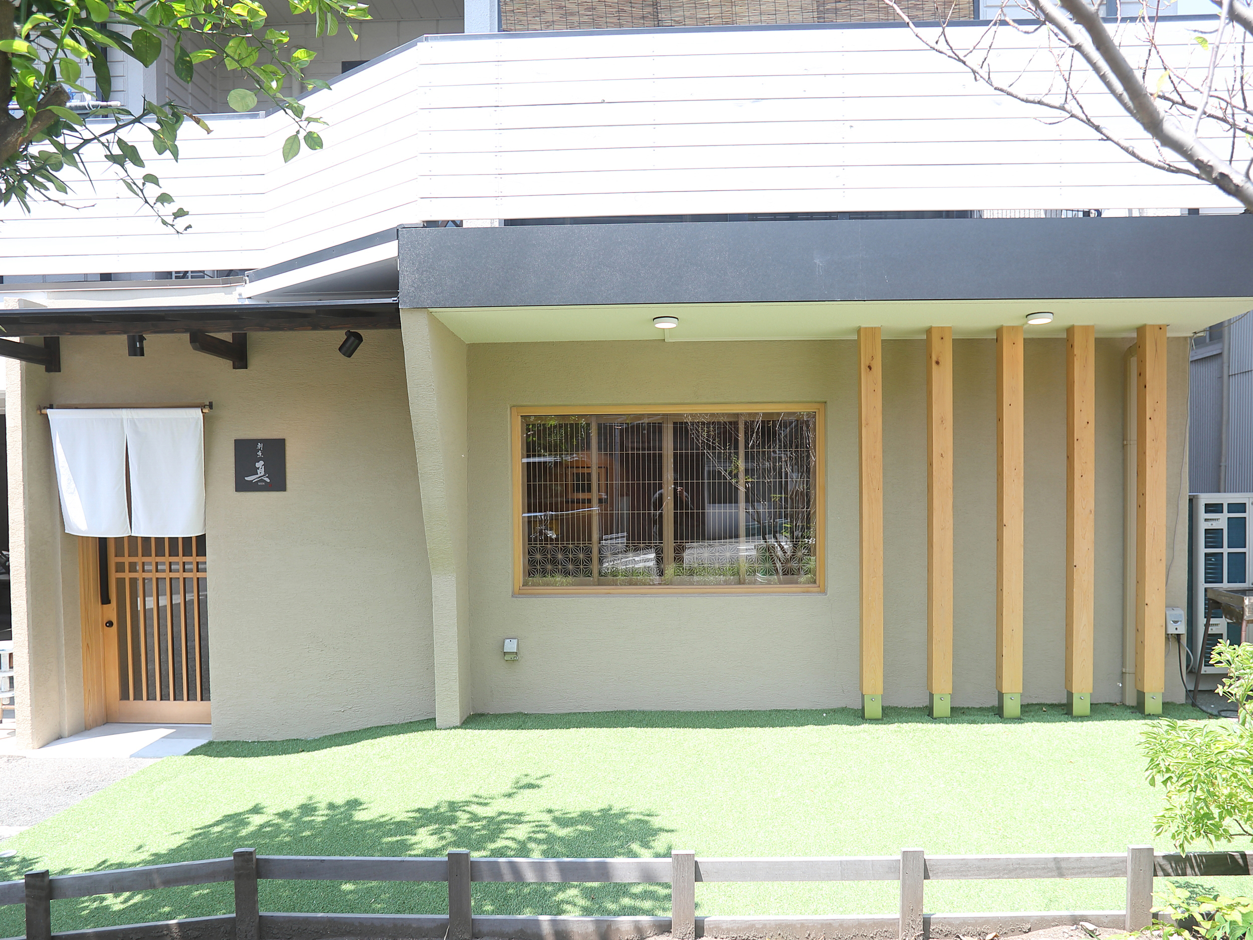 一階右側が「割烹 真」の店舗で、上階には大家さんが居住しています。建物は道からすこし奥まったところにあり、家庭菜園や樹木が割烹らしい雰囲気を醸し出していますが、実はこれらはすべて大家さんが作ってくれたもの。店舗の前に敷かれた緑の人工芝もそう。