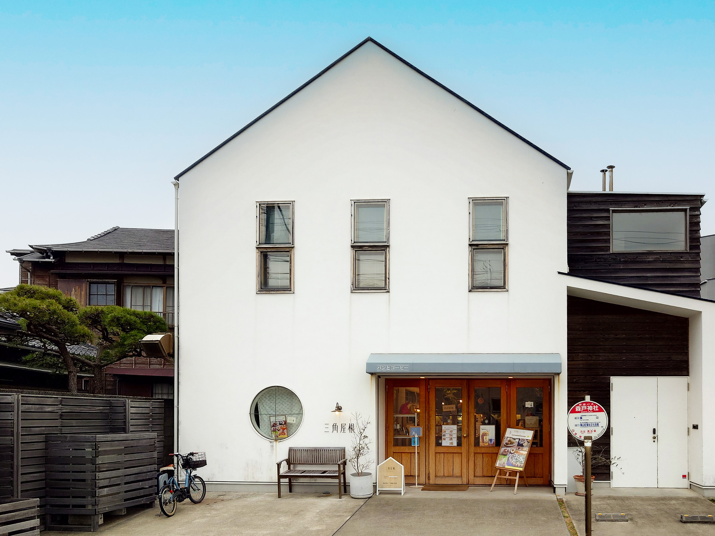 葉山の森戸海岸線沿い、バス停「森戸神社」前にあるベーカリーカフェ「三角屋根 パンとコーヒー」。 店名の通り、パンとコーヒーをゆったり楽しめる店内では、エスプレッソドリンクも人気。