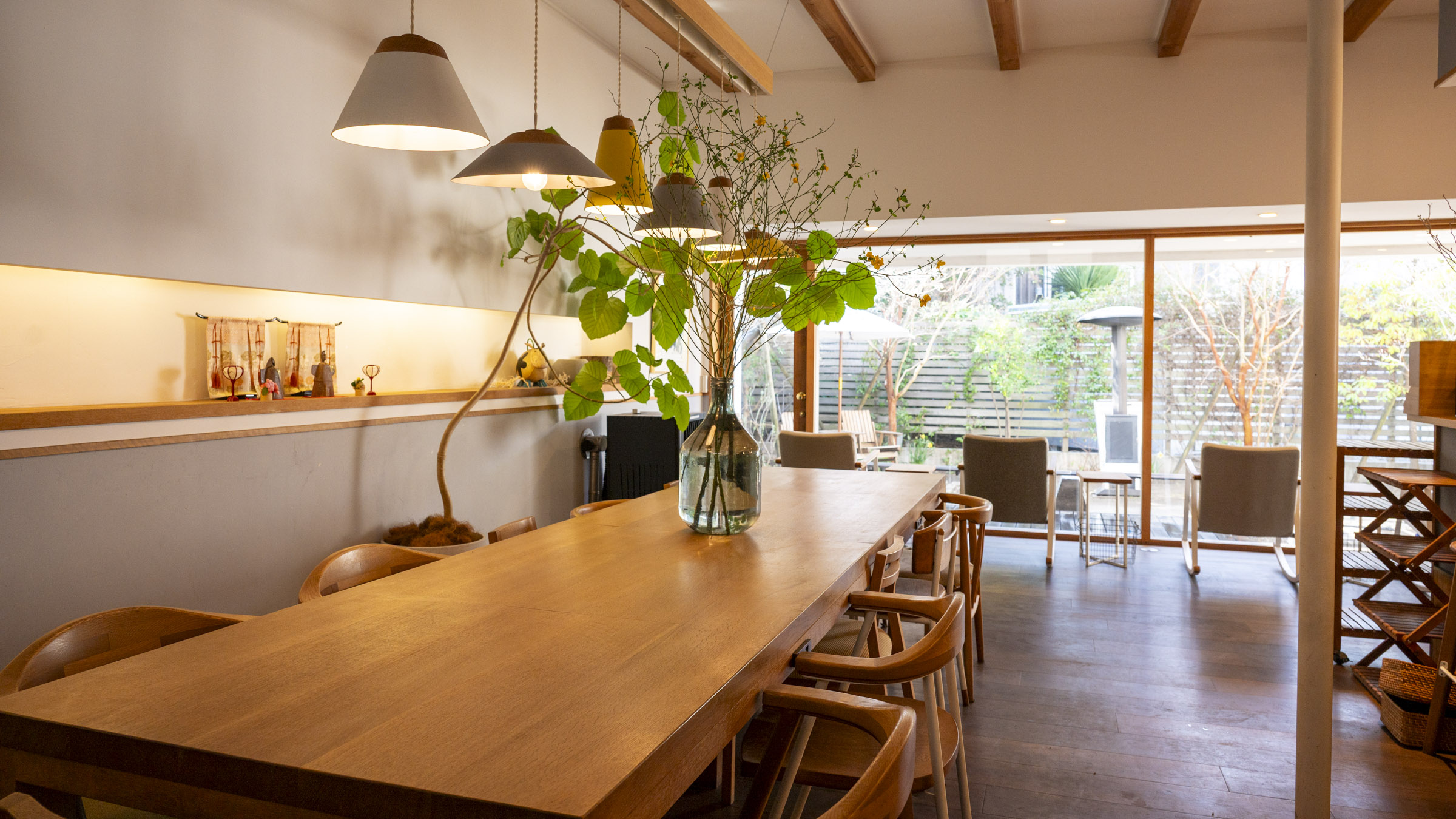 店内には、12人が座れる大きなテーブルがひとつ。カウンターに4席。窓辺にはロッキングチェアが並び中庭を眺めながら過ごせます。