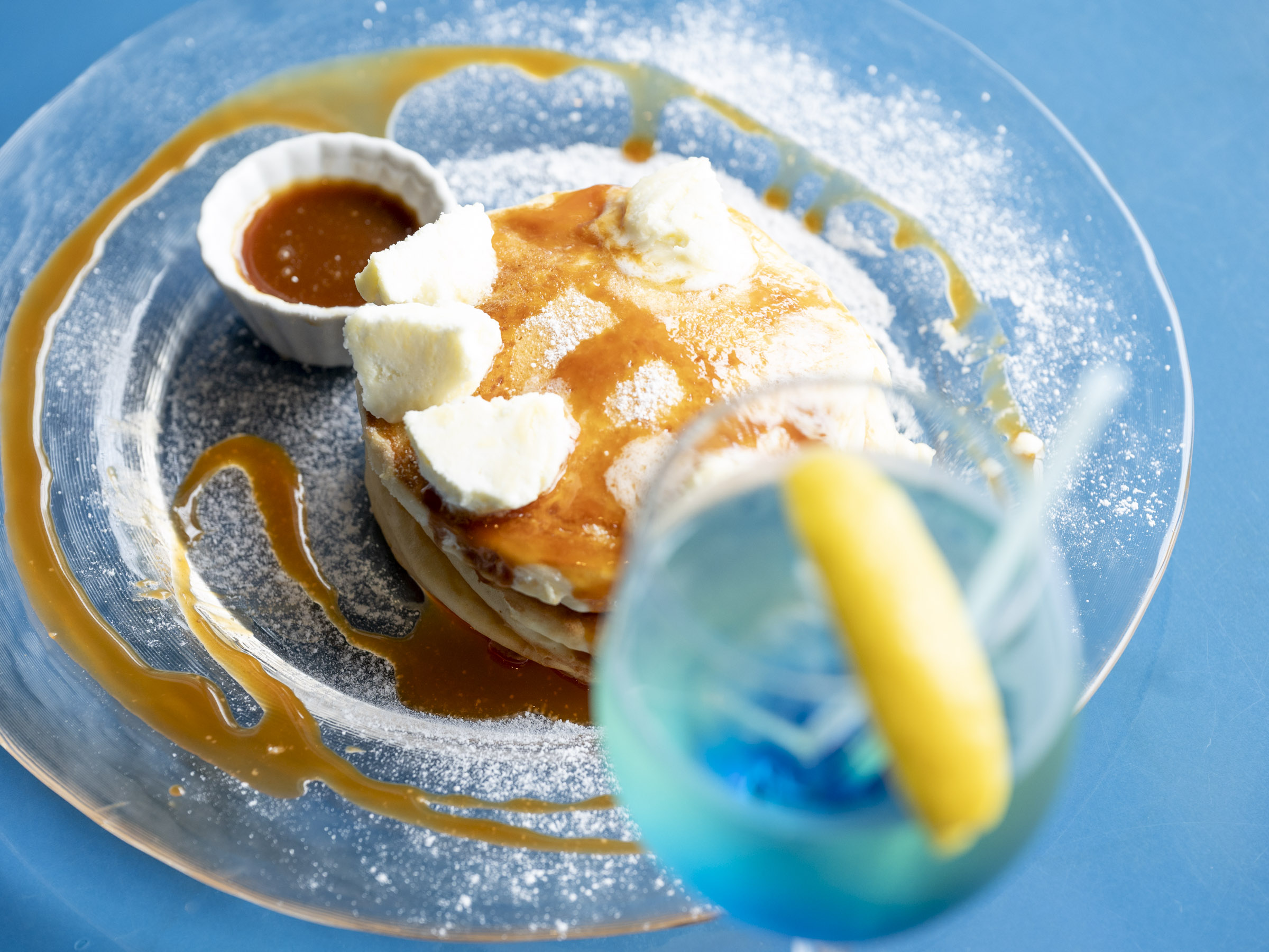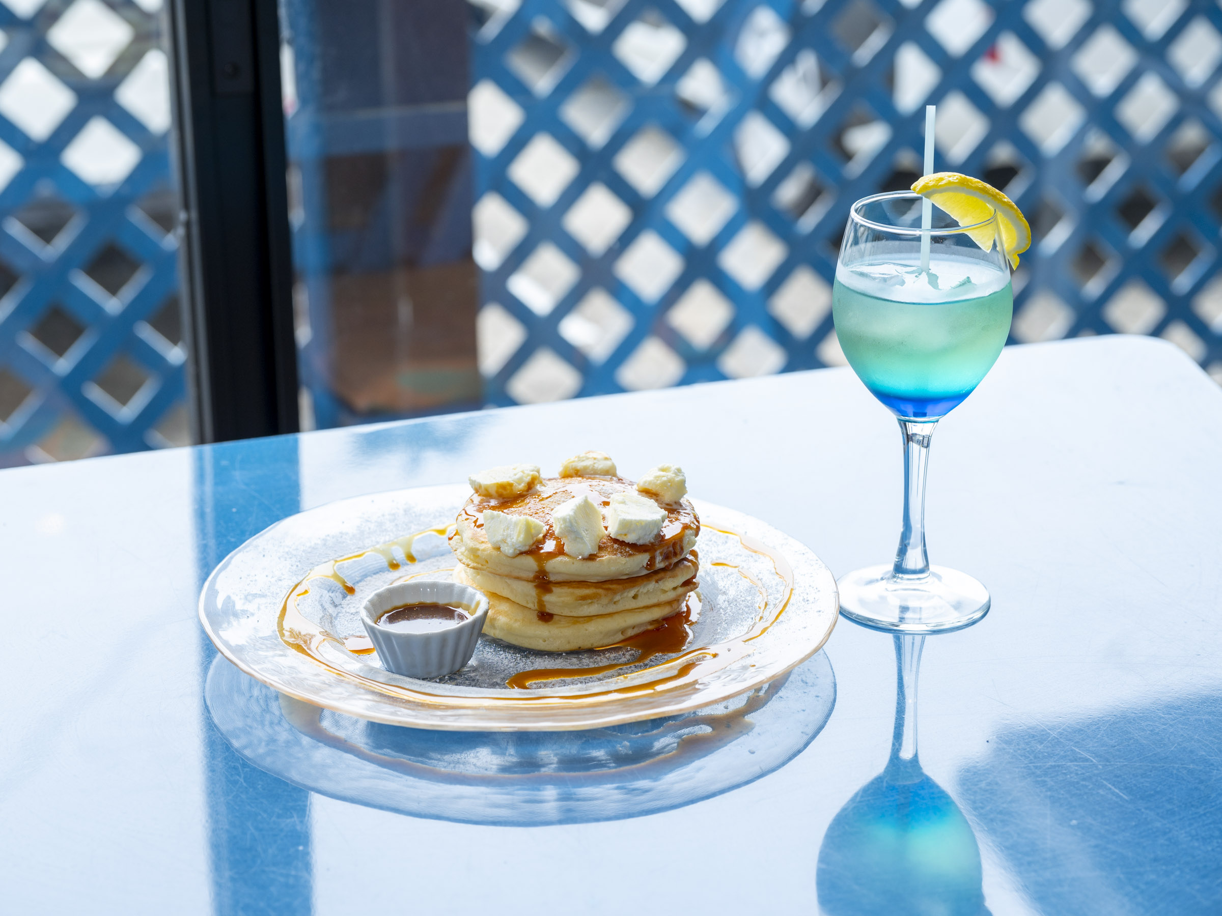 特製塩バターでいただくパンケーキは、海岸を見渡しながら甘じょっぱさを感じられるメニューです。