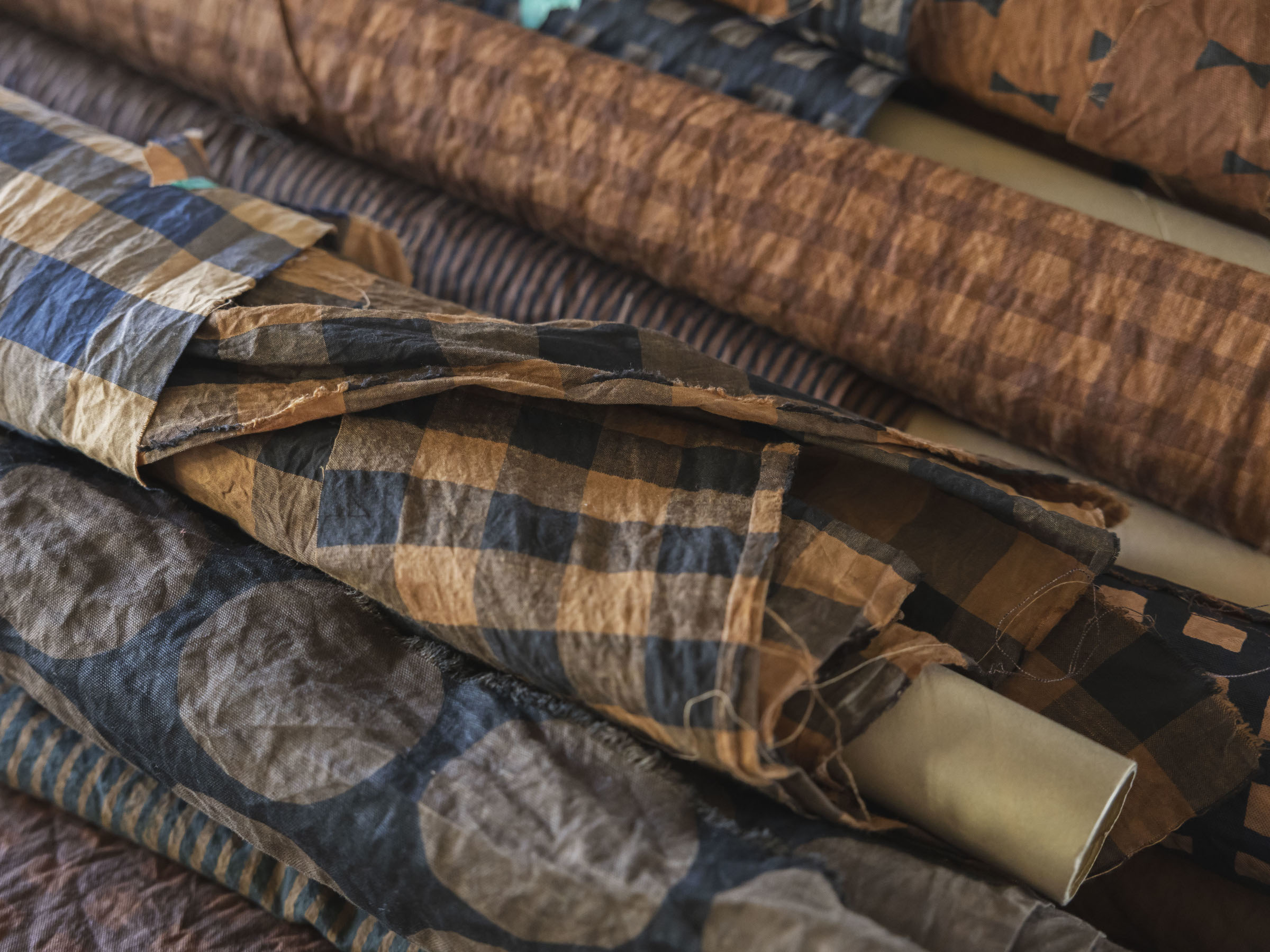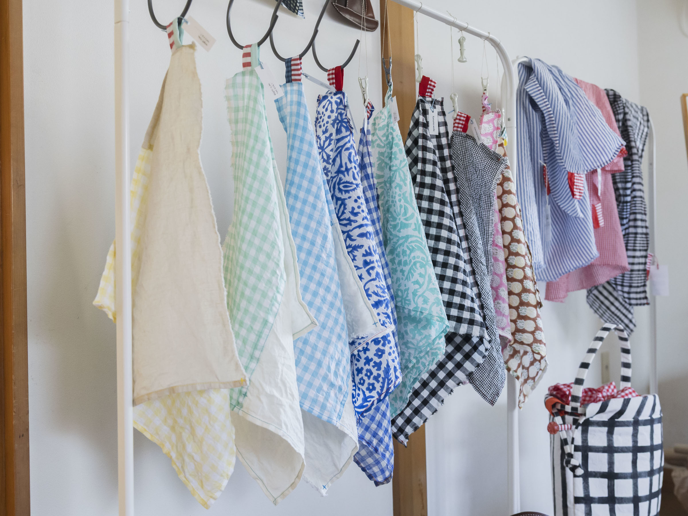 職人の手で加工された綿、アンティークを思わせるリネン、海外の市場で見つかったプリント地など、これまでの布との一期一会の出会いは、塩崎さんの宝物。