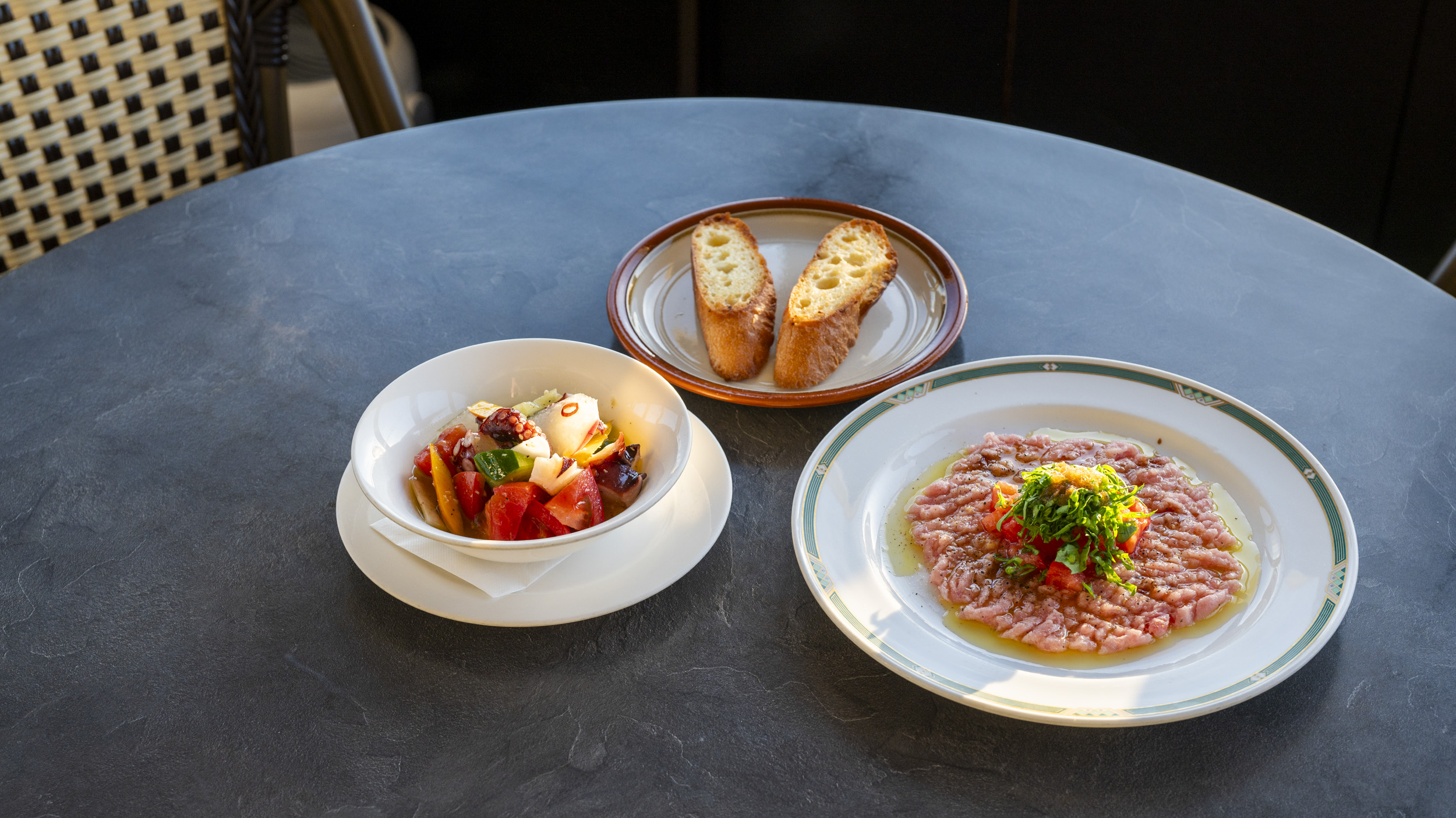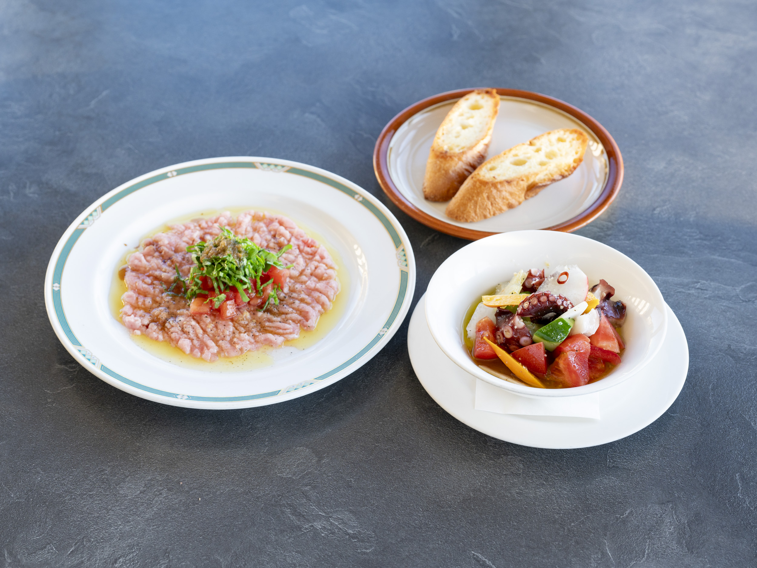 人気は「マグロのたたきのカルパチョ風 有機裁培ルッコラのせ」(1,600円)と「地たこと地野菜のドレッシング」(1,800円)。
