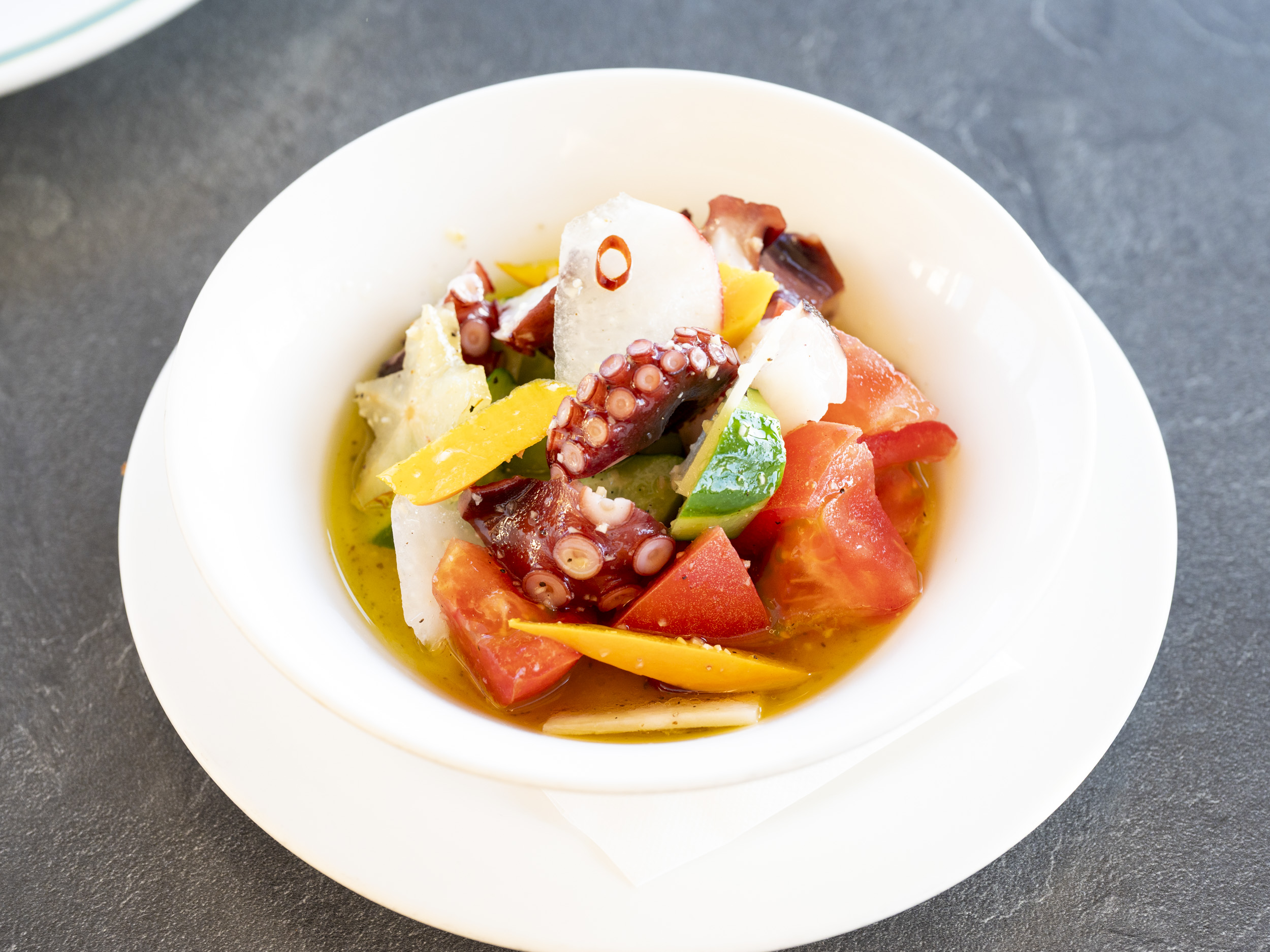 またもうひとつの人気メニュー「地たこと地野菜のドレッシング」(1,800円)は、季節によって貴重な存在となる地タコのやわらかさが絶品のメニューです。それに組み合わせられるトマトをはじめとした野菜の新鮮さも感じられます。