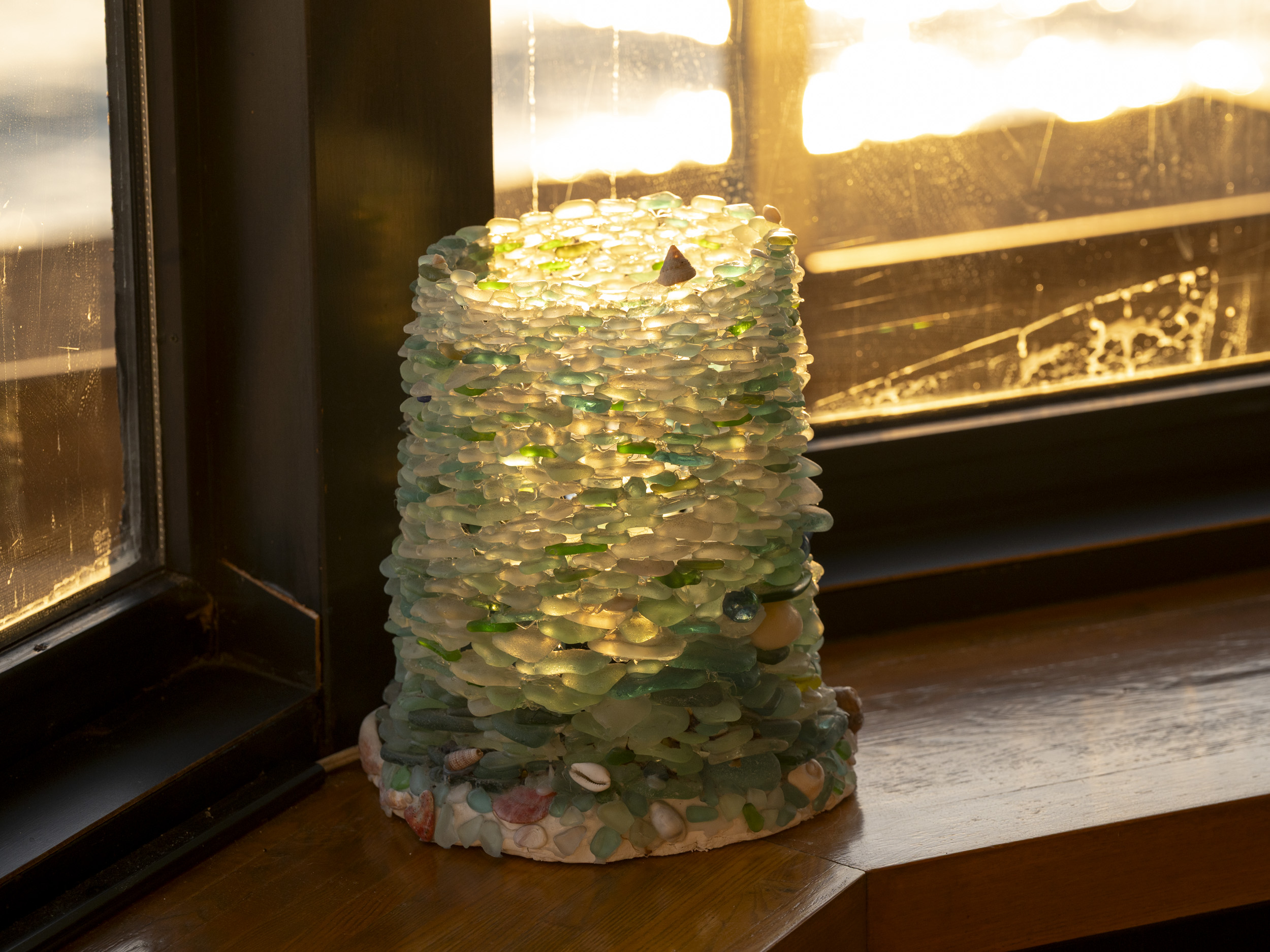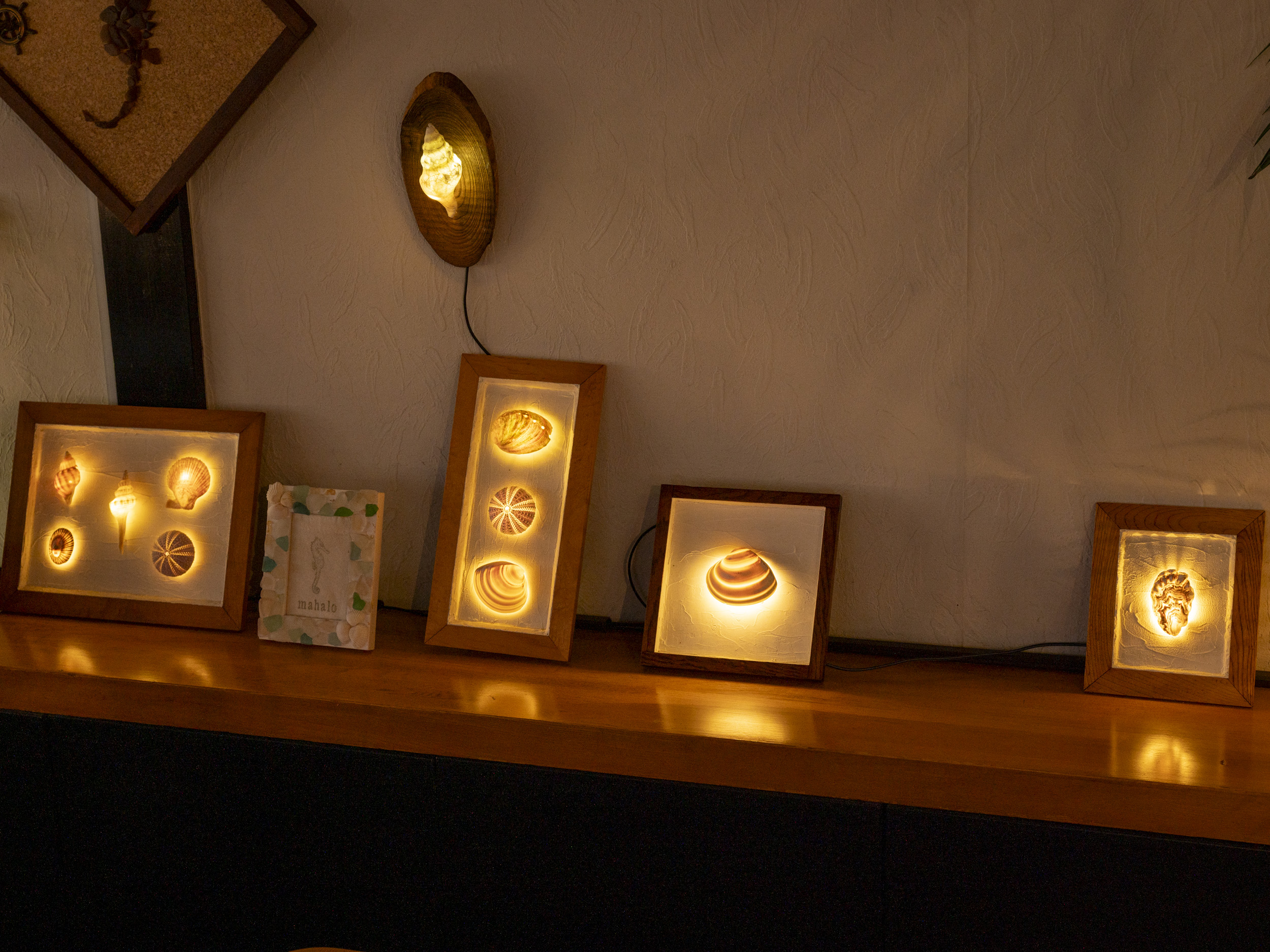 「お店のテーブルランプは、お店の前の海岸で拾ったシーグラスで妻と娘が作りました」とのこと。ご家族で、お店をよりよいものにされていることが伝わるエピソードです。