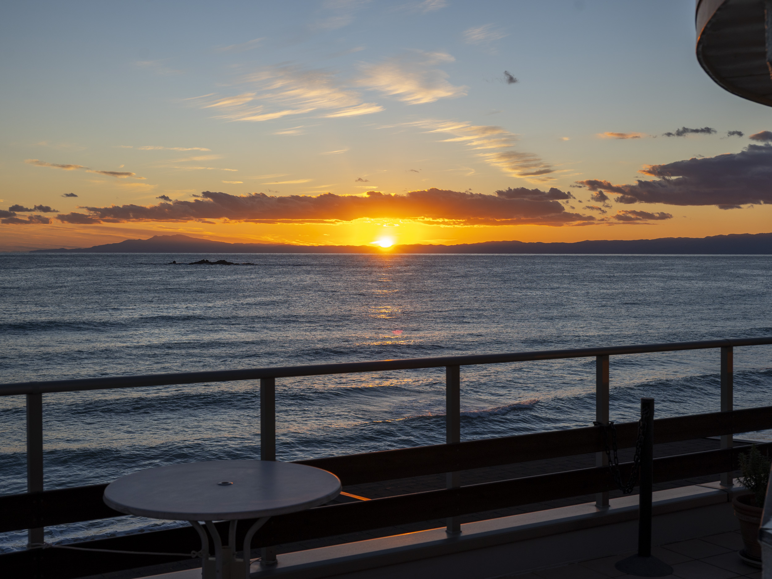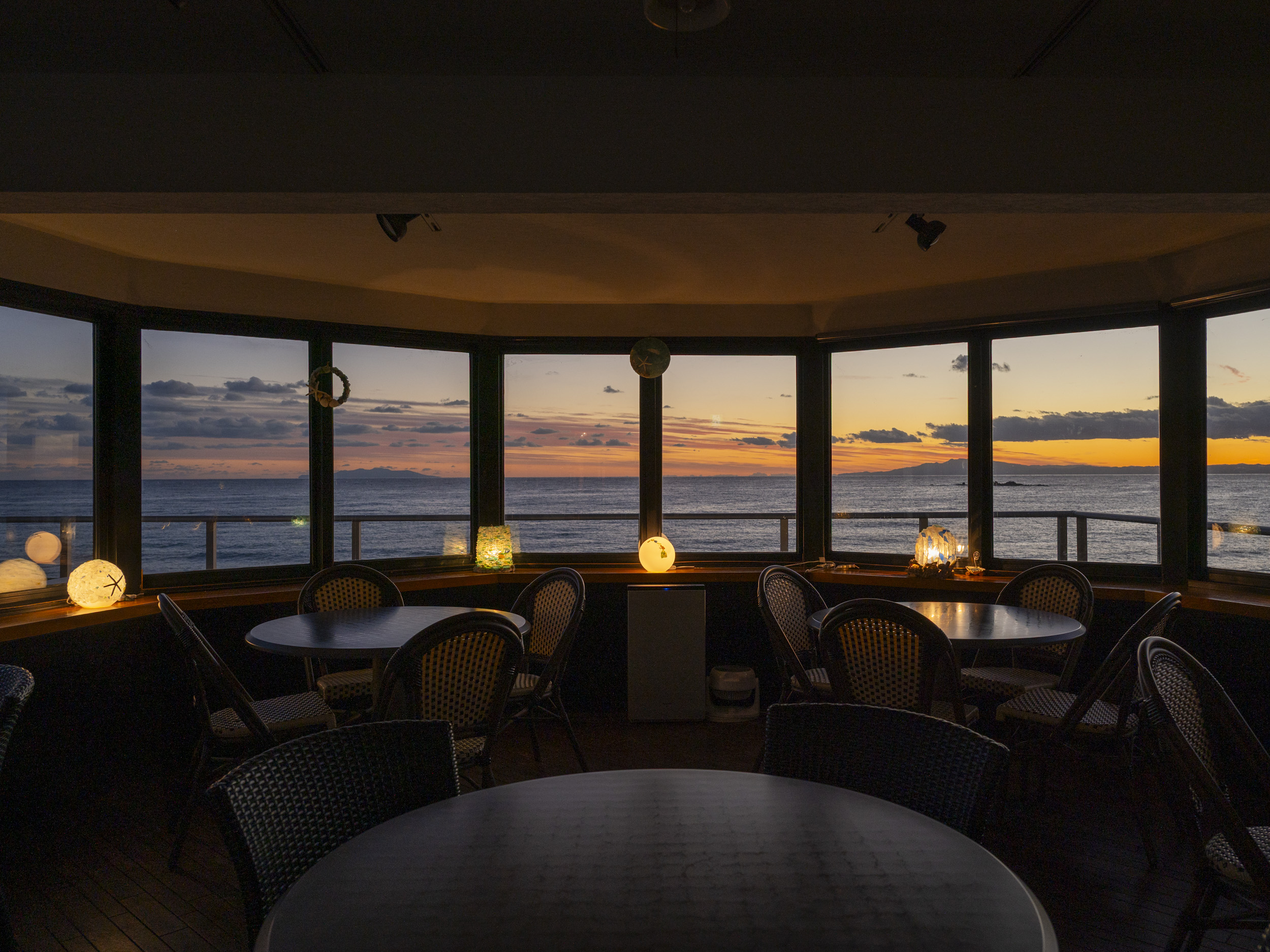 夕暮れ時。おいしいお料理とともに絶景とも言える美しい夕陽を眺めることができるのも、このお店ならでは。「海に沈む夕陽を楽しむお客さんが多いので、照明はシーグラスのテーブルランプですね。お店の天井照明はほとんど使いません」と、渡邉さん。