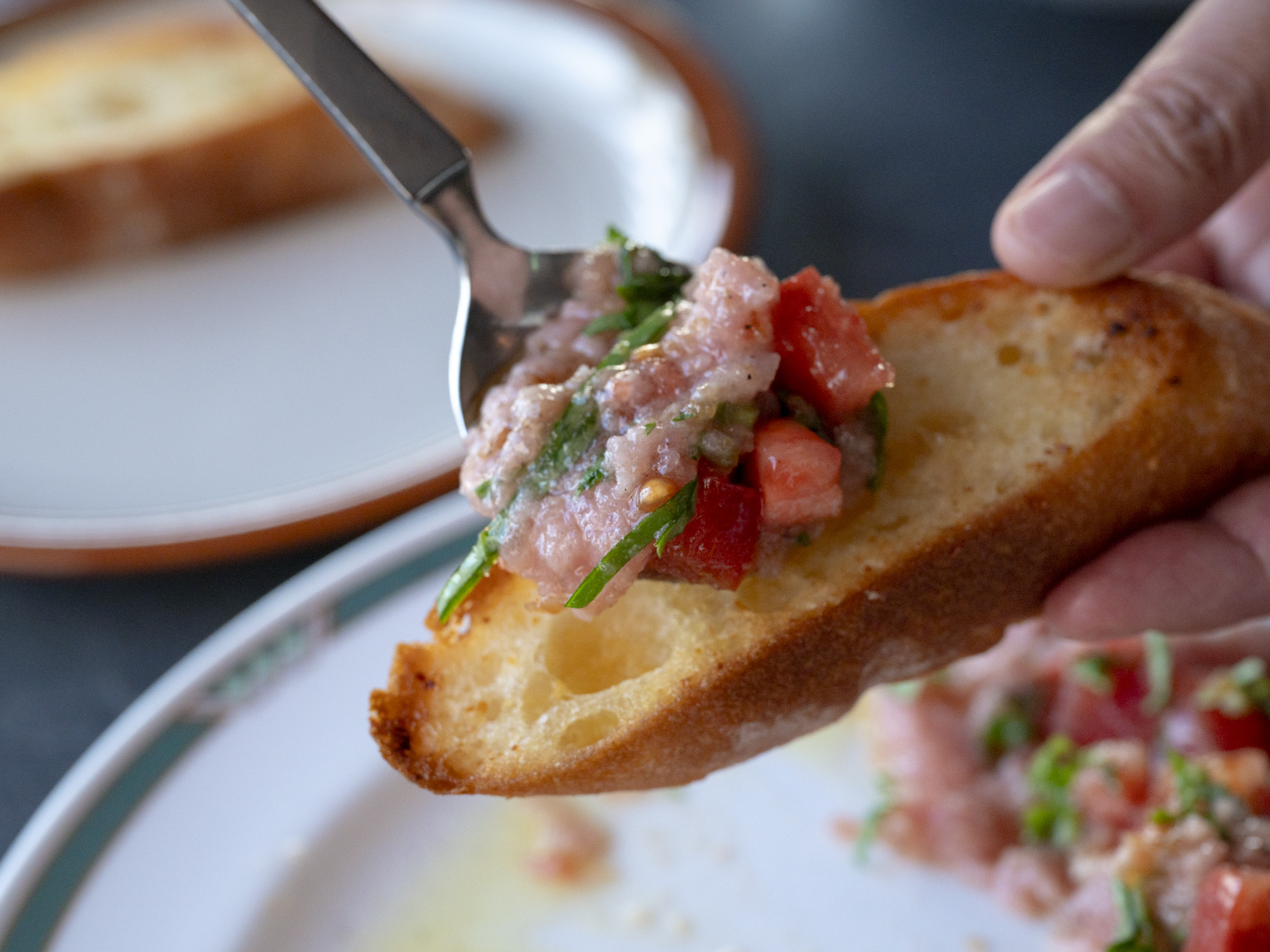 とくにマグロのたたきを「ガーリックトースト」(400円)に載せて食べるスタイルがオススメです。