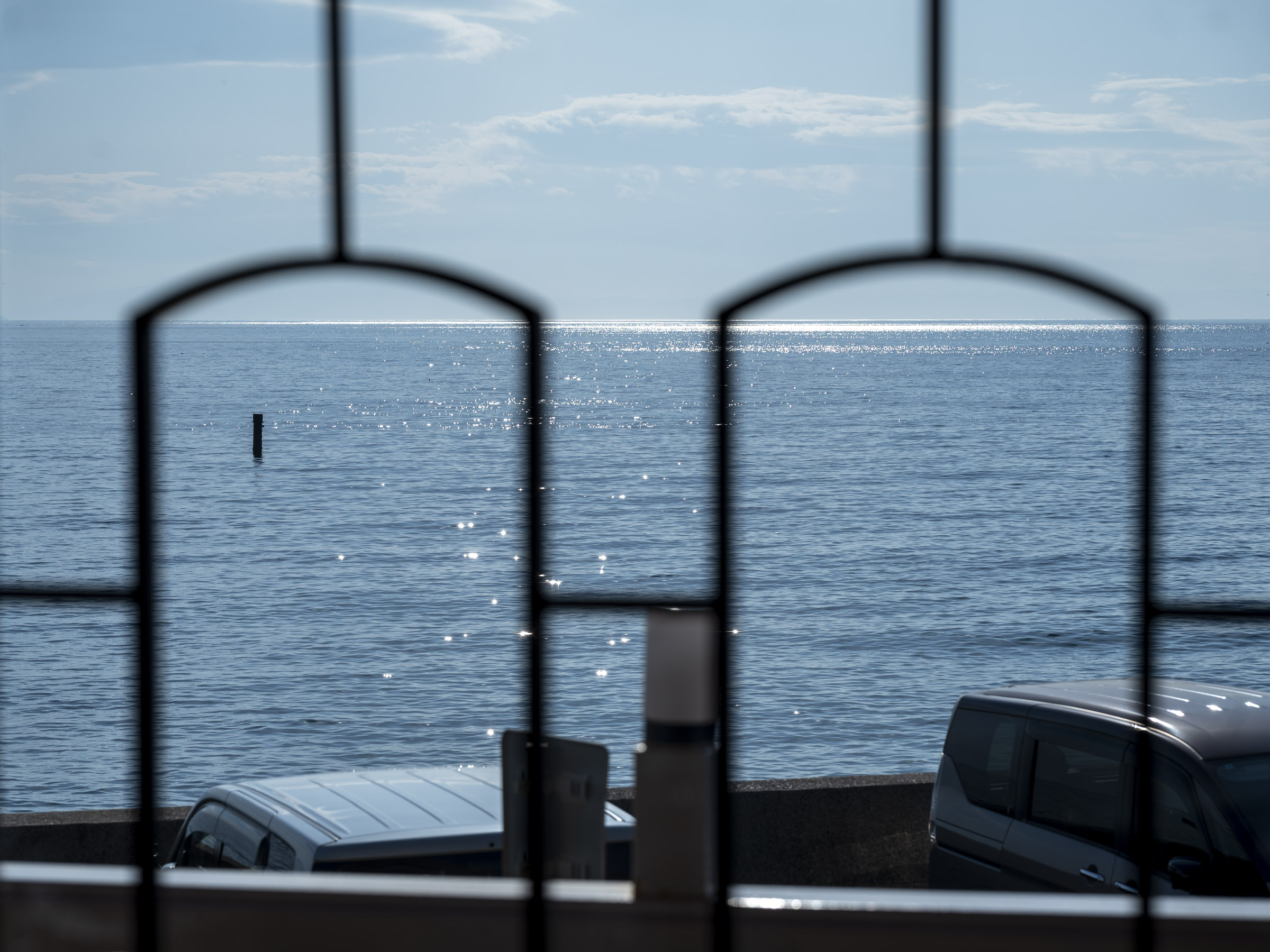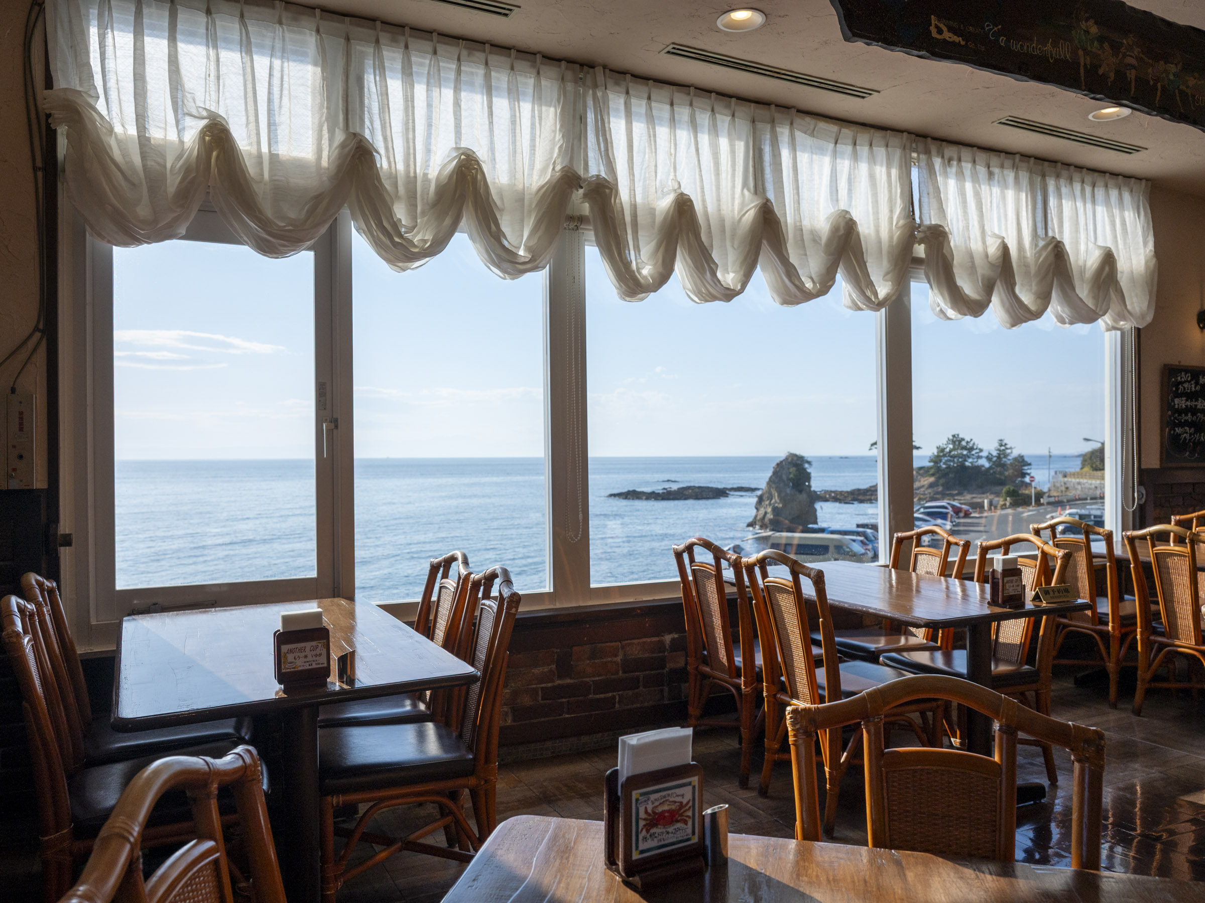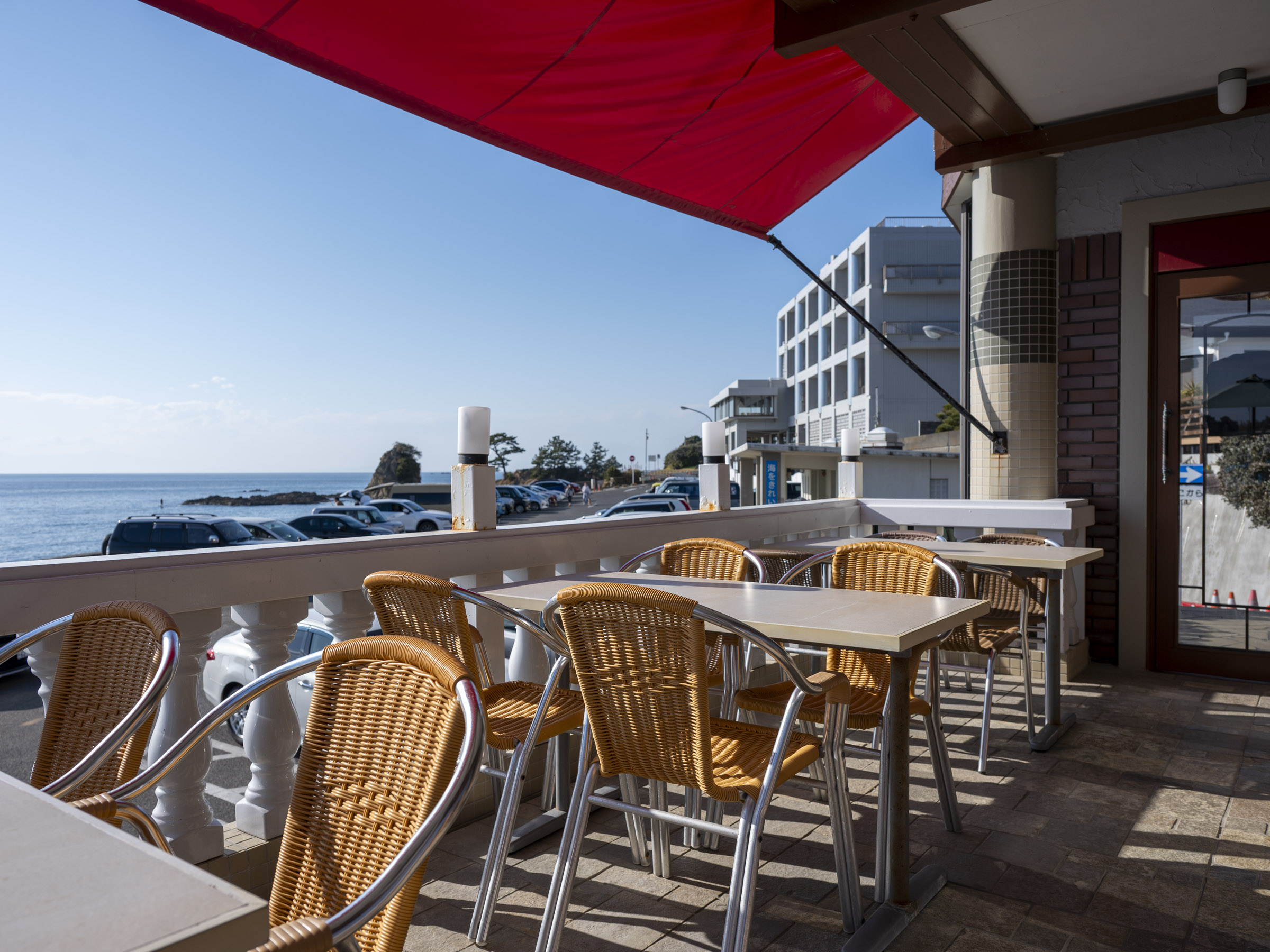 2階を取り仕切るフロア担当者は「自慢の景色です」と言い切ります。ご自身は三浦半島の東京湾側にお住まいとのこと。「立石海岸に来ると光が違いますよね。こちらは不思議と全体がキラキラしています」