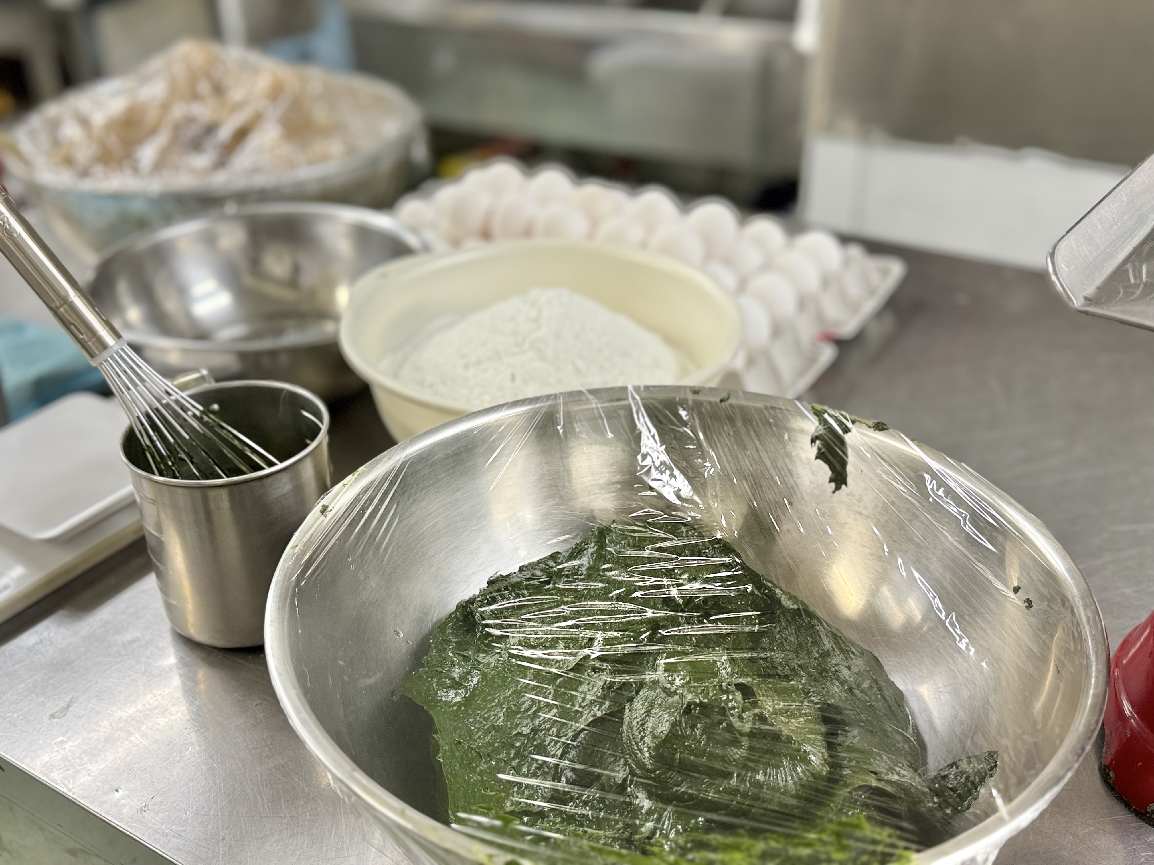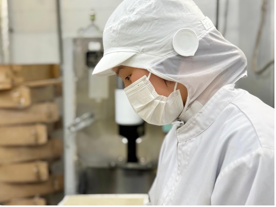 社長のこの一言が、開発の大きな転機となります。羊羹のように切り分けて食べる竿菓子という形。その発想により、「桃山」という枠を超え、まったく新しいお菓子へと進化していきました。最大の課題は、あのしっとりとした食感。特に冬場は、生地が締まりやすく、水分量の調整が非常に難しいといいます。水が多すぎれば崩れ、少なすぎれば硬くなる。気温や湿度、生地の状態と向き合いながら、微調整を重ねる日々。味わうなめらかさは、職人の感覚と手仕事によって支えられています。