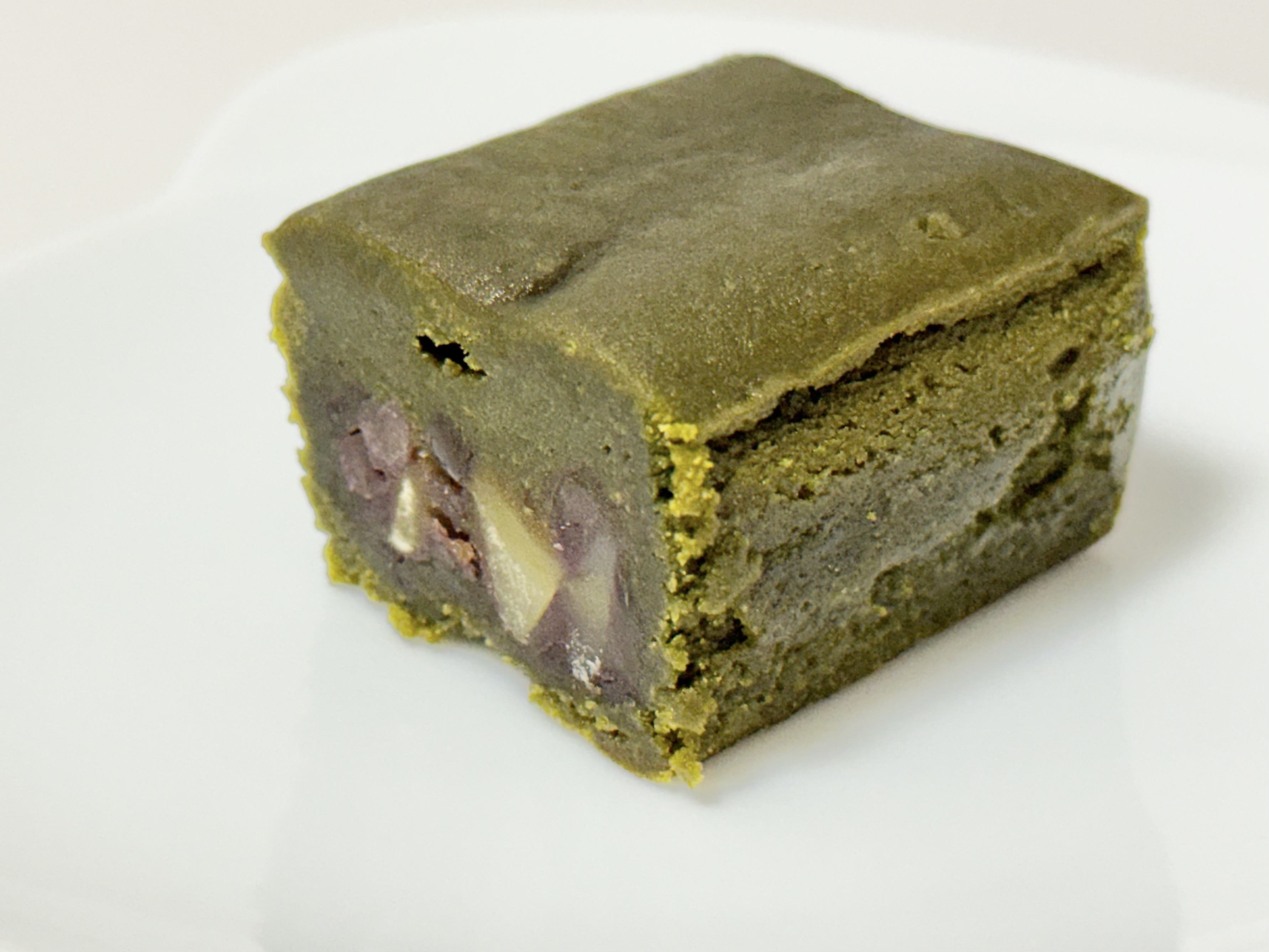 和菓子でありながら、まるで上質なテリーヌのよう。舌の上でほどける、なめらかでやわらかな食感です。抹茶味には、京都・山政小山園の抹茶「菓福」を使用。白あんの生地の中には、自家製あんと栗を合わせた中餡が忍ばせてあり、抹茶のほろ苦さと上品な甘みが、静かに重なります。