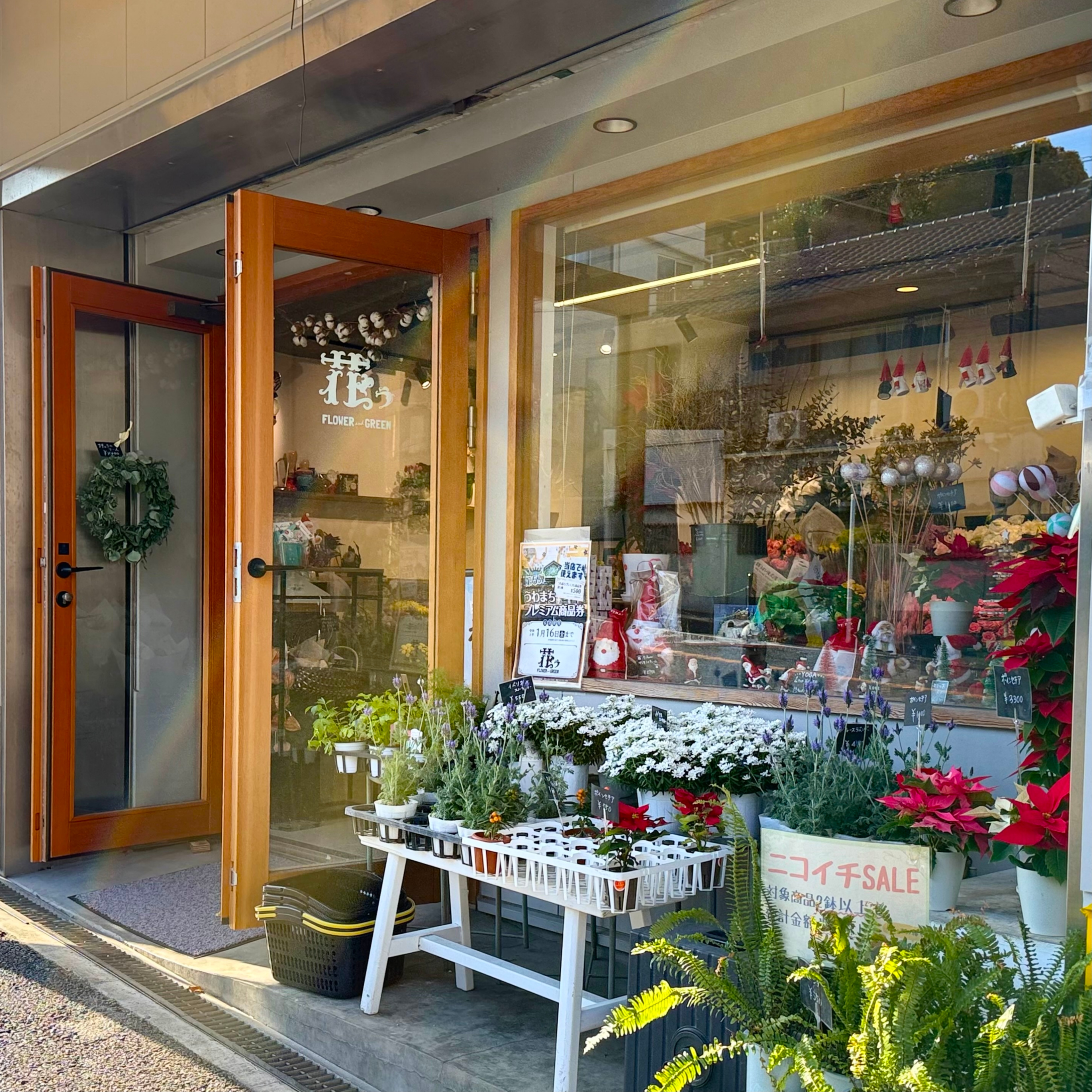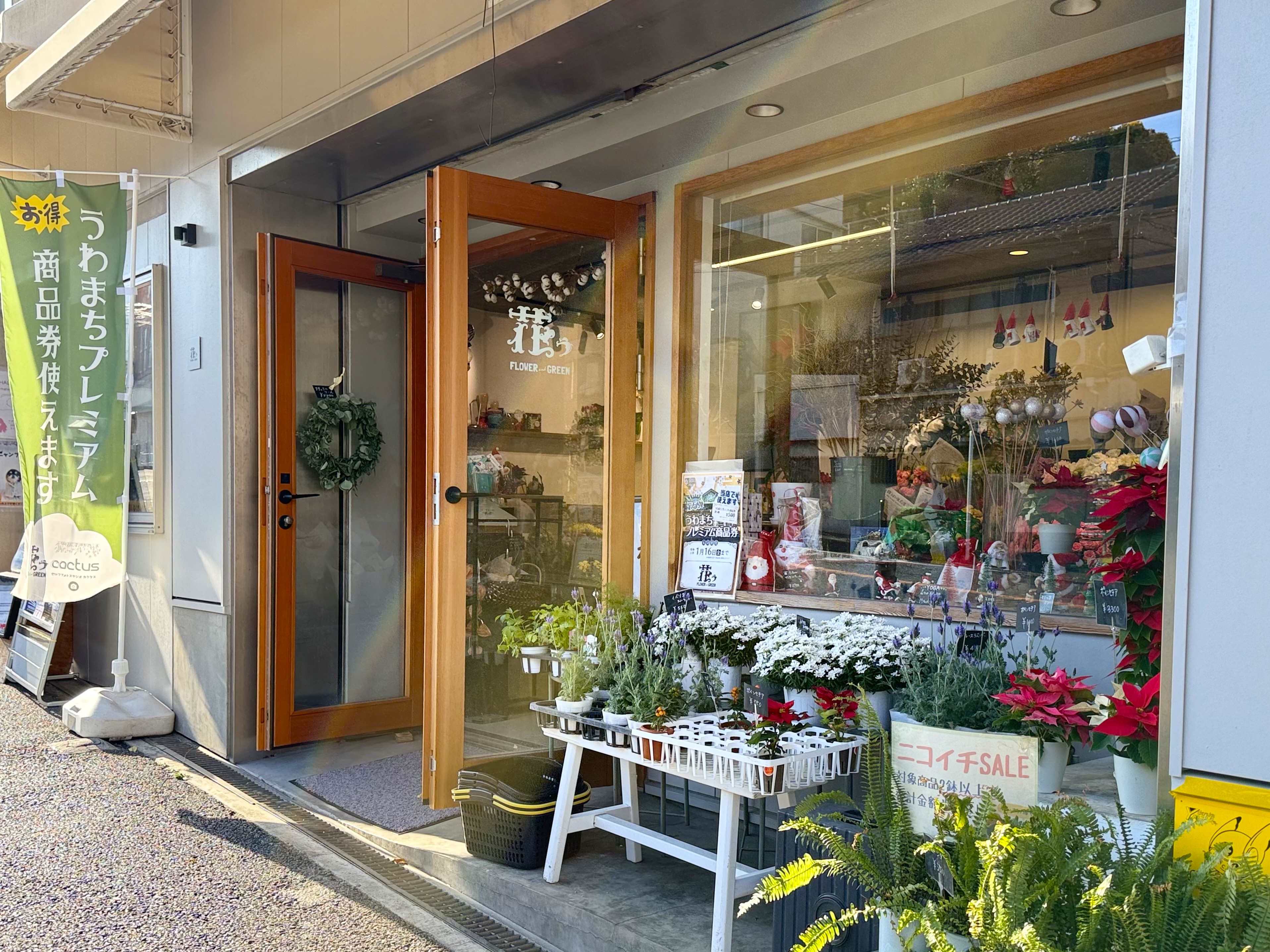 自宅の食卓にそっと飾りたい一輪の切り花や大切な節目に贈りたい、特別な日のためのアレンジメントなど、「花う」が提案する花のかたちは、どこまでも自由で、贈る人の気持ちにやさしく寄り添ってくれます。四季折々の花に加え、ハロウィンやクリスマス、お正月など、季節の行事に合わせたアレンジメントも人気のひとつ。訪れるたびに、違う表情の花に出会えること。その小さなときめきが、暮らしに心地よい彩りを添えてくれます。