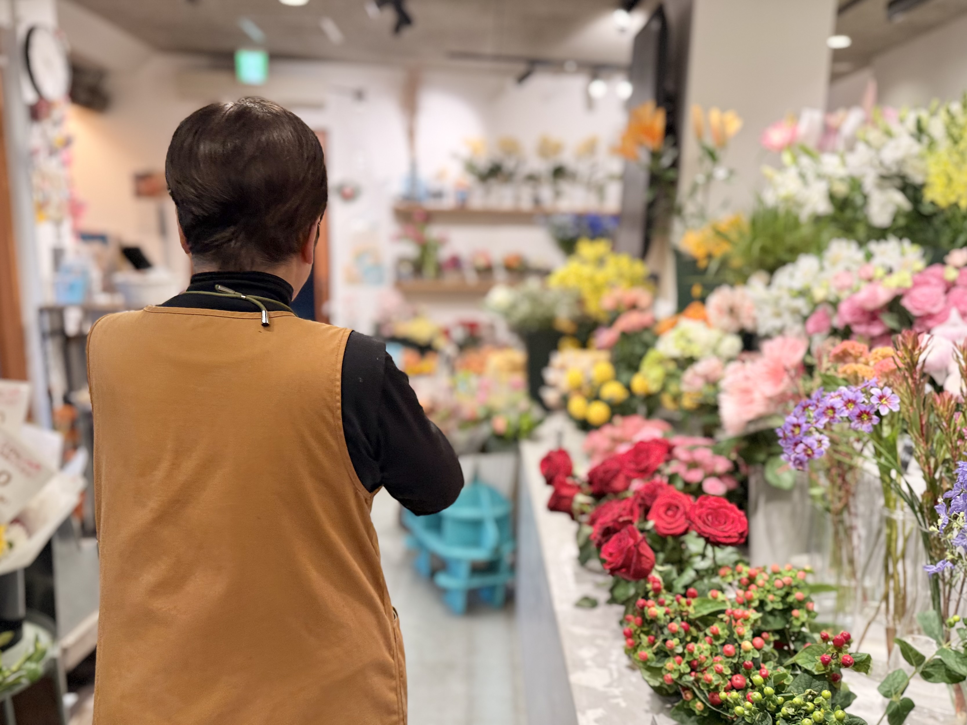 しかし、その根底にあるのは、地元の人々に寄り添う「やさしさ」です。店内は完全バリアフリー設計で通路も広く、ベビーカーのお母さんも、押し車を使うお年寄りも、車椅子の方も、無理なくそのまま入ることができます。「花屋さんは、外で待たされることが多いでしょう。うちは、中で座って、ゆっくり待ってほしいです」その言葉通り、店内には、花が仕上がるのを待ちながらおしゃべりを楽しむ人や、静かに花を眺める人の姿がありました。ここには、慌ただしい毎日を、忘れさせてくれる穏やかな時間が流れています。
