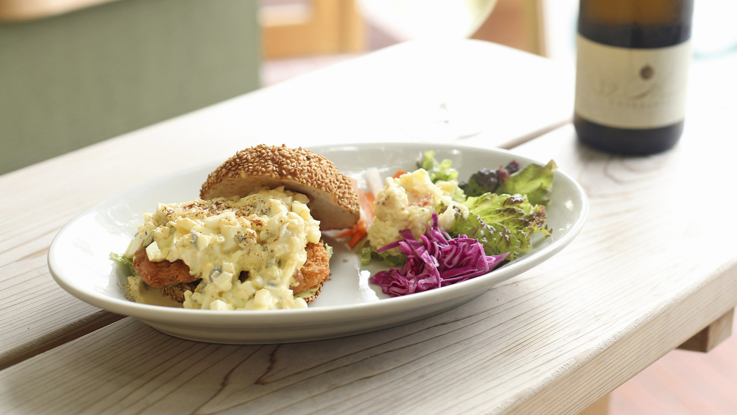 「バンズといえば上にちょこんとゴマがついているものが多いですが、ゴマが上にも下にもしっかりとついているものを使っています」と、考案者の土屋由美さん。軽い食感で香ばしく、白ワインとの相性抜群です。