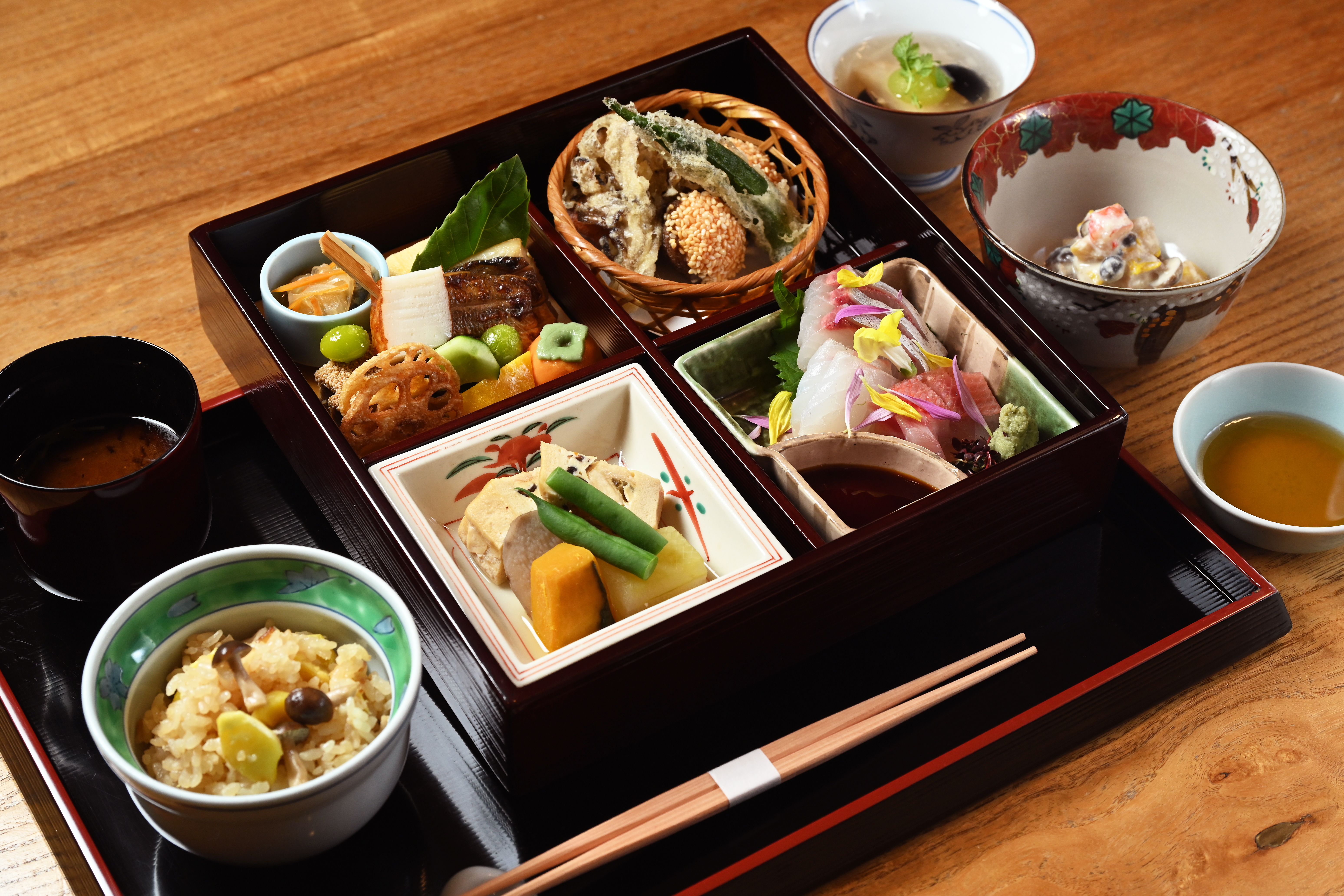 名物の「鯛茶漬け」で知られる同店ですが、旬の味覚を詰め込んだお昼限定の「ひかげ弁当」5,500円もファンの多いもう一つの人気メニュー。