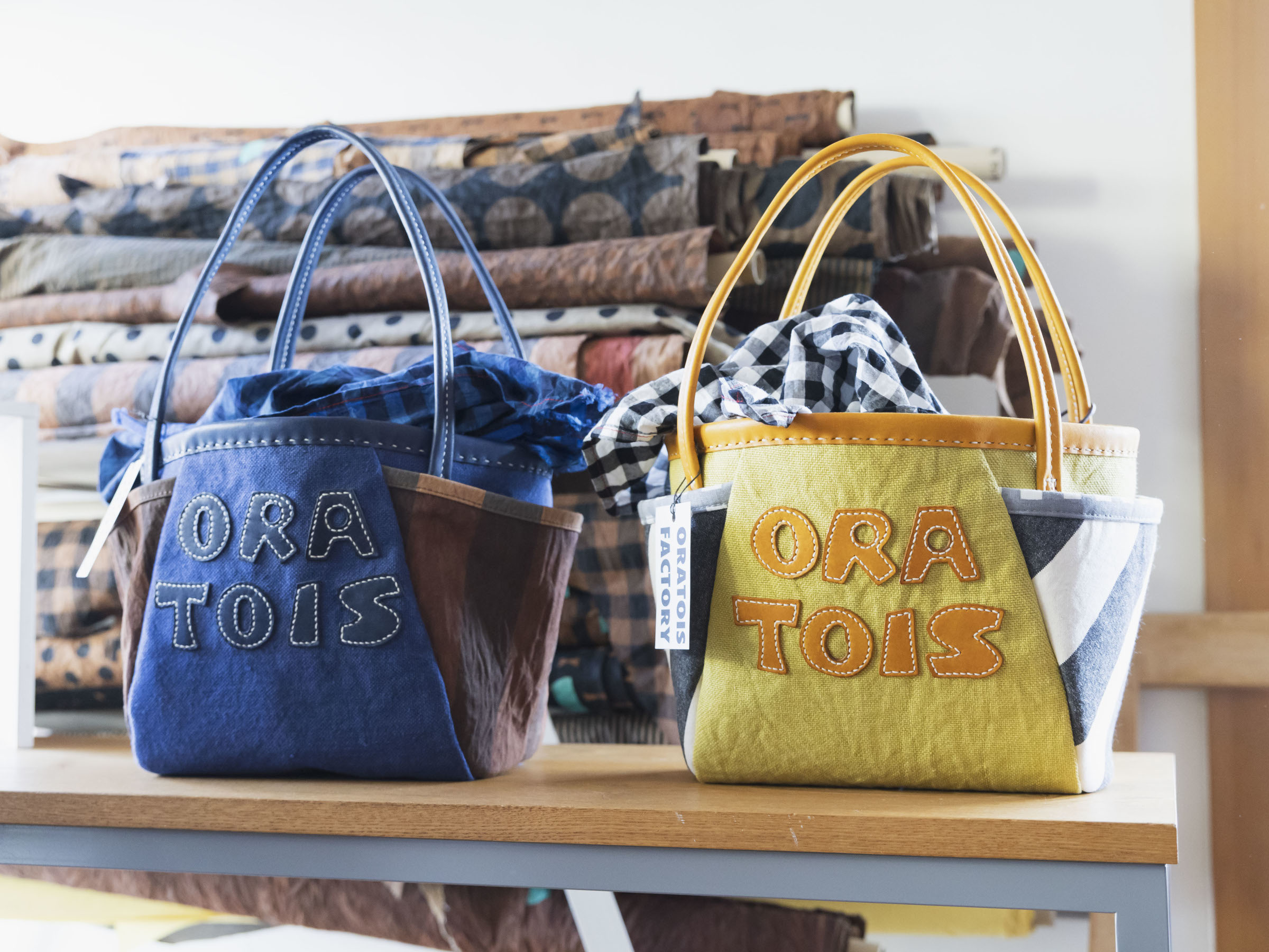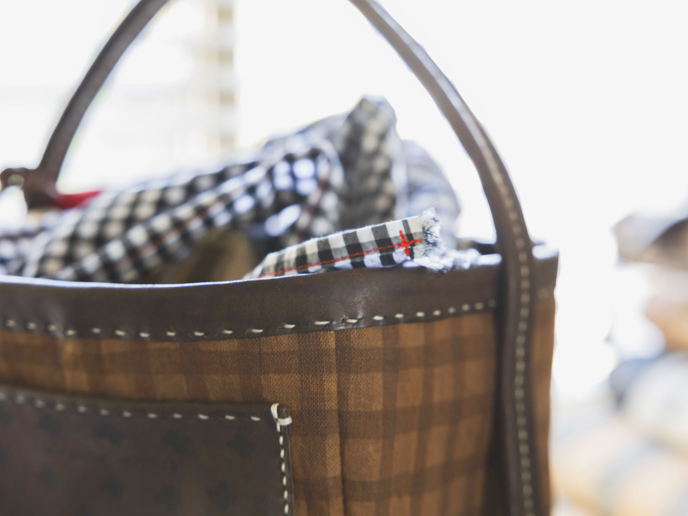 塩崎さんは、外から見えないところにも遊び心を散りばめています。例えば内側の生地がパッチワーク風になっていたり、バッグの奥の一部分だけカラーステッチが入っていたり。お客さまがふと気づいたときの小さな驚きは、作品への愛着を深めていくきっかけになります。