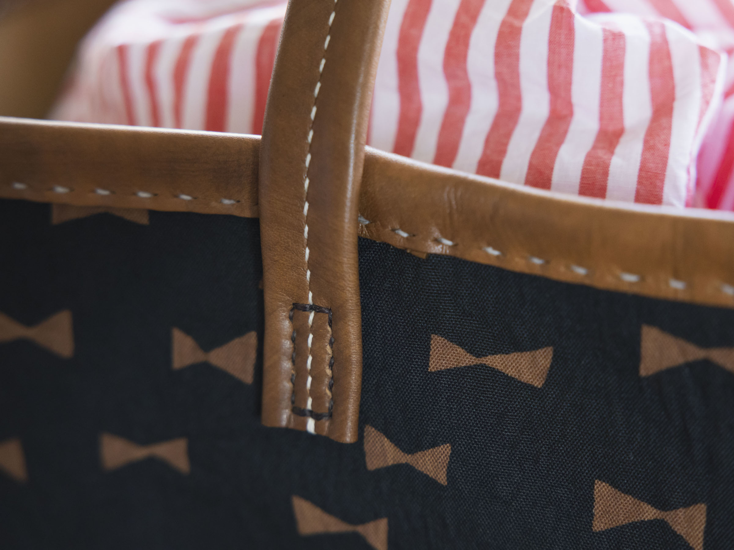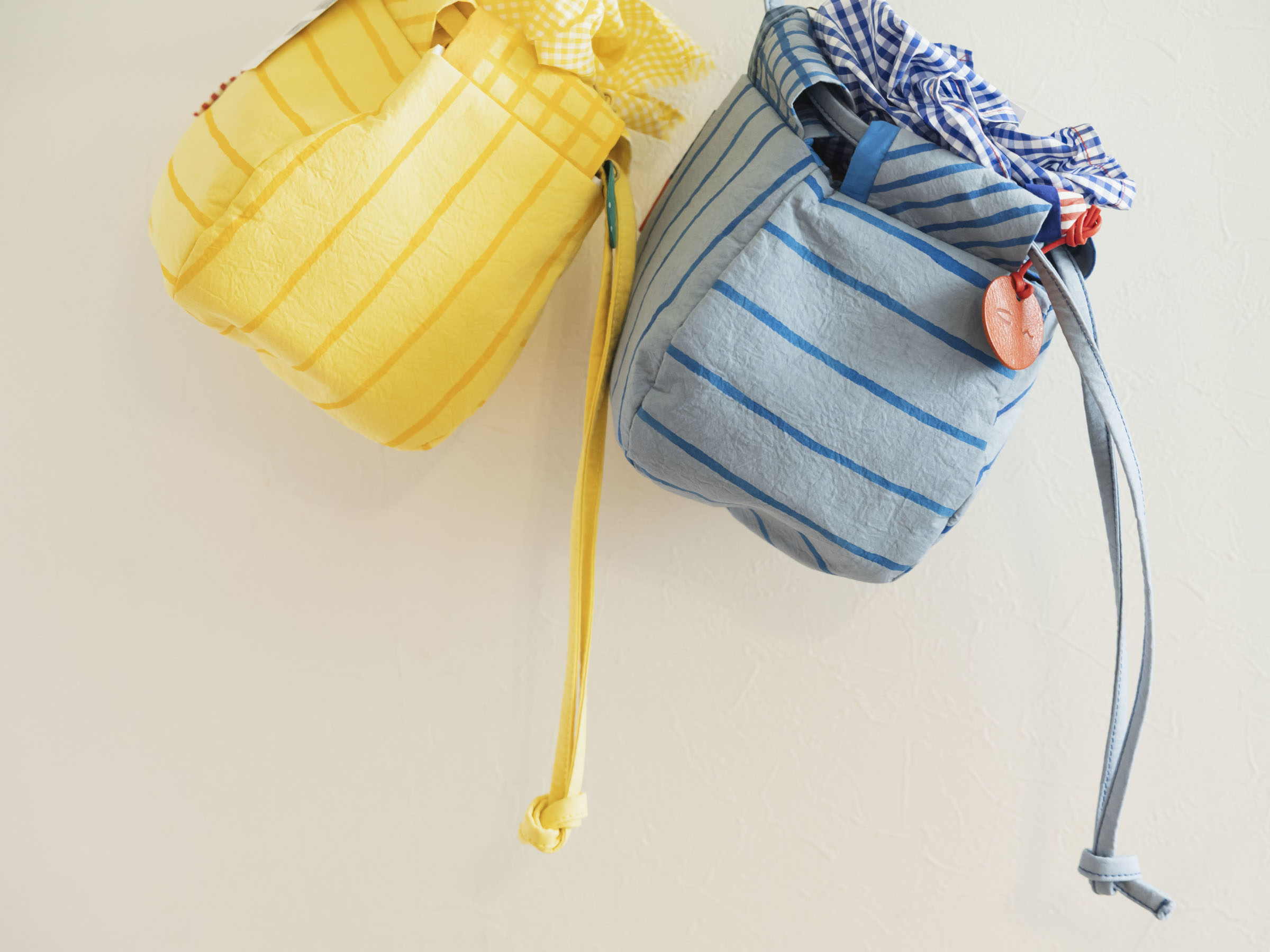 バッグを手に取ってみると、表生地、持ち手、内布、巾着の紐に至るまで、すべて異なる生地が組み合わされていることに気づきます。そして、この複雑なバッグがすべて手縫いという点も驚きです。